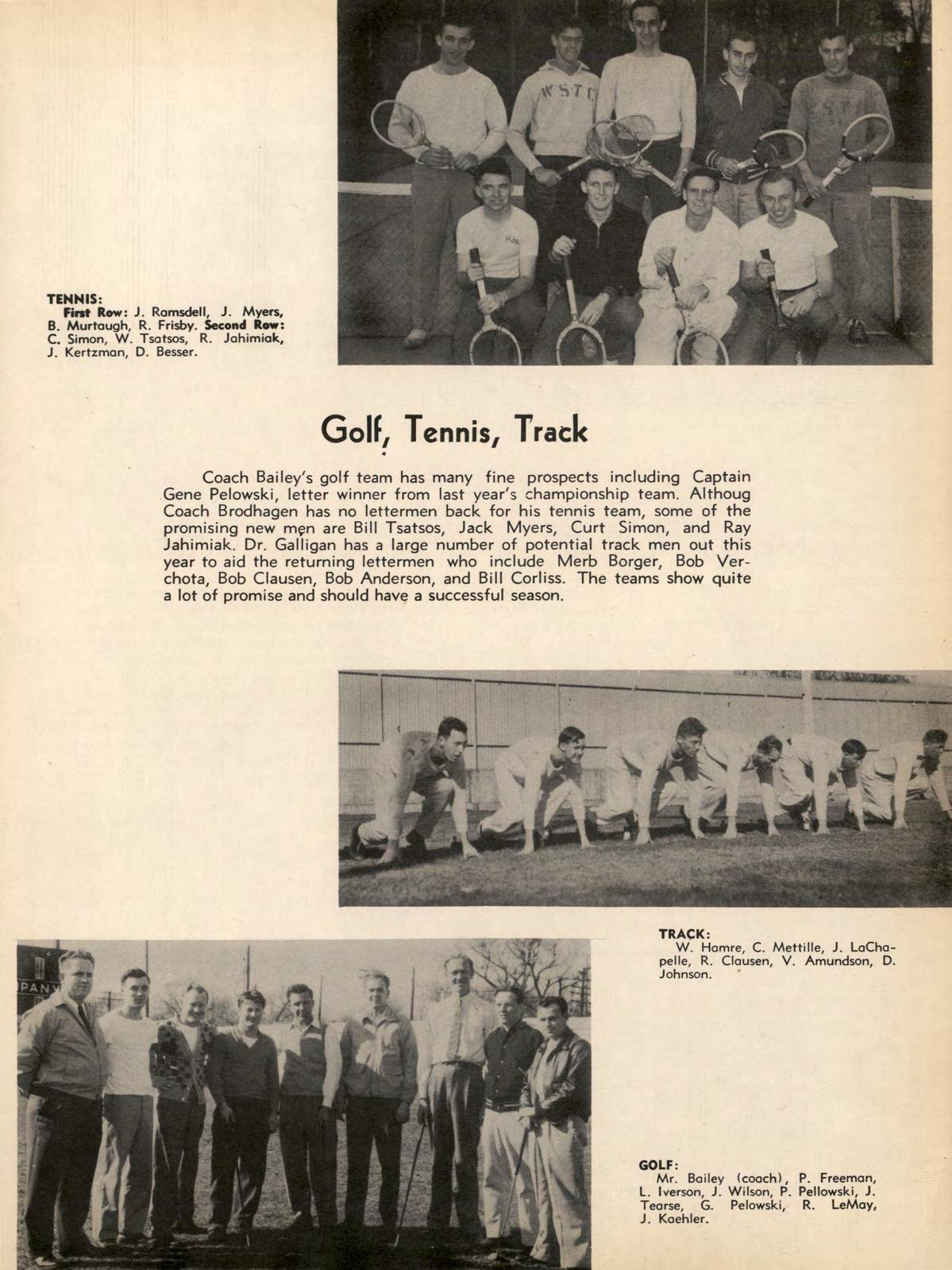 Coach Bailey's golf team has many fine prospects including Captain Gene Pelowski, letter winner from last year's championship team. Althoug Coach Brodhagen has no lettermen back for his tennis team, some of the promising new mçn are Bill Tsatsos, Jack Myers, Curt Simon, and Ray Jahimiak. Dr. Galligan has a large number of potential track men out this year to aid the returning lettermen who include Merb Borger, Bob Verchota. Bob Clausen, Bob Anderson, and Bill Corliss. The teams show quite a lotof promise and should have a successful season.