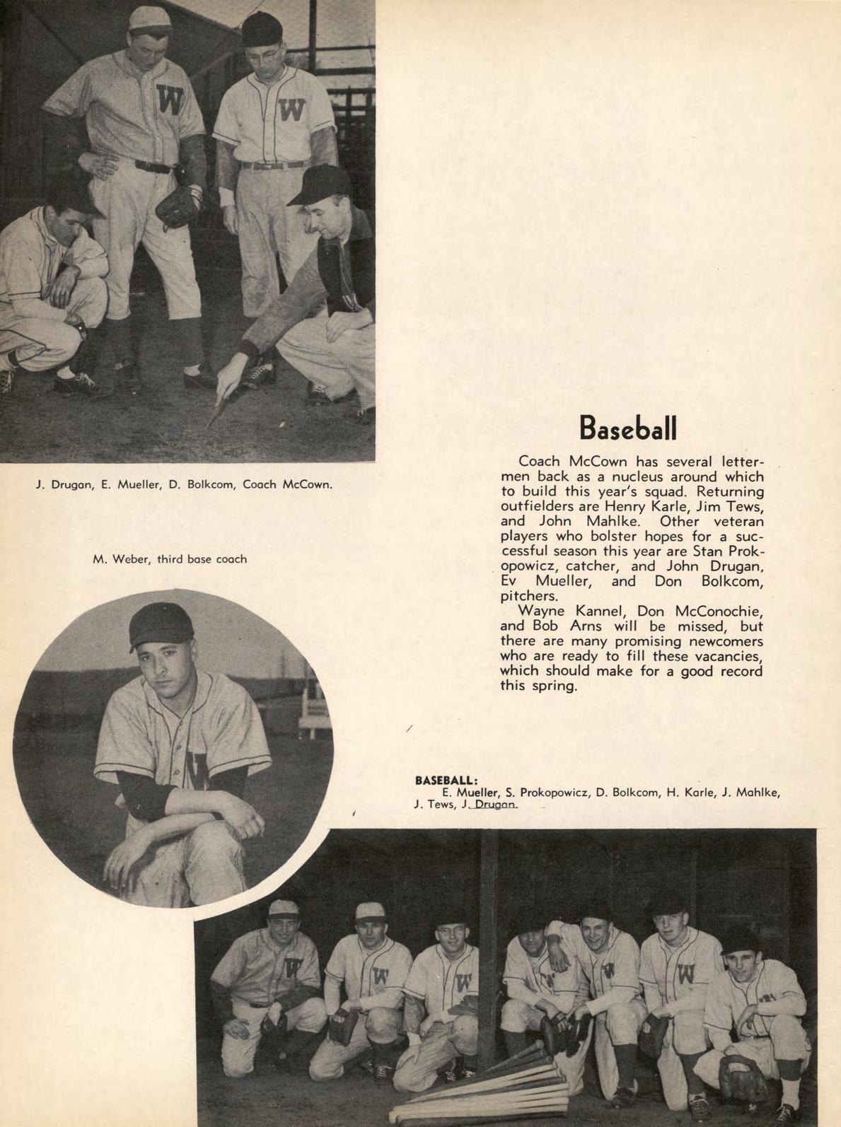 Coach McCown has several lettermen back as a nucleus around which to build this year's squad. Returning outfielders are Henry Karle, Jim Tews, and John Mahike. Other veteran players who bolster hopes for a suecessful season this year are Stan Prokopowicz, catcher, and John Drugan, Ev Mueller, and Don Bolkcom, pitchers.