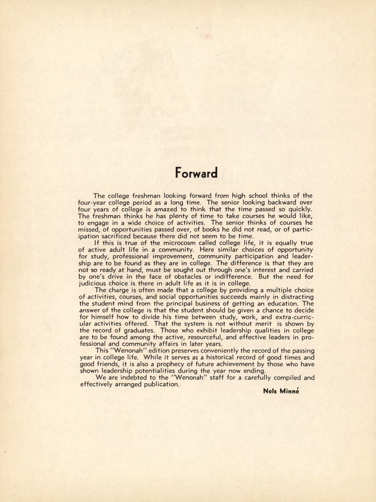 This "Wenonah" edition preserves conveniently the record of the passing year in college life. While it serves as a historical record of good times and good friends, it is also a prophecy of future achievement by those who have shown leadership potentialities during the year now ending.