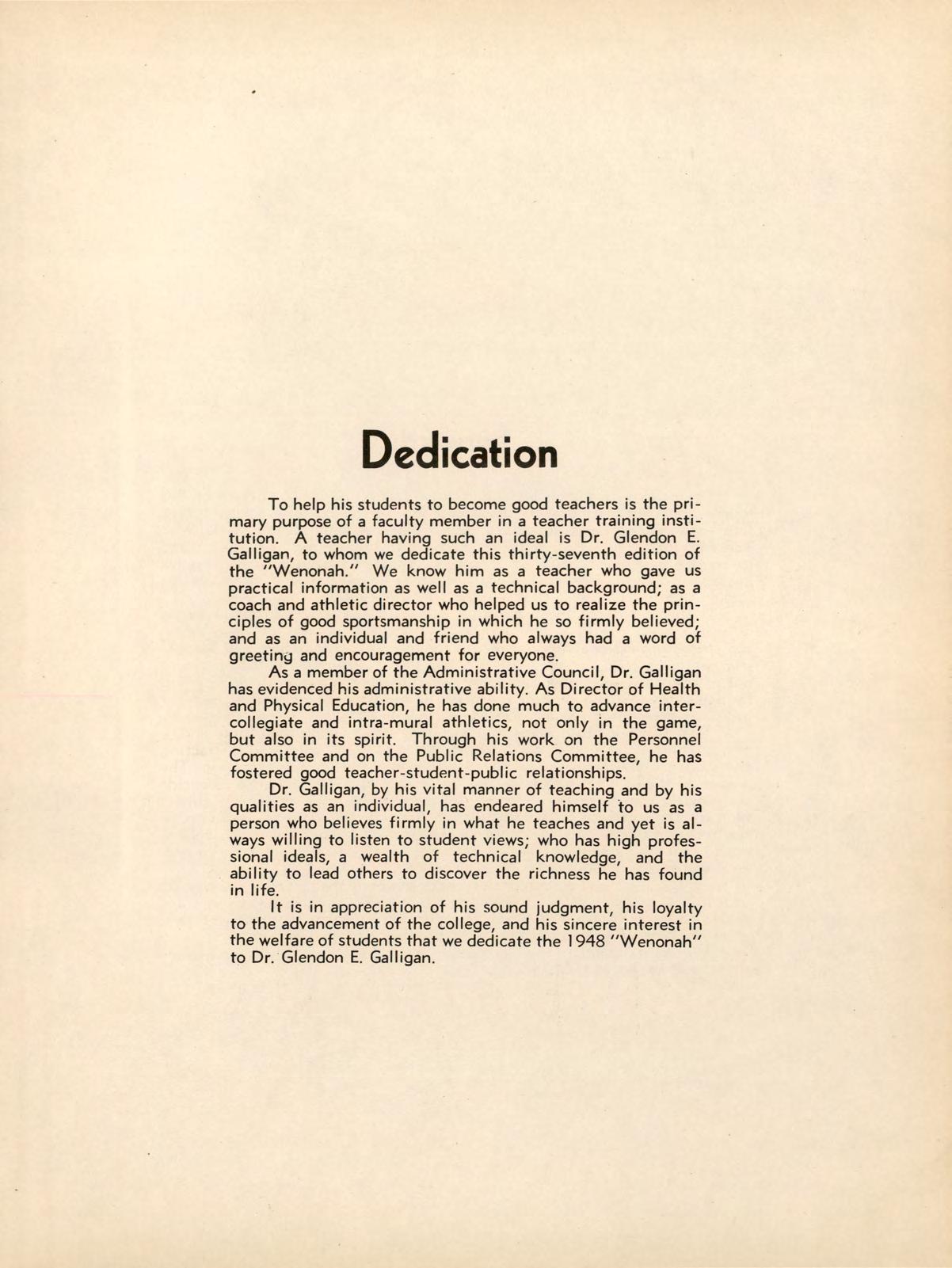 To help his students to become good teachers is the primary purpose of a faculty member in a teacher training institution. A teacher having such an ideal is Dr. Glendon E. Gal ligan, to whom we dedicate this thirty-seventh edition of the "Wenonah." We know him as a teacher who gave us practical information as well as a technical background; as a coach and athletic director who helped us to realize the principles of good sportsmanship in which he so firmly believed; and as an individual and friend who always had a word of greeting and encouragement for everyone.