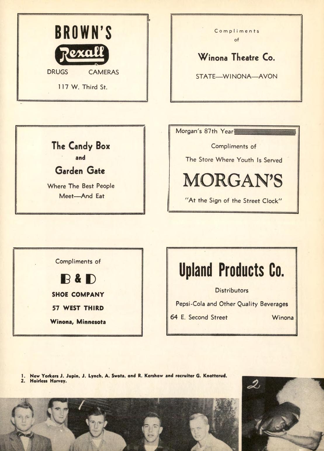 With "Kon-Ker Kato" as the slogan for T.C.'s twenty-sixth homecoming, students, faculty and alumni opened festivities on October 15 with a pepfest, at which Queen Mary Leonard was presented with her court—Gladys Asleson, Fern Thiele, Bonnie Utley, and Bernice Wadekamper. A snake dance to a giant bonfire at the practice field was led by the cheerleaders. The L.S.A. and Kappa Pi breakfasts and Wenonah Players and "W" club luncheons made it possible for alumni and present students to meet again. Following the game—which Winona lost to Mankato 7-0— open house prevailed at the dorms and lodges. At the Shepard Hall tea, Mrs. Harriet Taisey, oldest living graduate of the college, was present. A semi-formal dance, with music by Henry Burton, concluded the 1948 Homecoming activities.