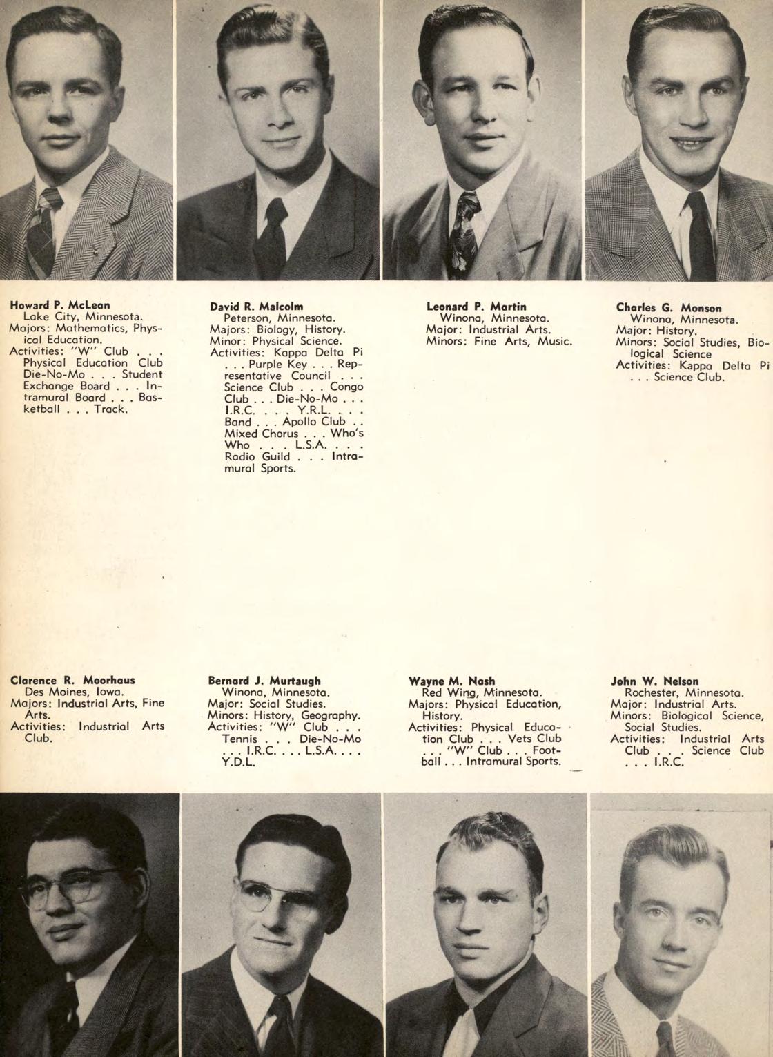 Keeping its members up to date on new developments and techniques in physical education is a major purpose of the Men's P.E. Club. An experiment carried on by the club for the past two years with the McCloy Achievement Tests in choosing intramural basketball teams proved highly successful. Members of theclub are majors and minors in the men's physical education department. The officers were Howard McLean, president; Darold King, vice-president; and Donald Bolkcom, secretary-treasurer. Advisers were Mr. L. A. MeCown and Mr, E. N. Brodhagen.
