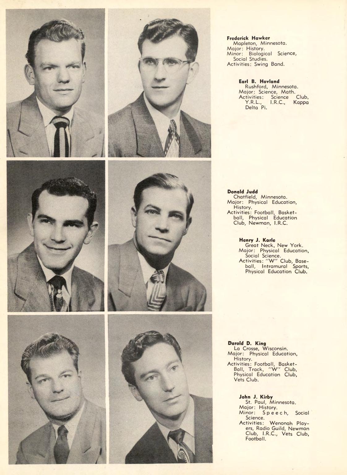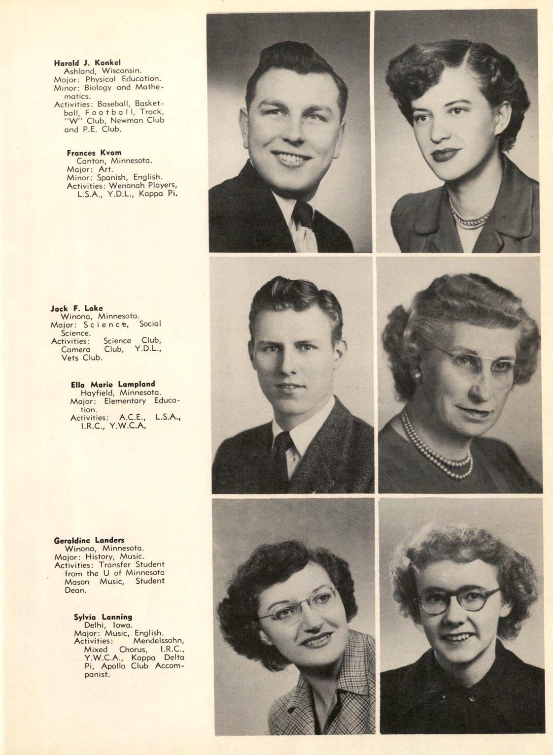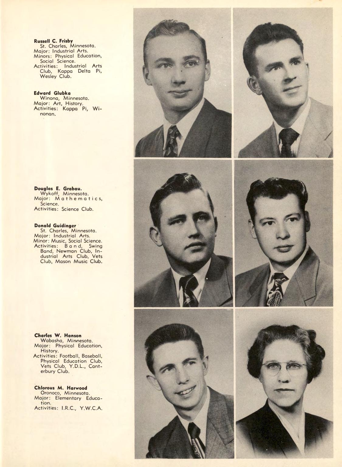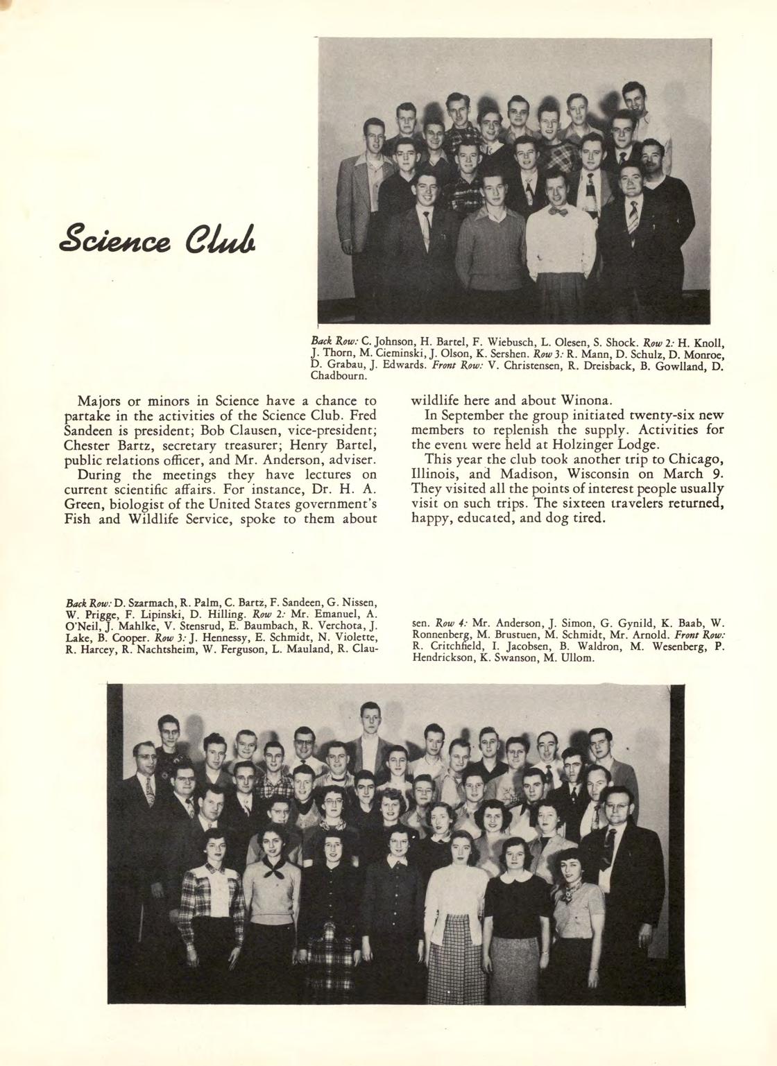 This group has one of the largest memberships in the college 103 at thelast count. After holding its initial picnic at Holsinger Lodge, September 29, the club has held successive meetings through out the year which promote the purpose of the club guest speakers told of conditions in Germany, Spain, and Switzerland Miss Murray rounded out the whole continental review by relating experiences of her trip to Europe Combined meetings with St. Marys and St. Theresa helped to unify the three colleges in Winona Eight members of the club attended the Regional Conference in Minneapolis in December, where Jim Sorflaten was elected vice-president of the Regional Conference. The club sponsored a successful campaign for funds for books for over-seas students Several members attended the National conference in Ann Arbor, Michigan Officers of this friendly group are president, Lester Wagner; vice-president, Edward Dornack; Secretary-Treasurer, Gloria Gynild; and Program Committee, Jim Sorflaten an^d Dorothy Vehrenkamp.
