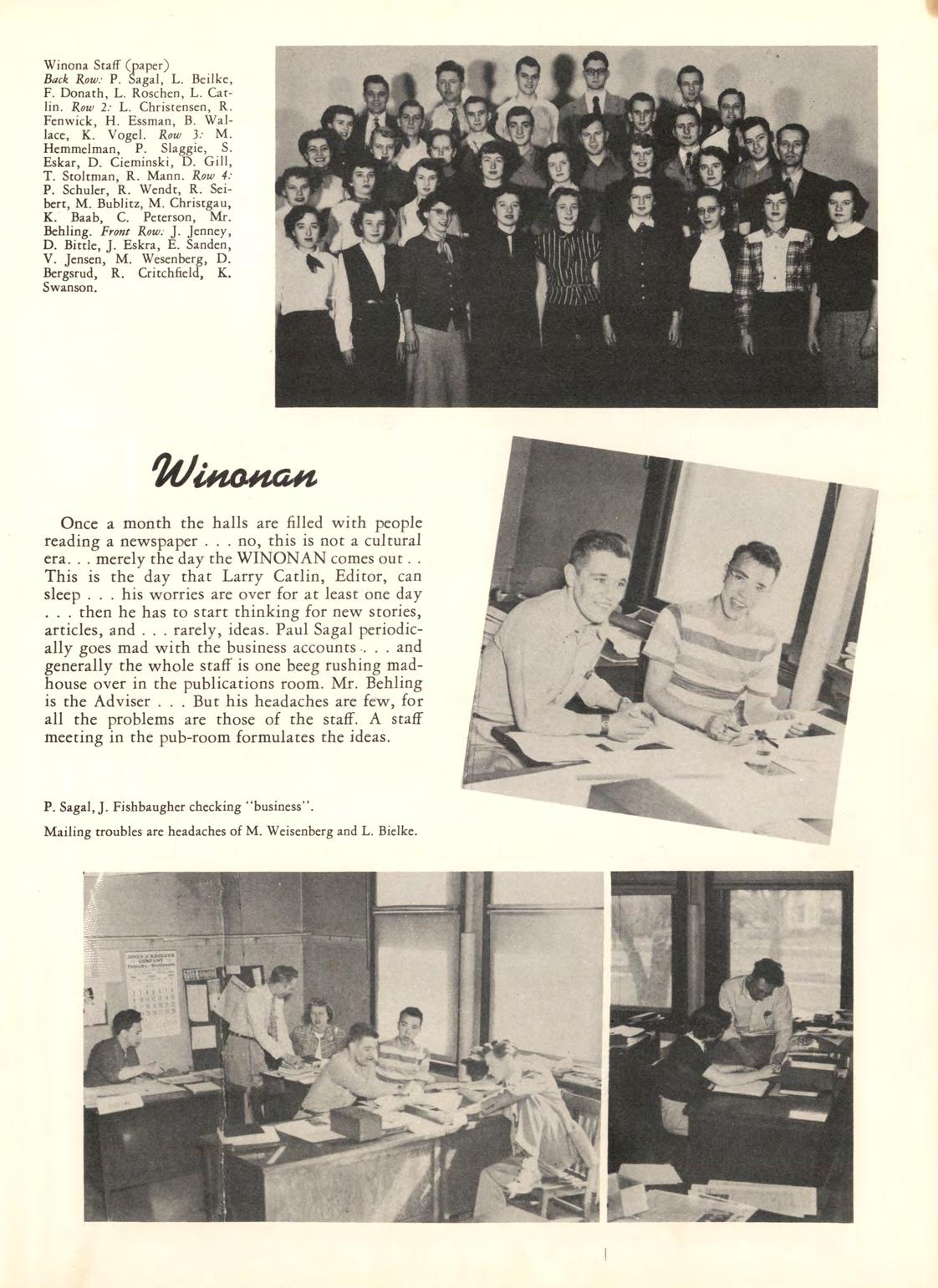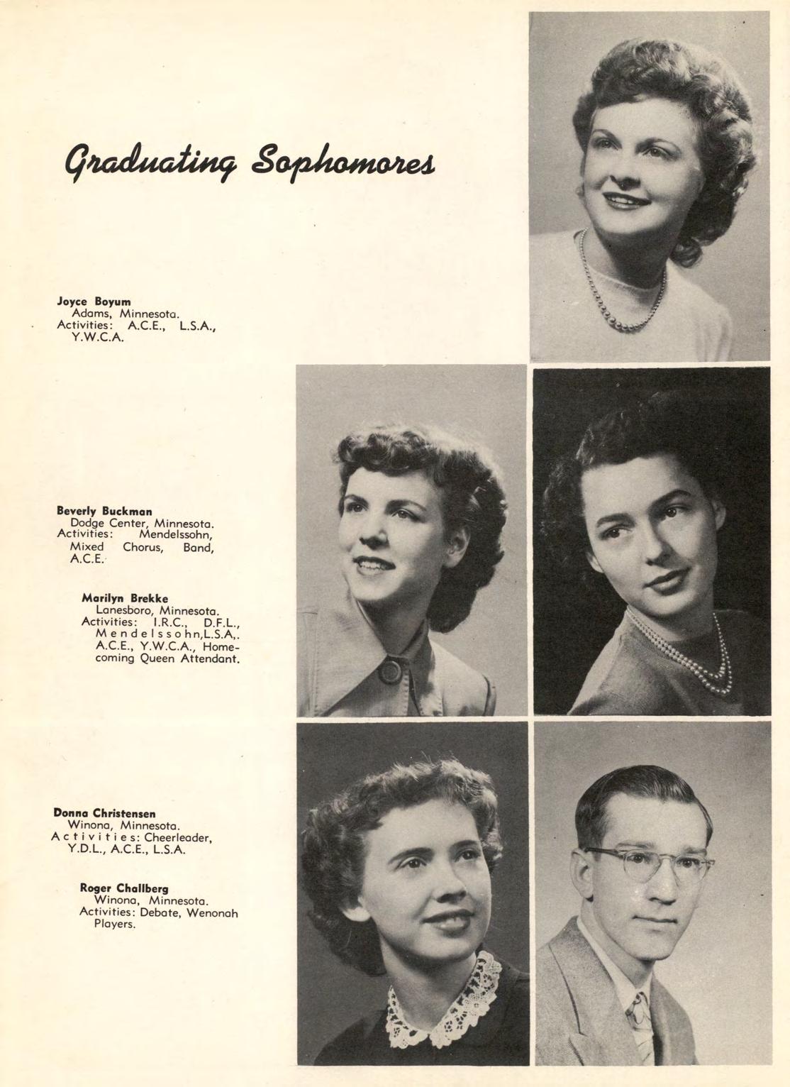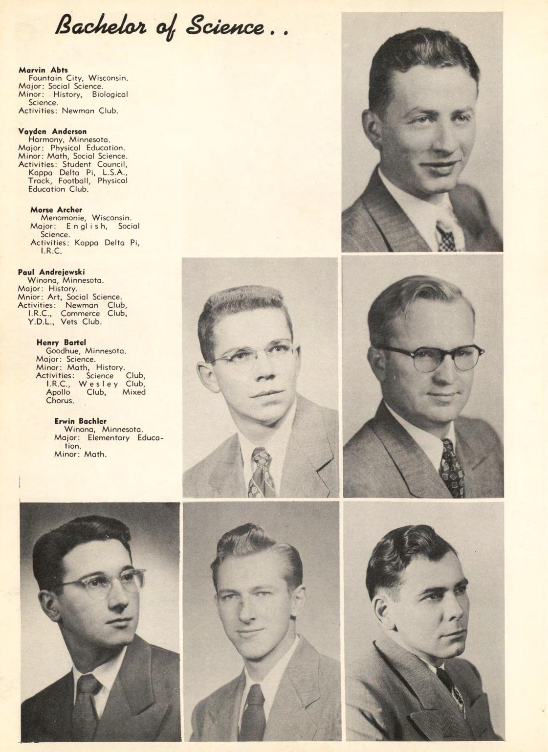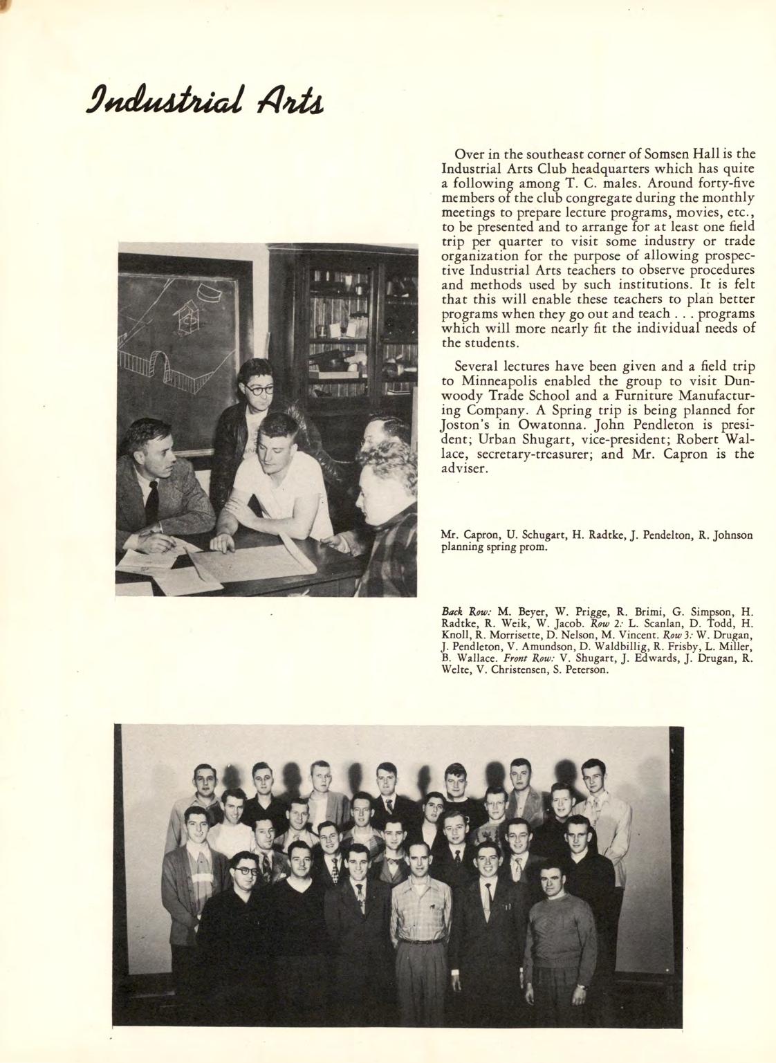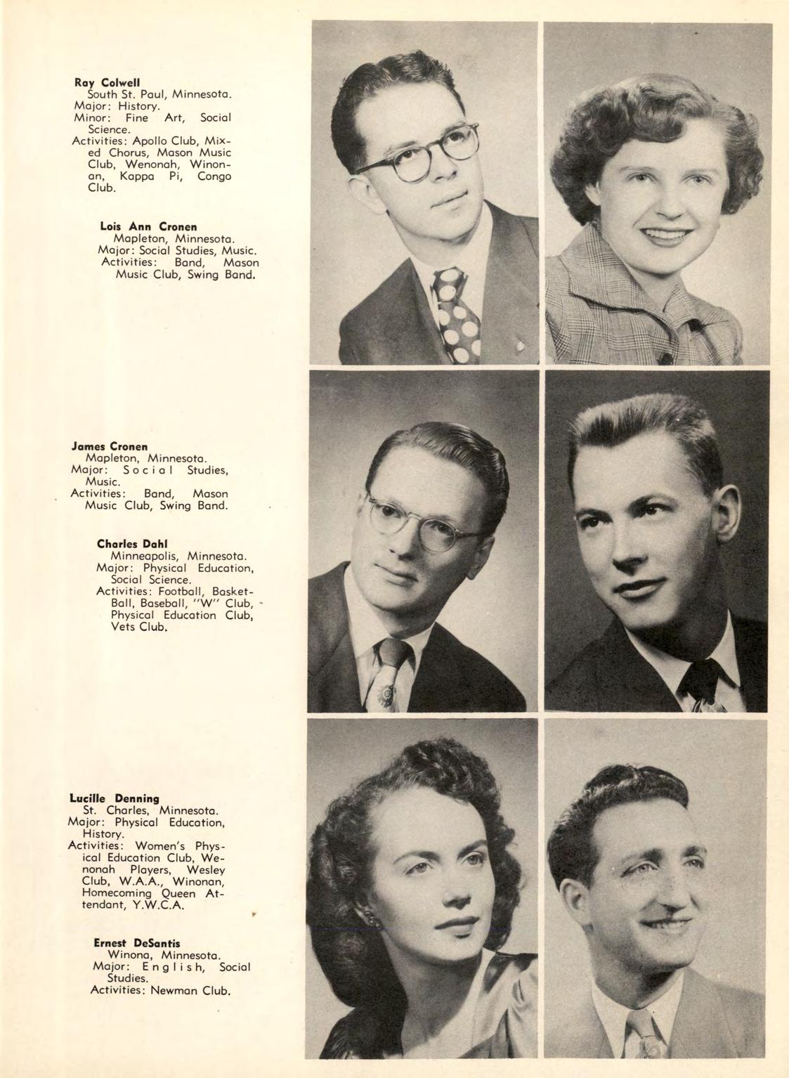 This group has one of the largest memberships in the college 103 at thelast count. After holding its initial picnic at Holsinger Lodge, September 29, the club has held successive meetings through out the year which promote the purpose of the club guest speakers told of conditions in Germany, Spain, and Switzerland Miss Murray rounded out the whole continental review by relating experiences of her trip to Europe Combined meetings with St. Marys and St. Theresa helped to unify the three colleges in Winona Eight members of the club attended the Regional Conference in Minneapolis in December, where Jim Sorflaten was elected vice-president of the Regional Conference. The club sponsored a successful campaign for funds for books for over-seas students Several members attended the National conference in Ann Arbor, Michigan Officers of this friendly group are president, Lester Wagner; vice-president, Edward Dornack; Secretary-Treasurer, Gloria Gynild; and Program Committee, Jim Sorflaten an^d Dorothy Vehrenkamp.