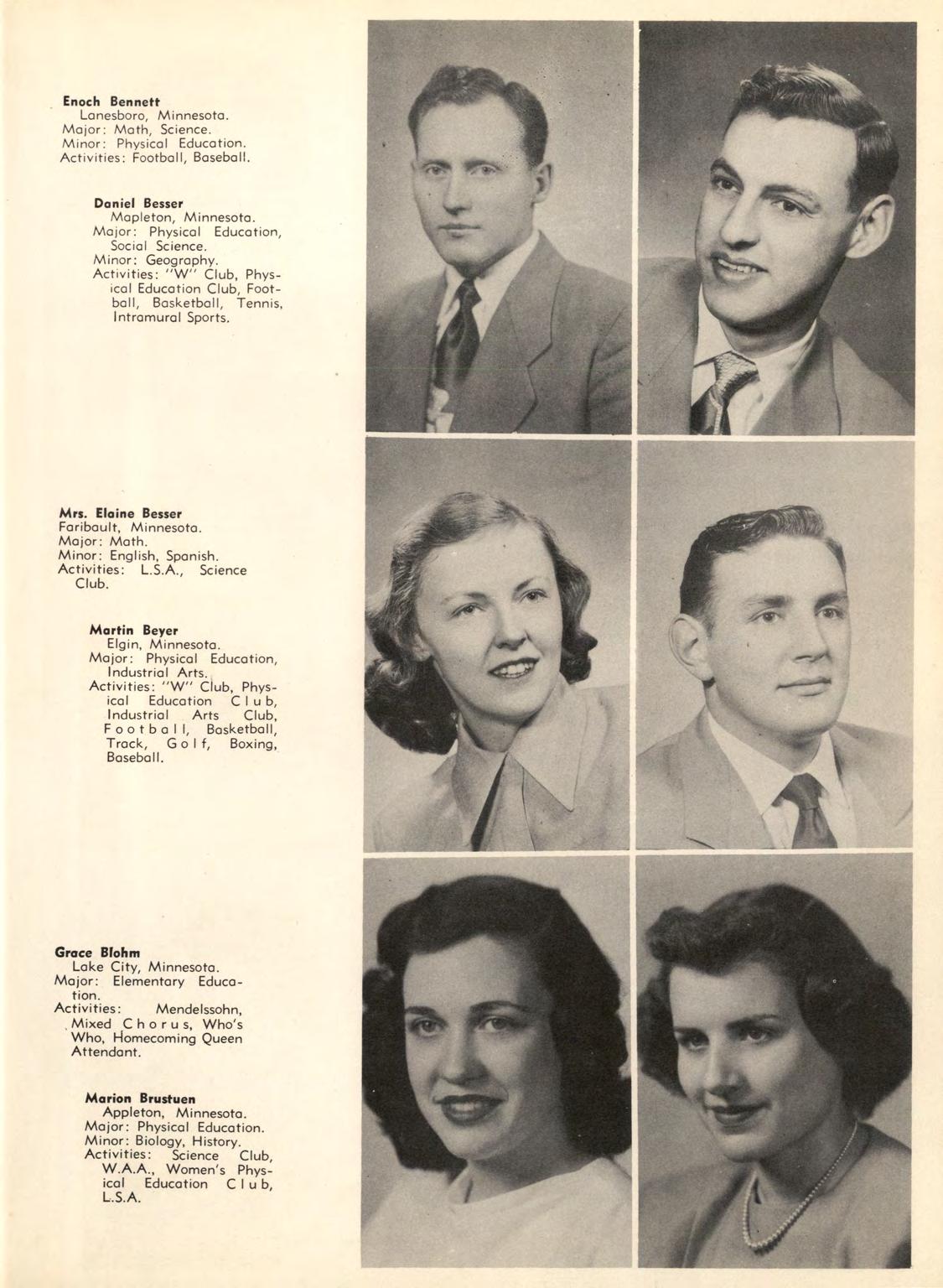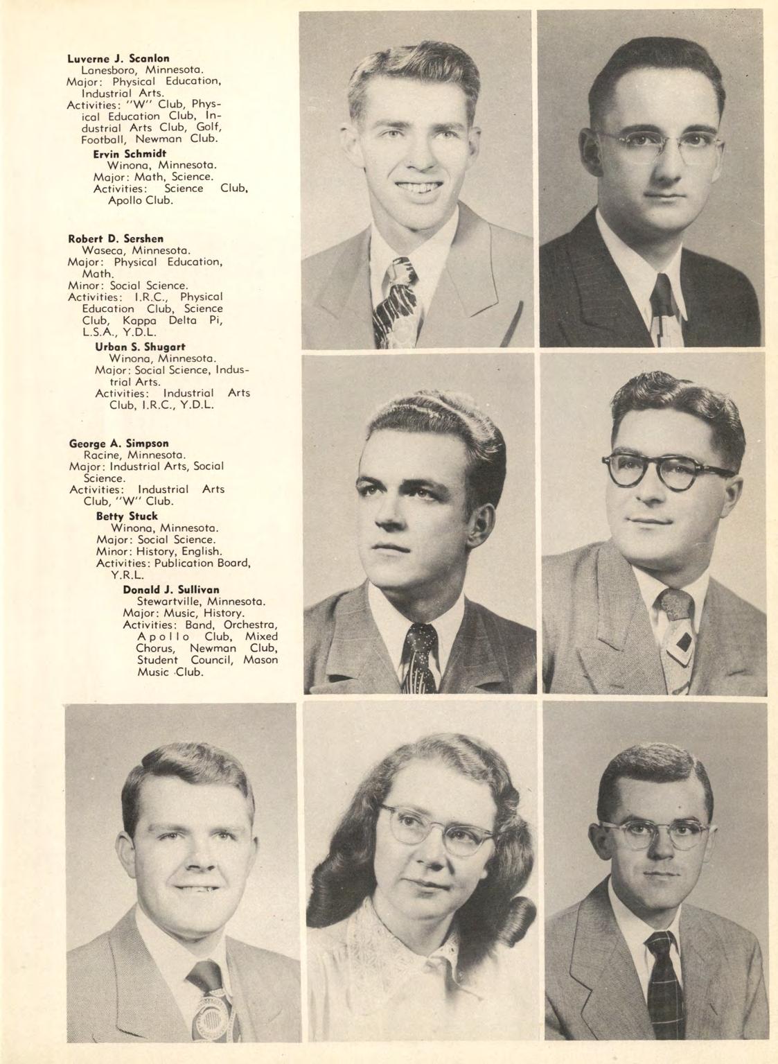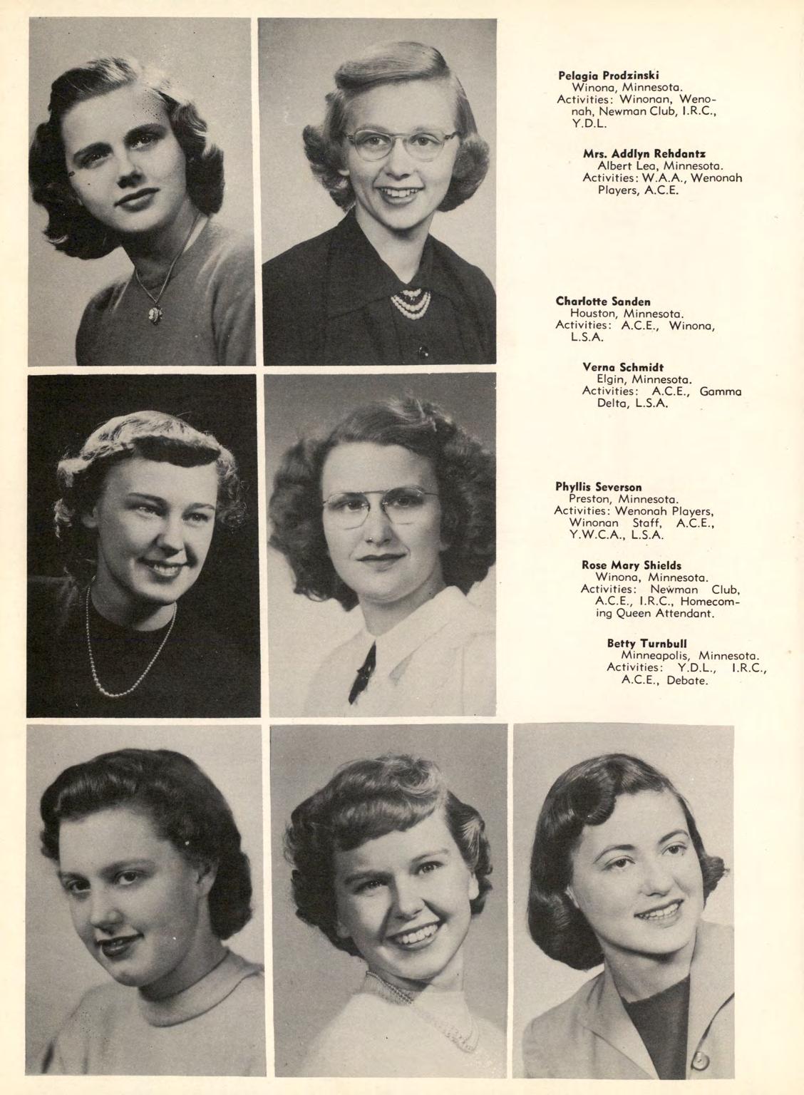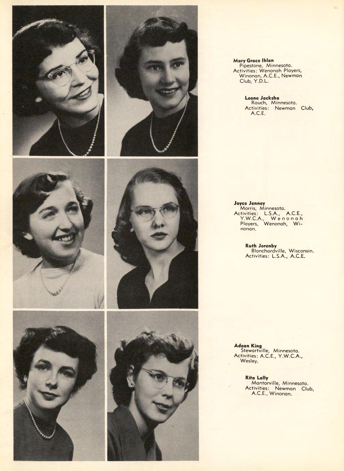 This group has one of the largest memberships in the college 103 at thelast count. After holding its initial picnic at Holsinger Lodge, September 29, the club has held successive meetings through out the year which promote the purpose of the club guest speakers told of conditions in Germany, Spain, and Switzerland Miss Murray rounded out the whole continental review by relating experiences of her trip to Europe Combined meetings with St. Marys and St. Theresa helped to unify the three colleges in Winona Eight members of the club attended the Regional Conference in Minneapolis in December, where Jim Sorflaten was elected vice-president of the Regional Conference. The club sponsored a successful campaign for funds for books for over-seas students Several members attended the National conference in Ann Arbor, Michigan Officers of this friendly group are president, Lester Wagner; vice-president, Edward Dornack; Secretary-Treasurer, Gloria Gynild; and Program Committee, Jim Sorflaten an^d Dorothy Vehrenkamp.