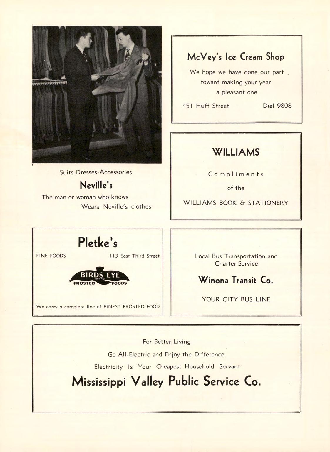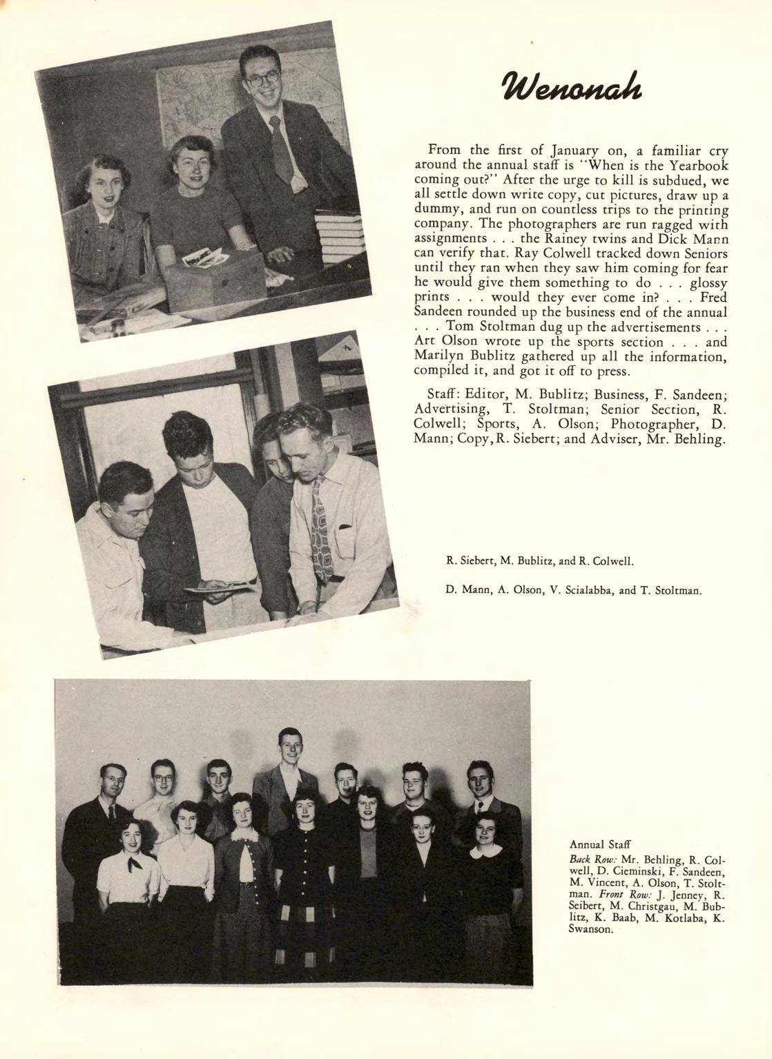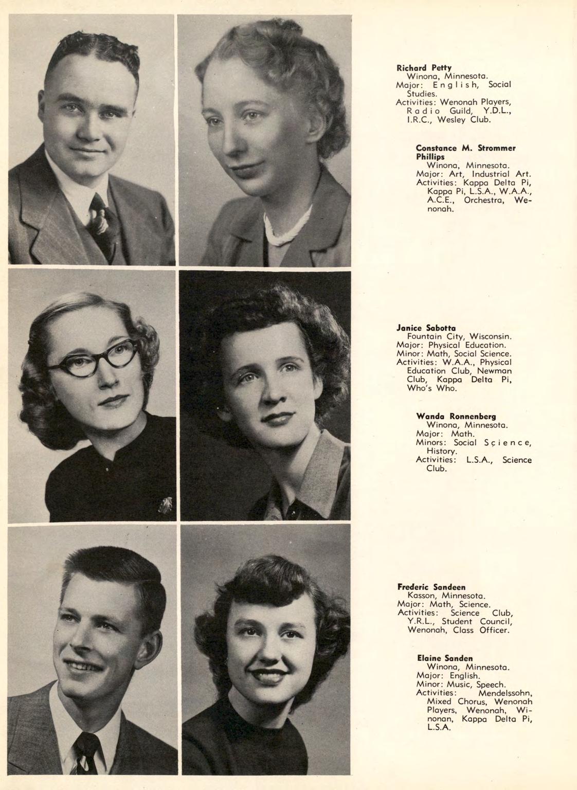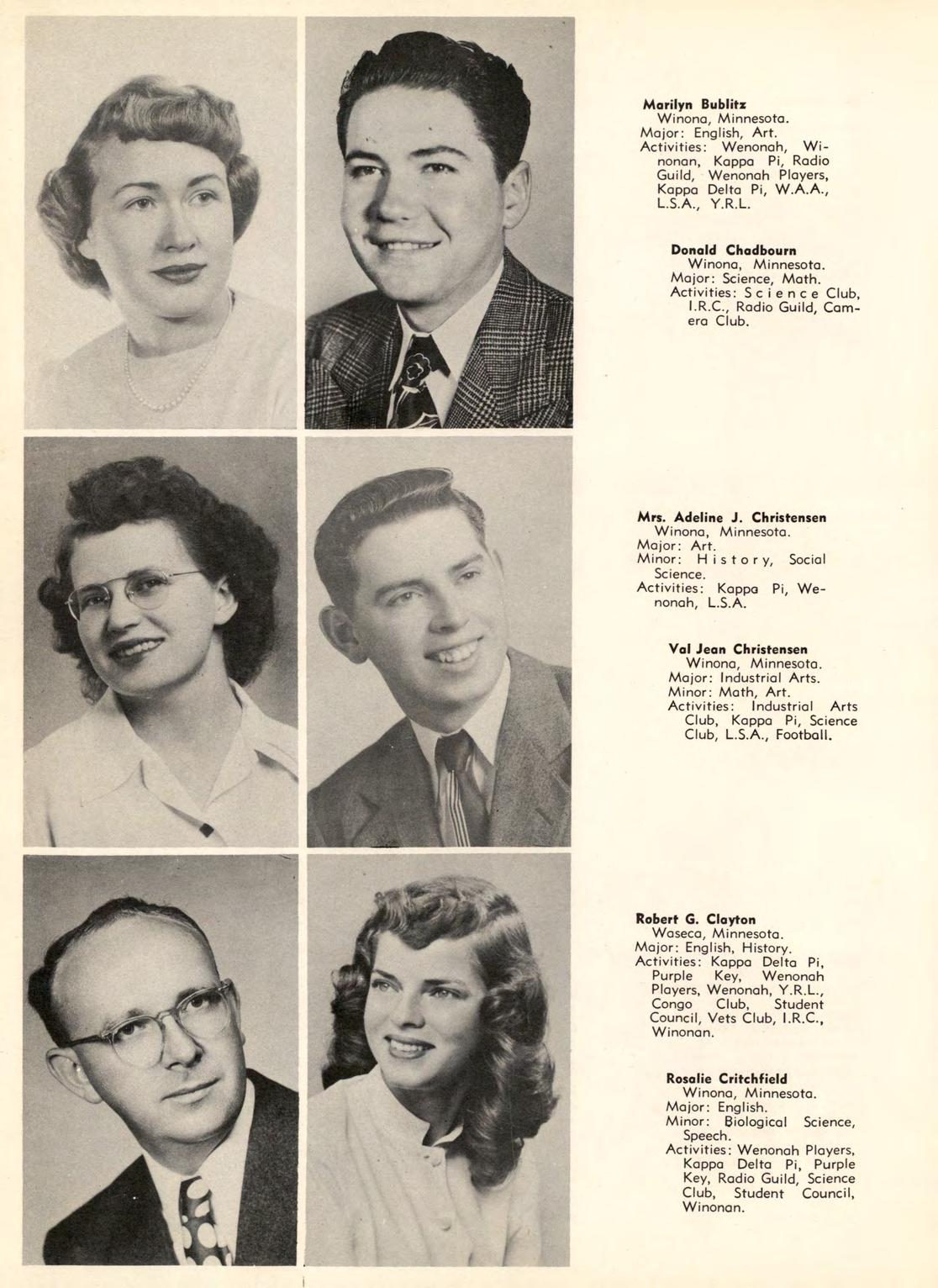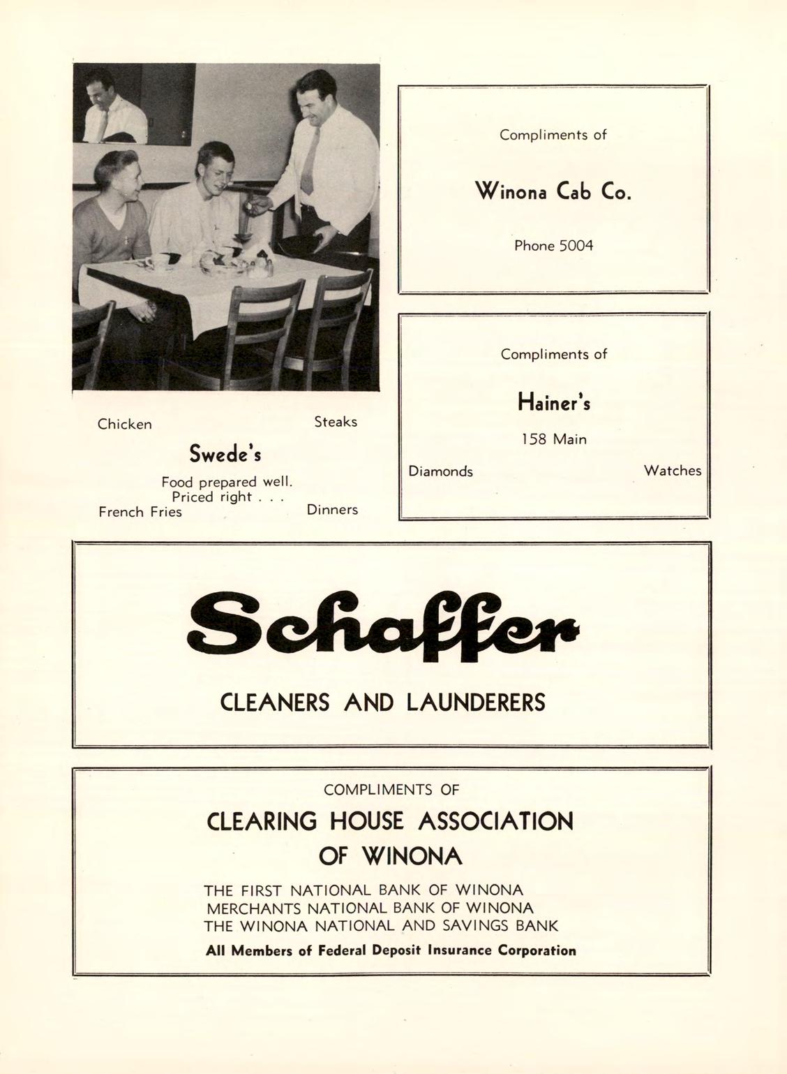 This group has one of the largest memberships in the college 103 at thelast count. After holding its initial picnic at Holsinger Lodge, September 29, the club has held successive meetings through out the year which promote the purpose of the club guest speakers told of conditions in Germany, Spain, and Switzerland Miss Murray rounded out the whole continental review by relating experiences of her trip to Europe Combined meetings with St. Marys and St. Theresa helped to unify the three colleges in Winona Eight members of the club attended the Regional Conference in Minneapolis in December, where Jim Sorflaten was elected vice-president of the Regional Conference. The club sponsored a successful campaign for funds for books for over-seas students Several members attended the National conference in Ann Arbor, Michigan Officers of this friendly group are president, Lester Wagner; vice-president, Edward Dornack; Secretary-Treasurer, Gloria Gynild; and Program Committee, Jim Sorflaten an^d Dorothy Vehrenkamp.
