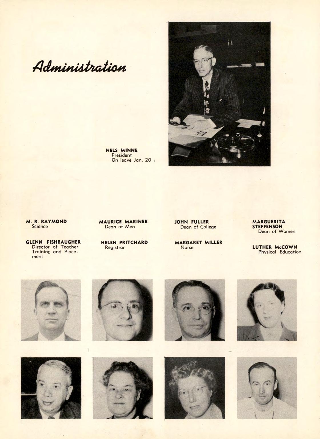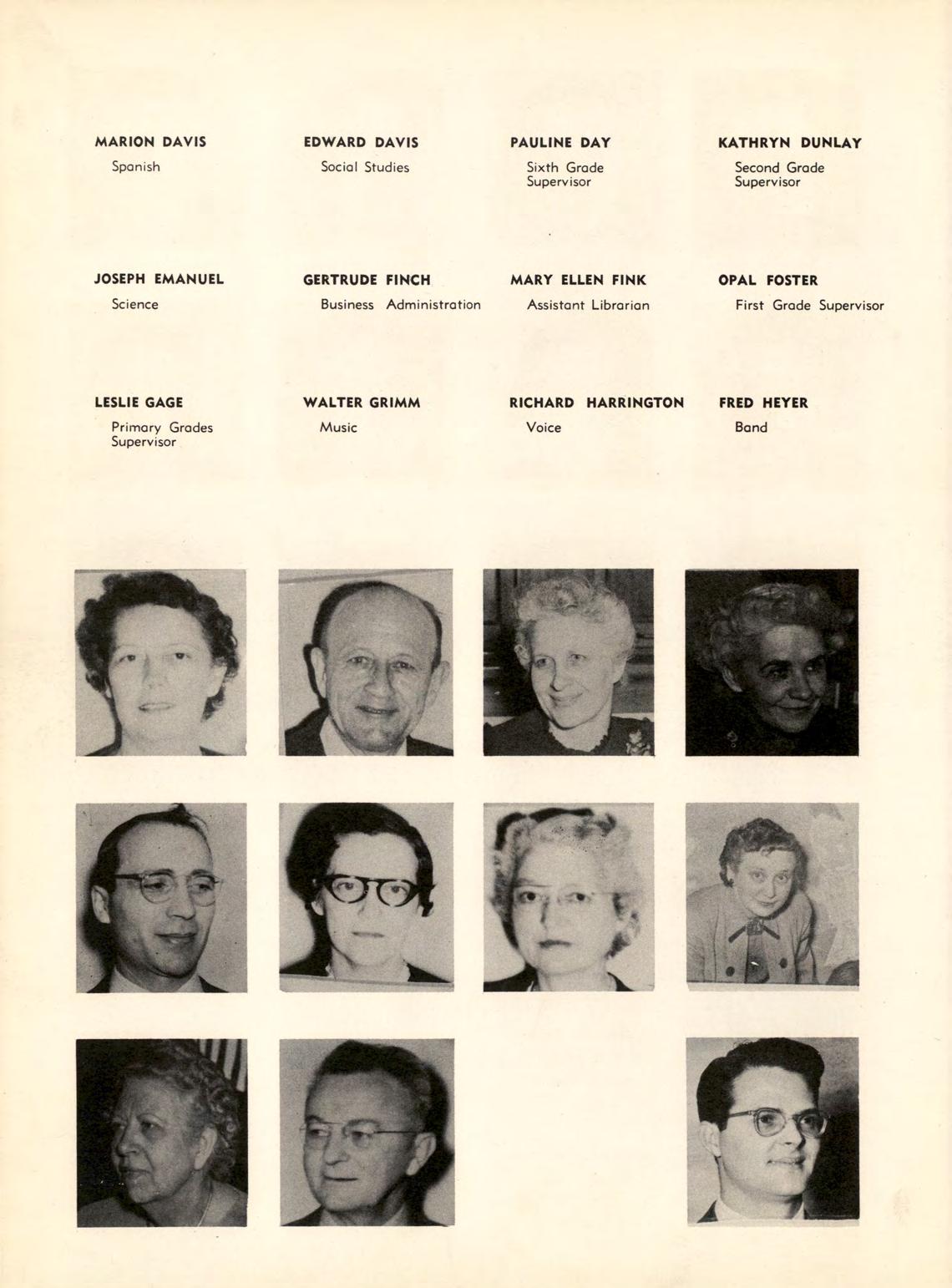Back Row: W. Hohenstien, R. Challberg. Row 2: Mr. Becker, D. Fair, V. Stensrud, V. Scialabba, W. Dohman. Fronf Row: H. Essman, C. Peterson, R. Simon, O. Catlin. Dave resolvingThe 1949-1950 school year meant a golden anniversary for this musical organization. For fifty years the women’s choral group has been active in concert work and, more recently, in touring Minnesota high schools. Twenty-four members are directed by Mr. Grimm and accompanied by Miss Bard. This year at their by-weekly rehearsals, the girls have worked especially hard endeavoring