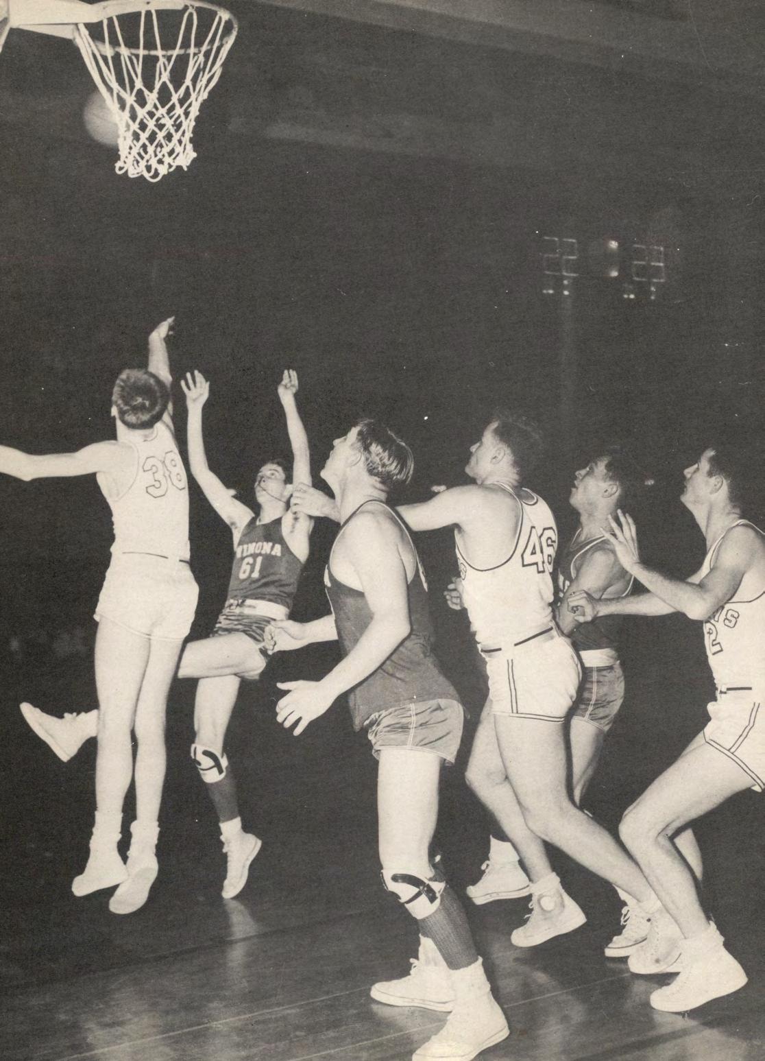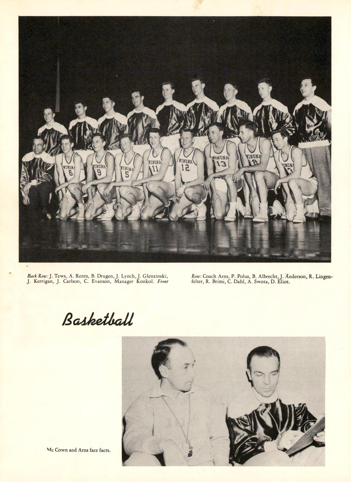 The Peds staged the upset of the year by beating Mankato 43-42 on Pete Polus’ 66-foot shot in the closing seconds of the ball game. It was the first time in ten years that Winona T. C. has defeated the Indians in basketball.