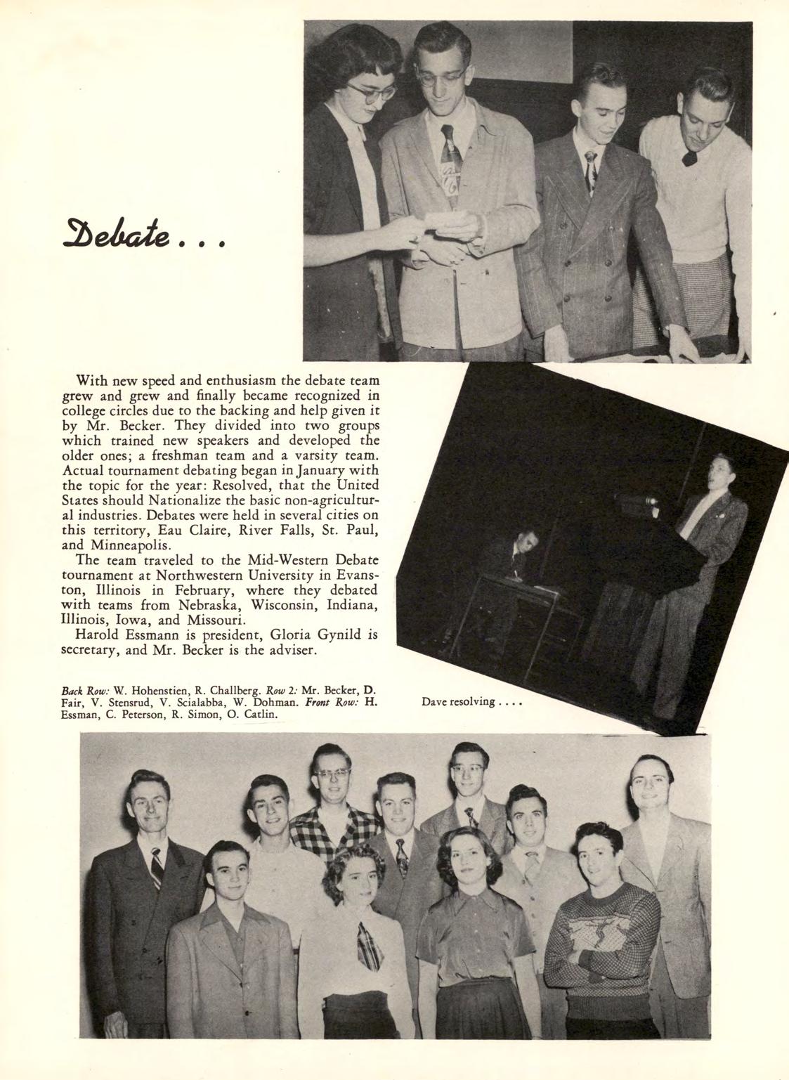 With new speed and enthusiasm the debate team grew and grew and finally became recognized in college circles due to the backing and help given it by Mr. Becker. They divided into two groups which trained new speakers and developed the older ones; a freshman team and a varsity team. Actual tournament debating began in January with the topic for the year; Resolved, that the United States should Nationalize the basic non-agricultural industries. Debates were held in several cities on this territory, Eau Claire, River Falls, St. Paul, and Minneapolis.