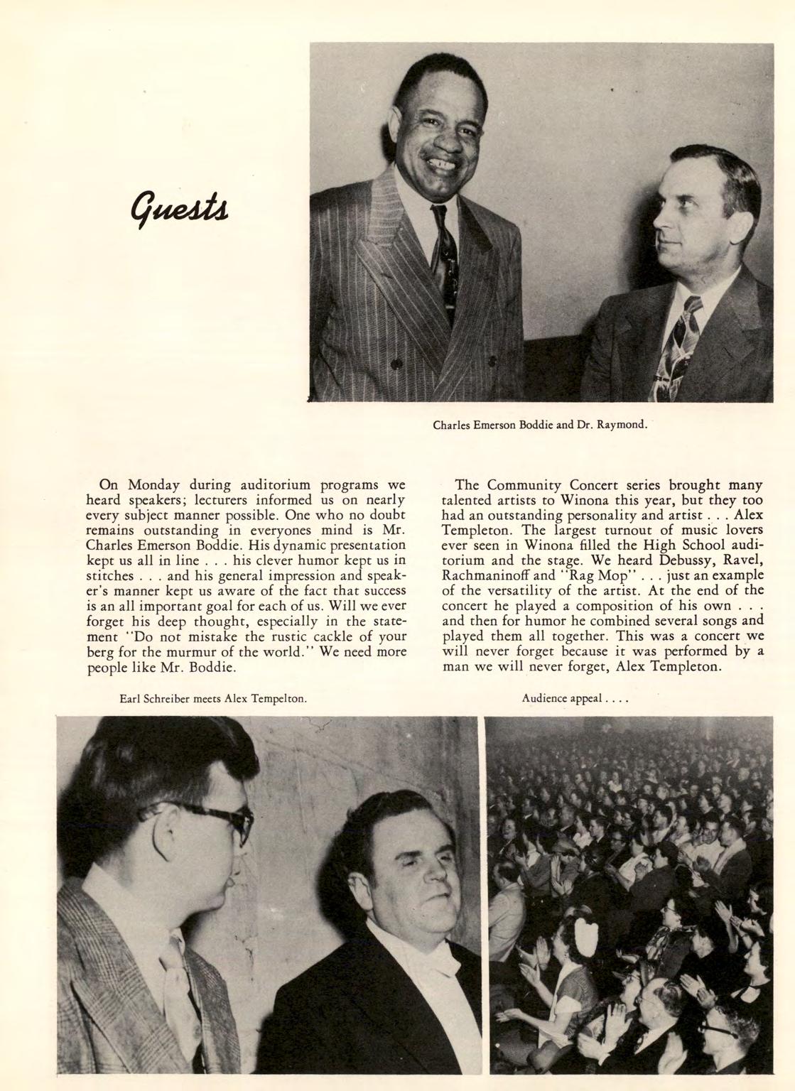 The Community Concert series brought many talented artists to Winona this year, but they too had an outstanding personality and artist Alex Templeton. The largest turnout of musiclovers ever seen in Winona filled the High School auditorium and the stage. We heard Debussy, Ravel, Rachmaninoff and “Rag Mop’’ just an example of the versatility of the artist. At the end of the concert he played a composition of his own and then for humor he combined several songs and played them all together. This was a concert we will never forget because it was performed by a man we will never forget, Alex Templeton.