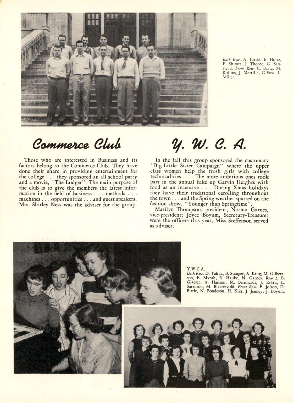 Those who are interested in Business and its factors belong to the Commerce Club. They have done their share in providing entertainment for the college they sponsored an all school party and a movie, “The Lodger”. The main purpose of the club is to give the members the latest information in the field of business methods machines opportunities and guest speakers. Mrs. Shirley Ness was the adviser for the group.