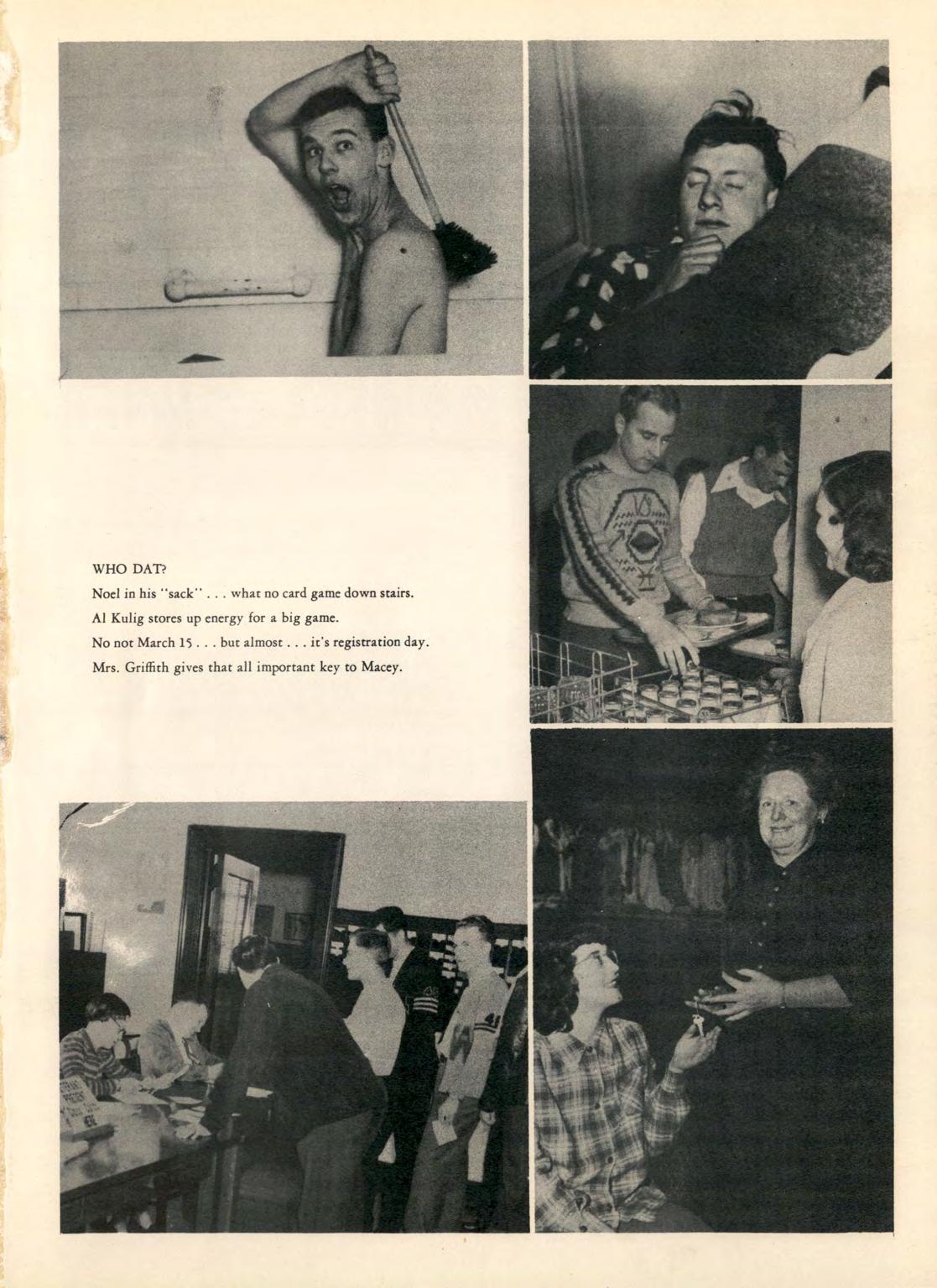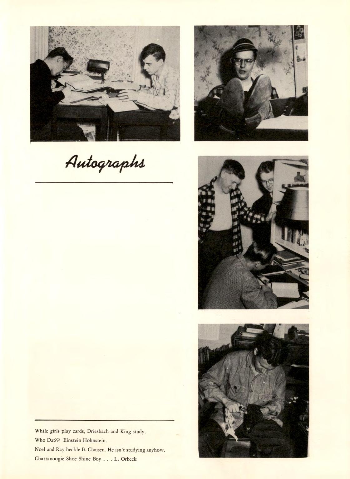All the credit for the push behind the successful event goes to John Jupin and Joe Fennie. The C. C’s provided humor. Queen candidates this year were G. Blohm, M. Brekke, M. Bublitz, L. Denning, N. Games, M. Ihlan, J. Eskra, W. Leir, B. Lelwica, G. O’Neill, M. Thompson, E. Sanden.
