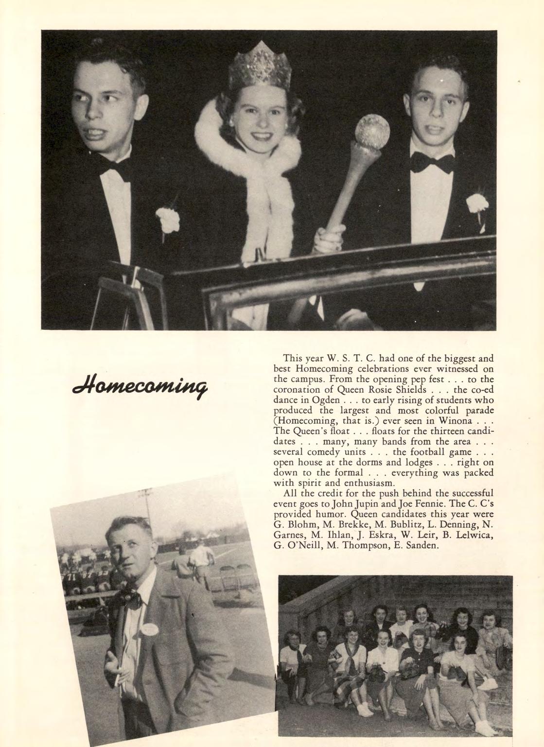 This year W. S. T. C. had one of the biggest and best Homecoming celebrations ever witnessed on the campus. From the opening pep fest to the coronation of Queen Rosie Shields the co-ed dance in Ogden to early rising of students who produced the largest and most colorful parade (Homecoming, that is.) ever seen in Winona