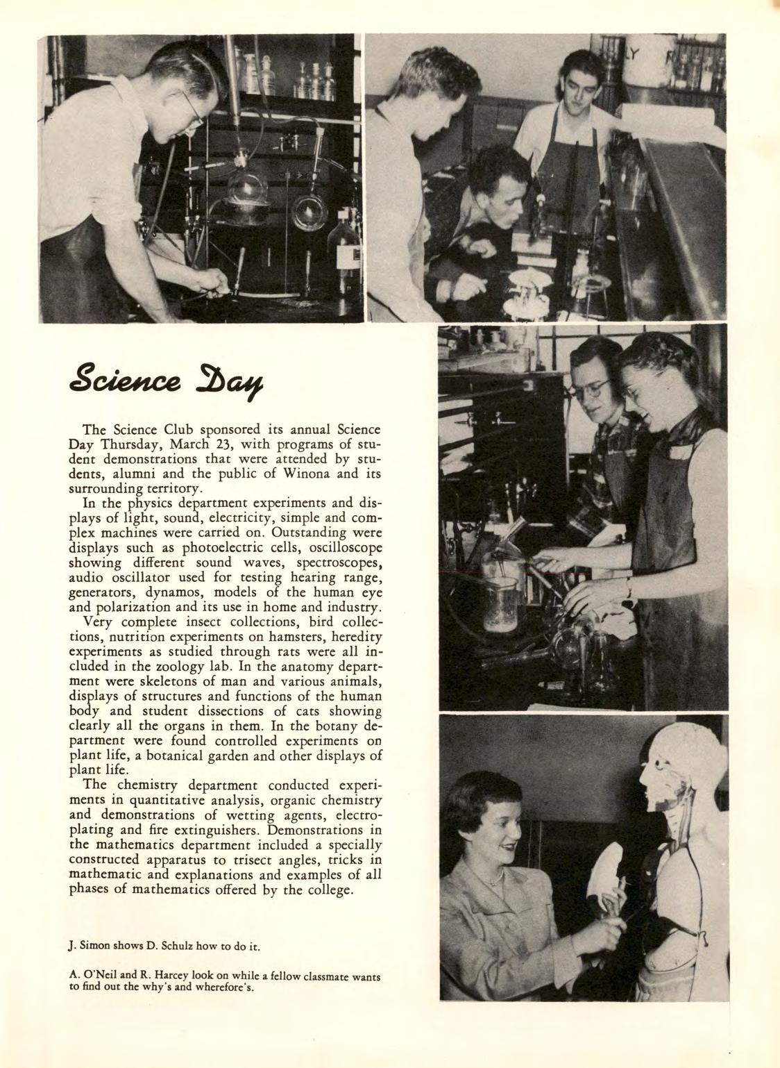 The Science Club sponsored its annual Science Day Thursday, March 23, with programs of student demonstrations that were attended by students, alumni and the public of Winona and its surrounding territory.