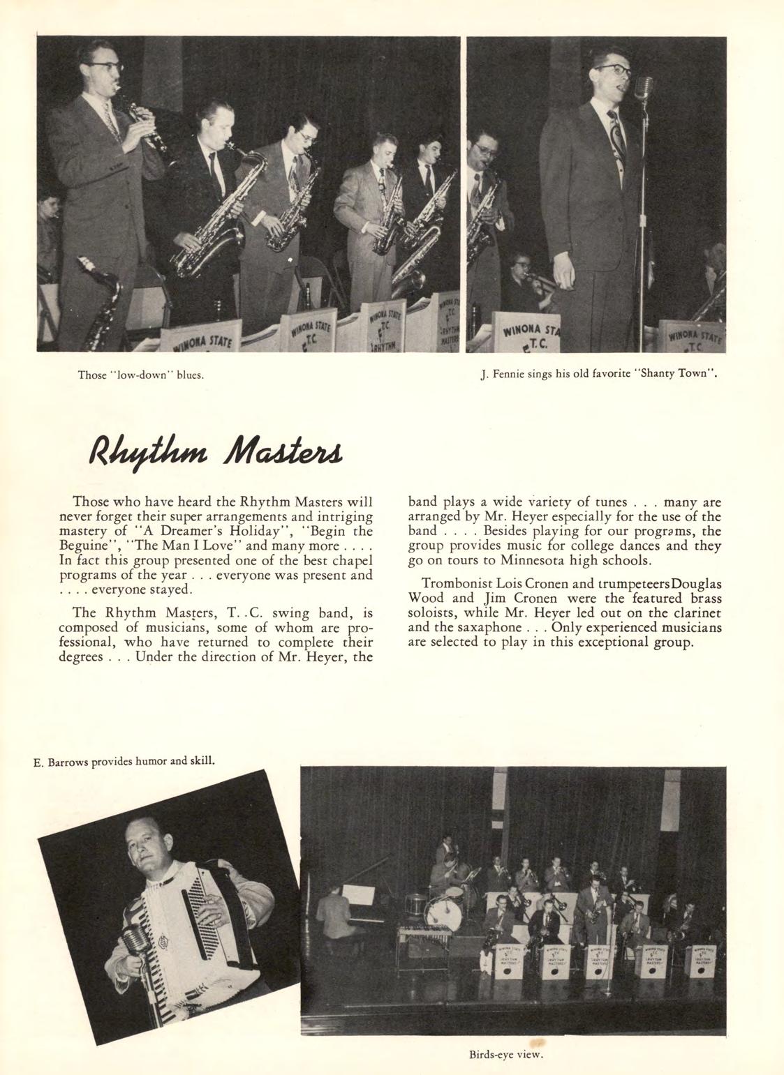 section. G. Sweeney, S. Eskar, L. Rheingans. Back Row: C. Lee, E. Schreiber, J. Wood, L. Peters, G. Danuser, D. Kinne, G. Sweeney, A. Zigneigo. Row 2: C. Christensen, D. Nienow, N. Robinson, C. Sumner, J. Robinson, R. Mortinger, Mr. Heyer. Row 3: B. Brosious, M. Ellison, L. Smith, L. Rheingans, G. Landers, R. Dick, E. Baumbach. Row 4: S. Eskar, M. Bohnen, B. Roth, D. Lewis, R. Hendrickson, L. Cronen, H. Halloran, S. LaRock. Front Row: H. Klas, N. Bondeson, C. Murtaugh, M. Bernhardt, J. Holliday, M. Marshall, J. Eskra, L. Mueska.Those who have heard the Rhythm Masters will never forget their super arrangements and intriging mastery of “A Dreamer’s Holiday”, “Begin the Beguine”, “The Man I Love” and many more In fact this group presented one of the best chapel programs of the year everyone was present and everyone stayed.