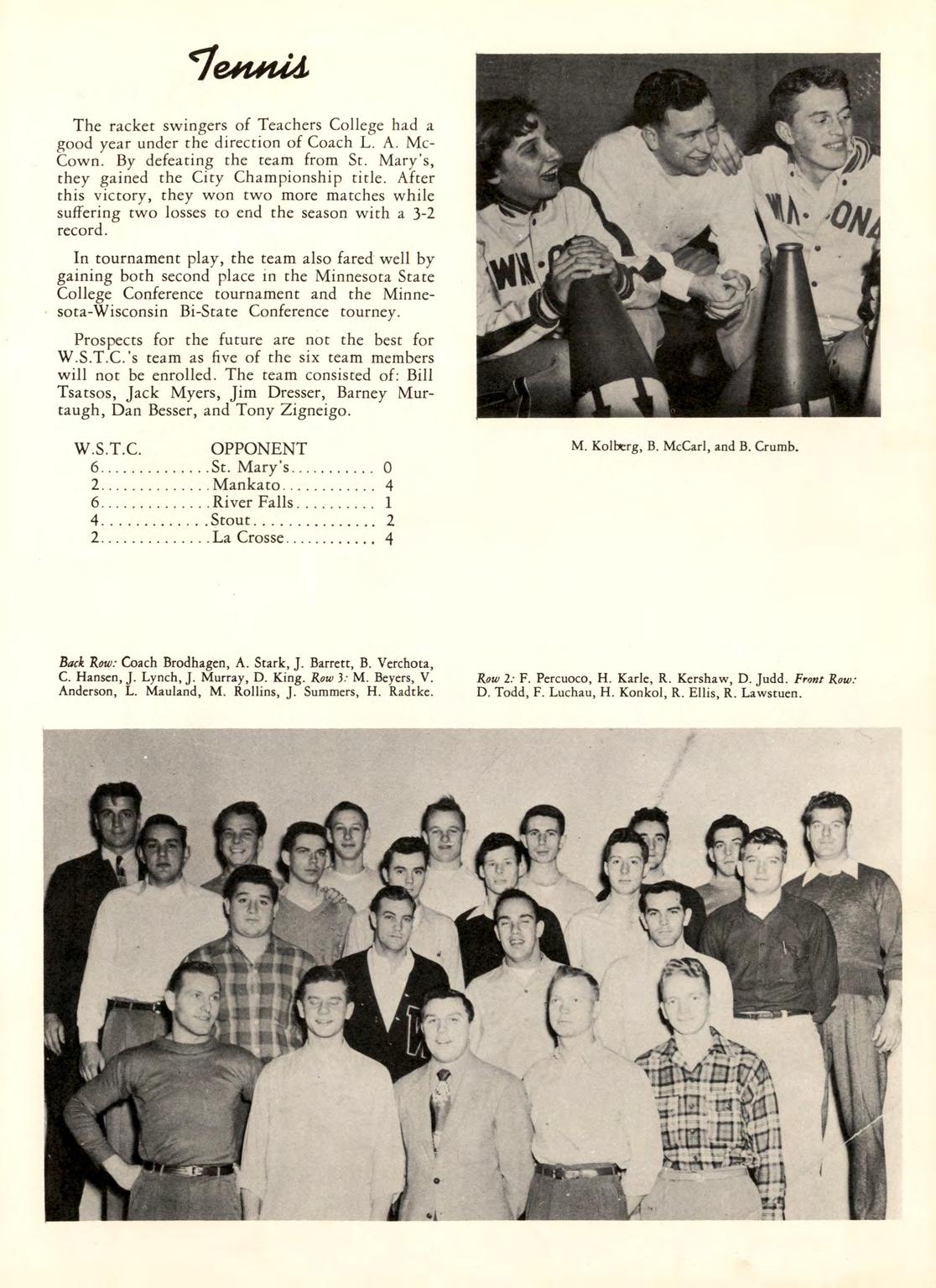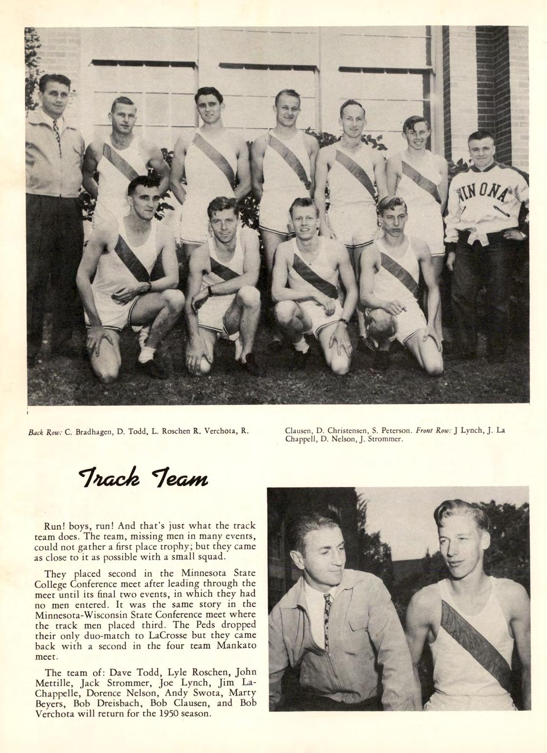 They placed second in the Minnesota State College Conference meet after leading through the meet until its final two events, in which they had no men entered. It was the same story in the Minnesota-Wisconsin State Conference meet where the track men placed third. The Peds dropped their only duo-match to LaCrosse but they came back with a second in the four team Mankato meet.