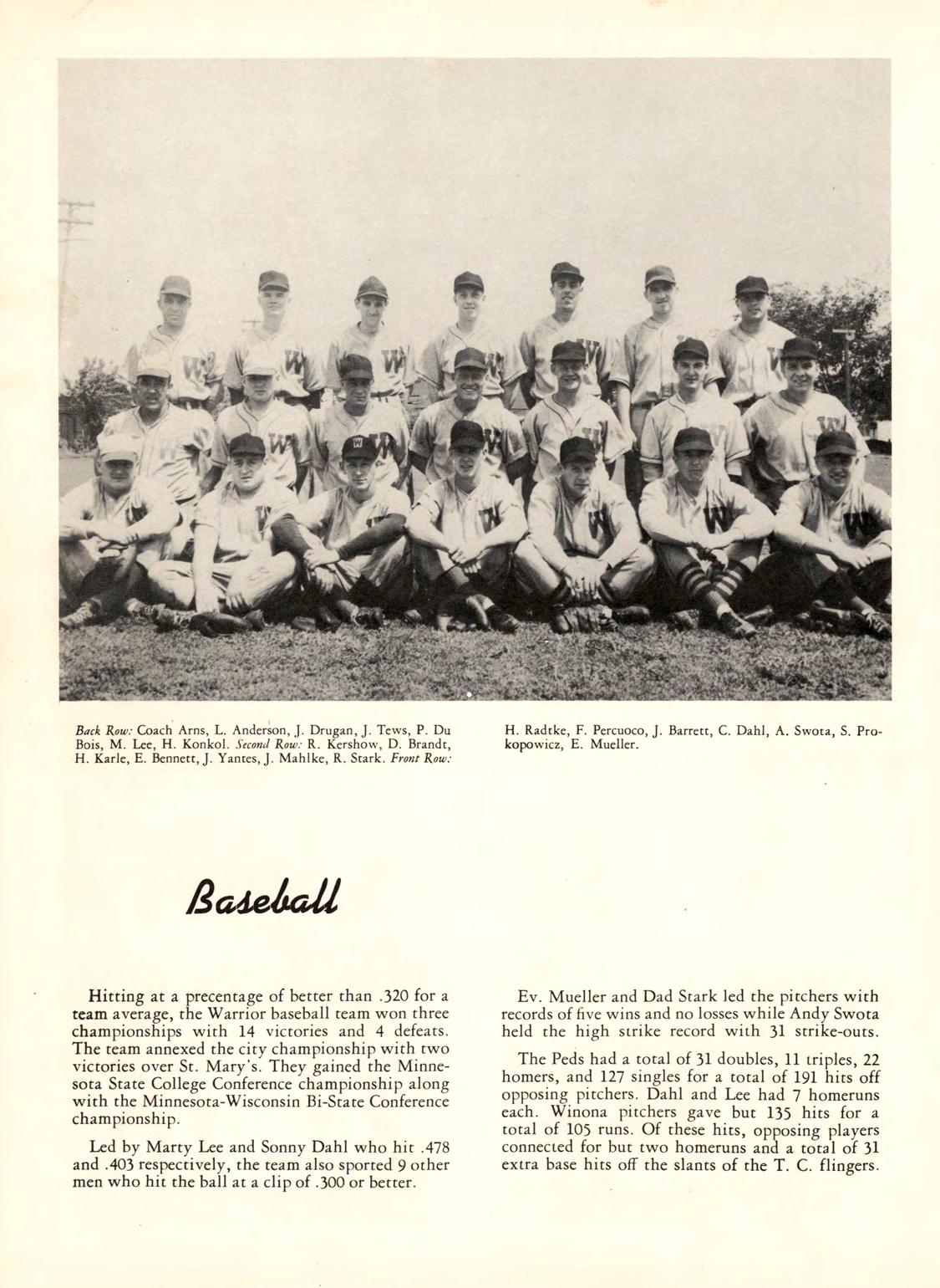 Hitting at a precentage of better than .320 for a team average, the Warrior baseball team won three championships with 14 victories and 4 defeats. The team annexed the city championship with two victories over St. Mary’s. They gained the Minnesota State College Conference championship along with the Minnesota-Wisconsin Bi-State Conference championship.