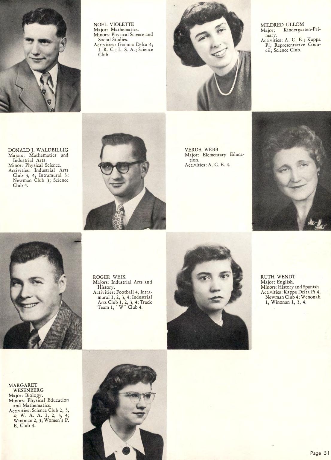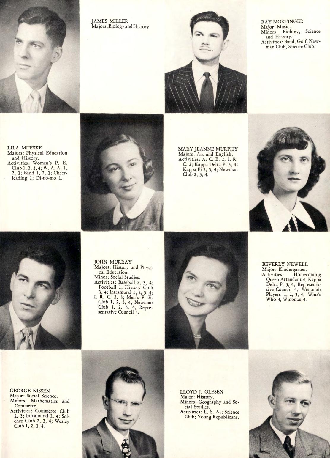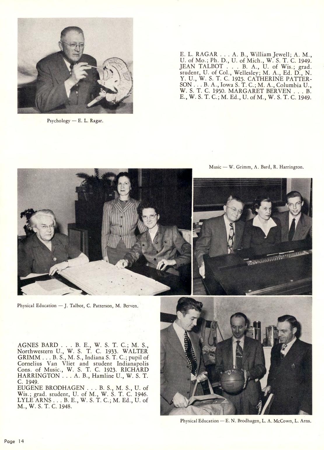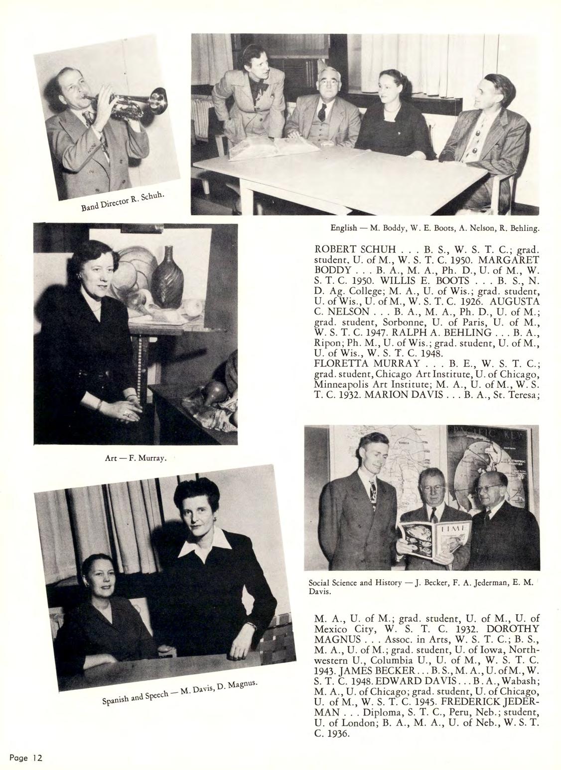 M. A., U. of M.; grad, student, U. of M., U. of Mexico City, W. S. T. C. 1932. DOROTHY MAGNUS Assoc, in Arts, W. S. T. C.; B. S., M. A., U. of M.; grad, student, U. of Iowa, Northwestern U., Columbia U., U. of M., W. S. T. C. 1943. JAMES BECKER... B. S., M. A., U. ofM., W. S. T. C. 1948.EDWARD DAVIS. ..B. A., Wabash; M. A., U. of Chicago; grad, student, U. of Chicago, U. of M., W. S. T. C. 1945. FREDERICK JEDERMAN Diploma, S. T. C., Peru, Neb.; student, U. of London; B. A., M. A., U. of Neb., W. S. T. C. 1936.