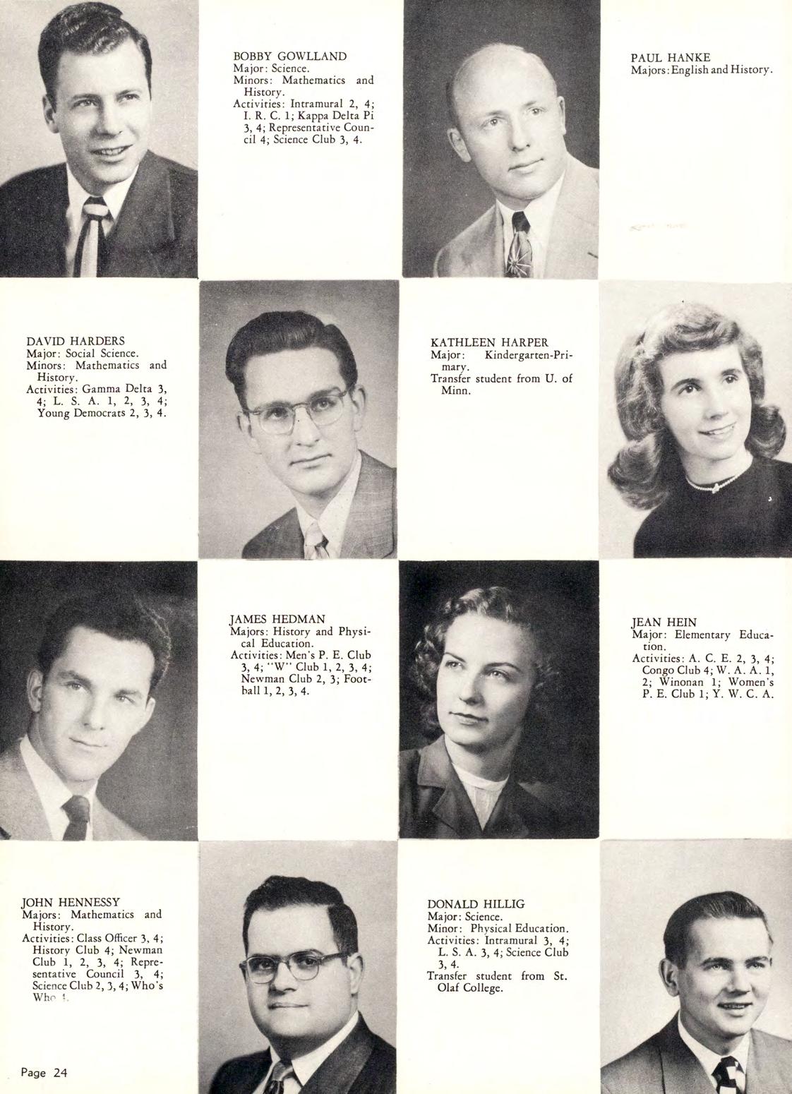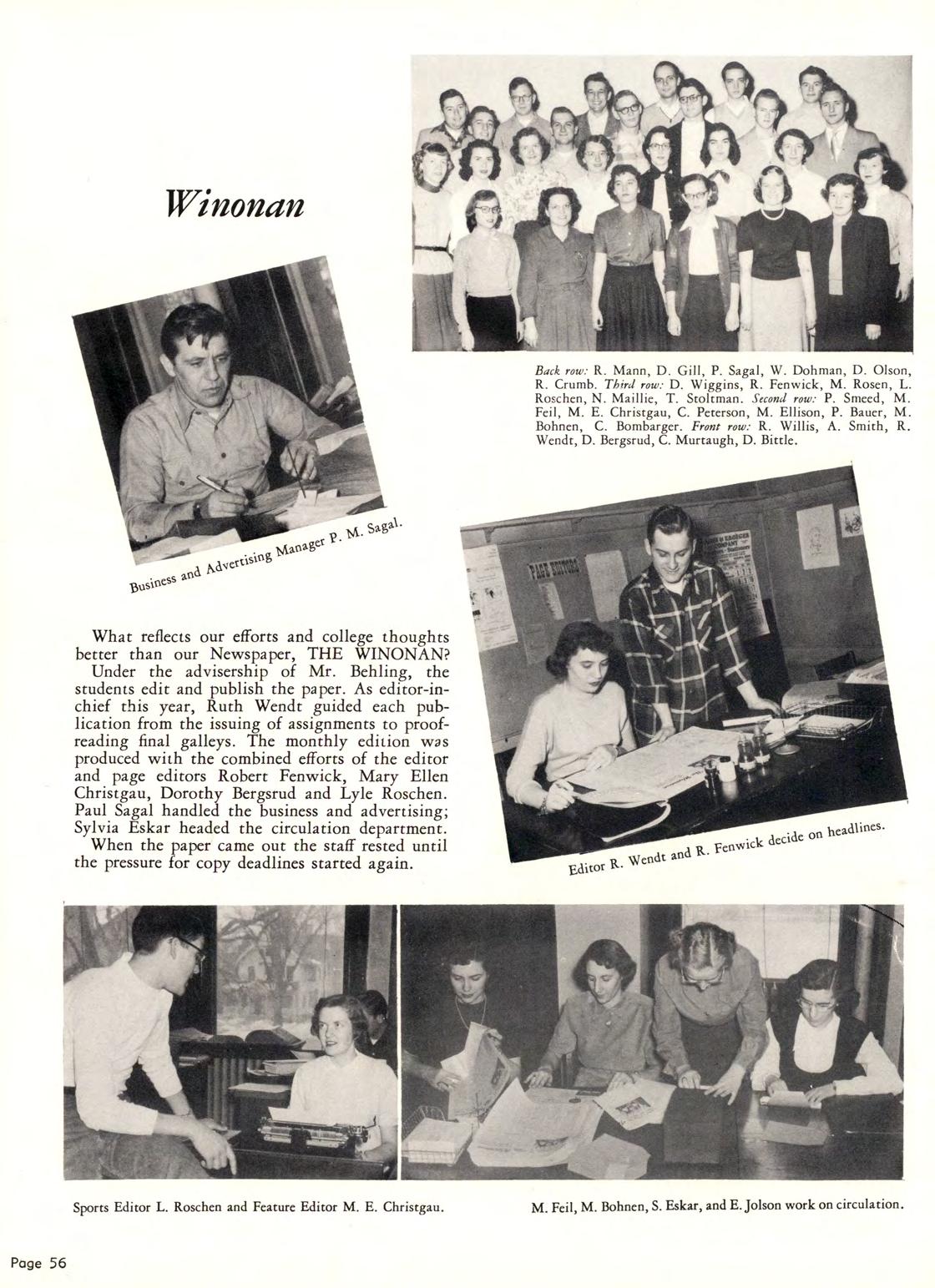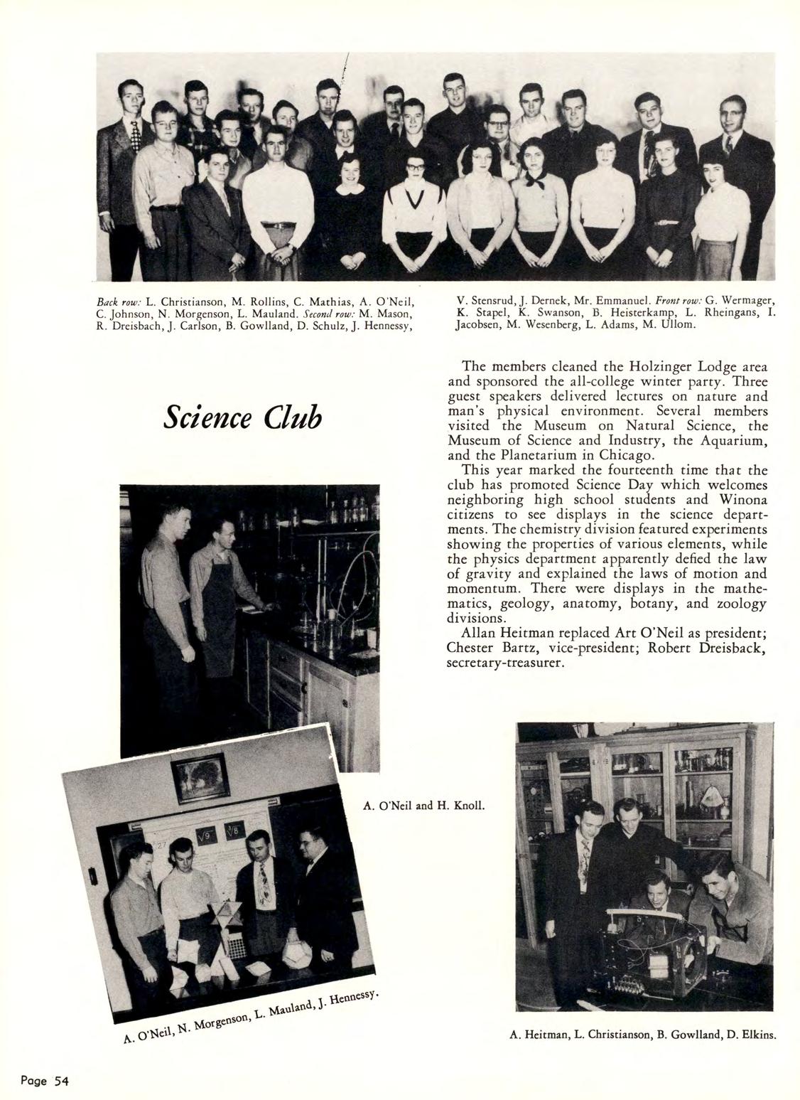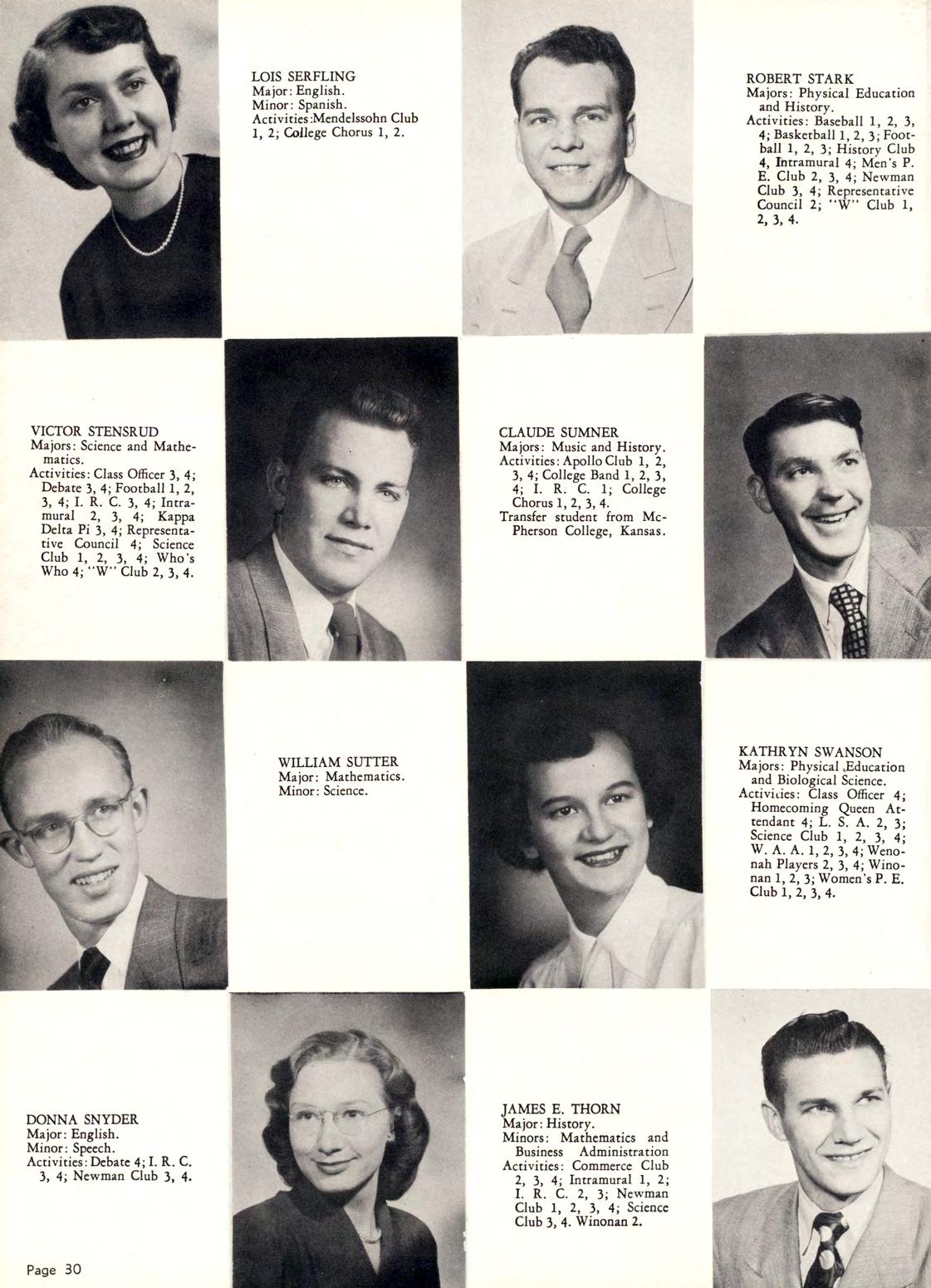 His reserved manner and ingenious way of finding the right answer to administrative problems have gone a long way in adding teamwork to the college. His friendliness with students and sympathy toward their point of view helps in making Winona a fine school.