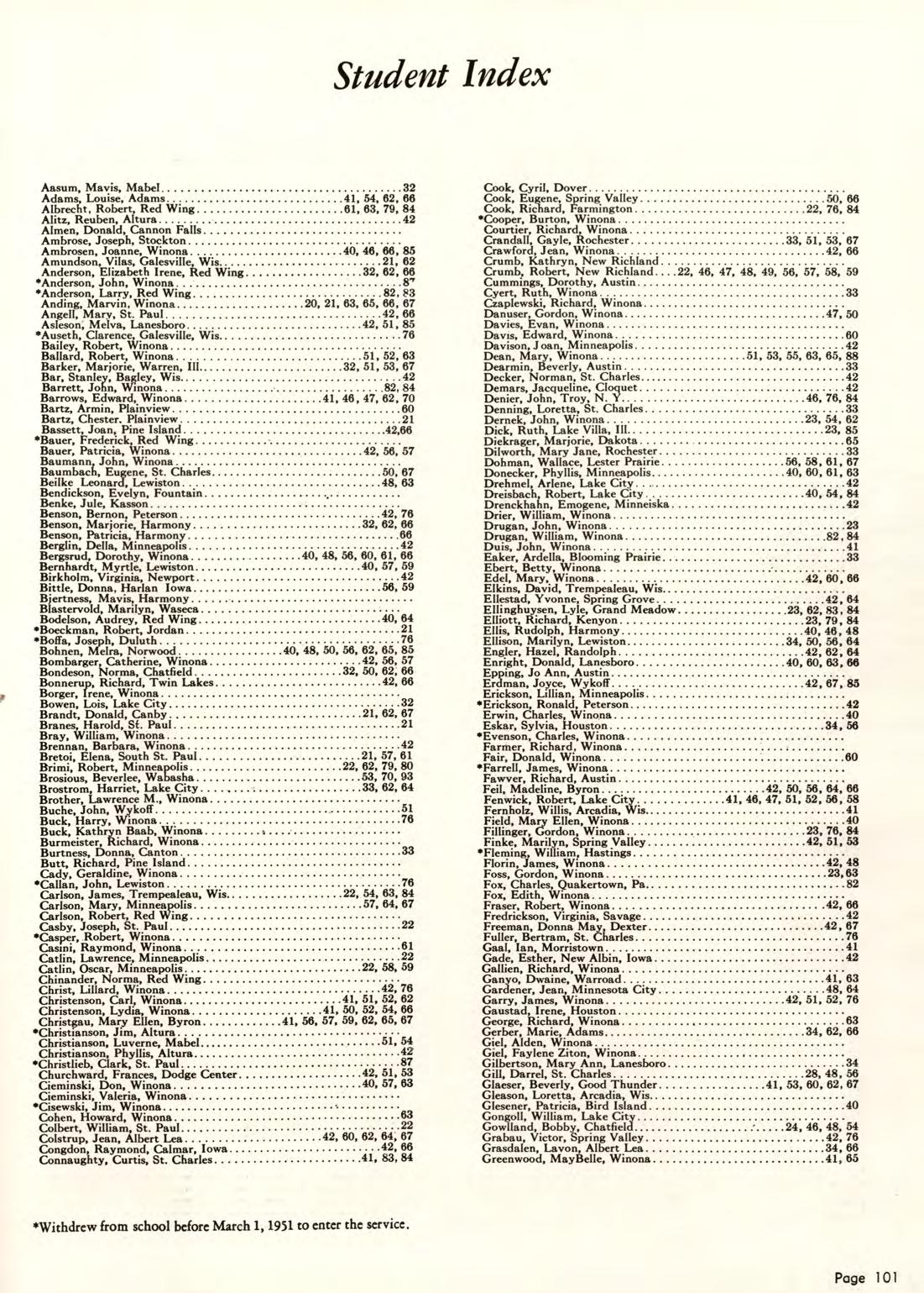 B. A., St. Olaf; M. M., Northwestern U., W. S. T. C. 1950. OPAL FOSTER B. S., lowa S. T. C.; M. A., U. of Chicago; Exchange teacher, Fife, Scotland., W. S. T. C. 1931. MELVIN O. WEDUL