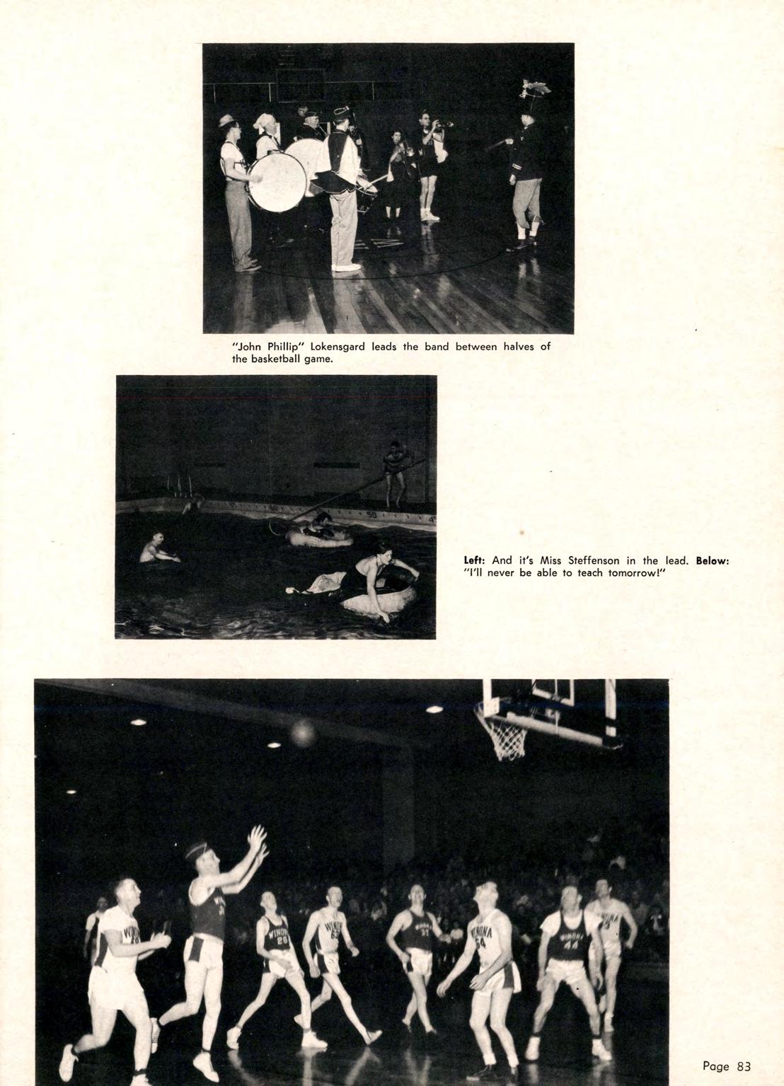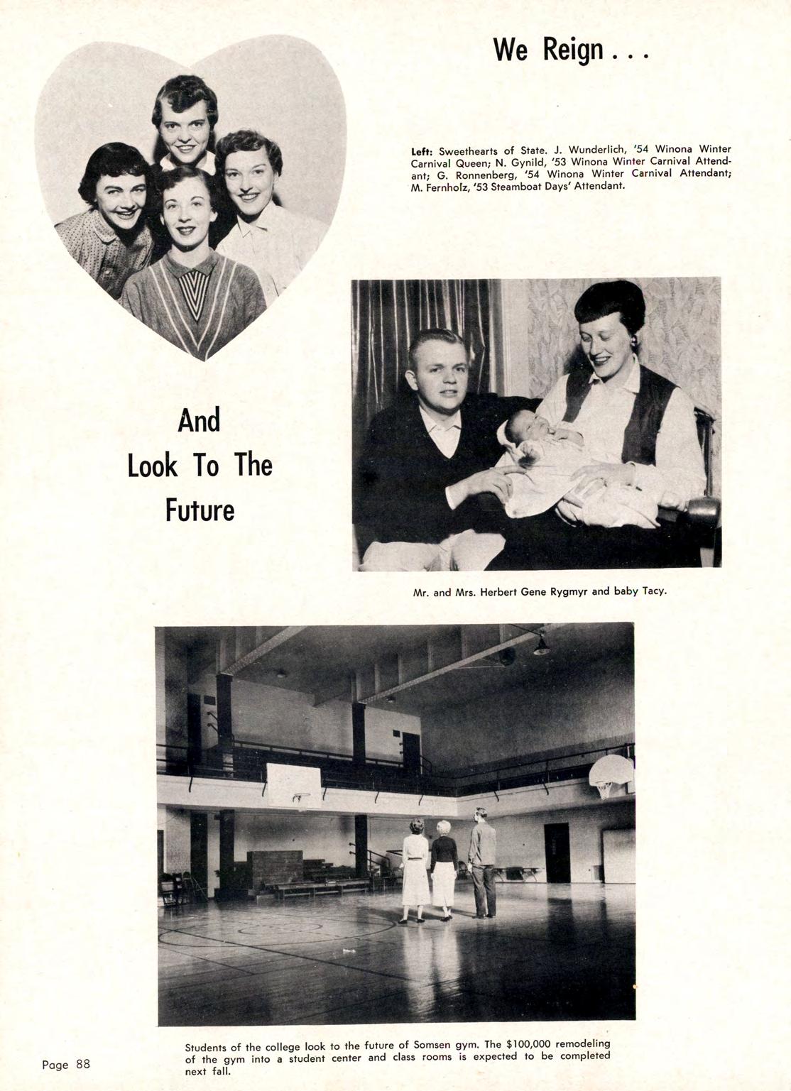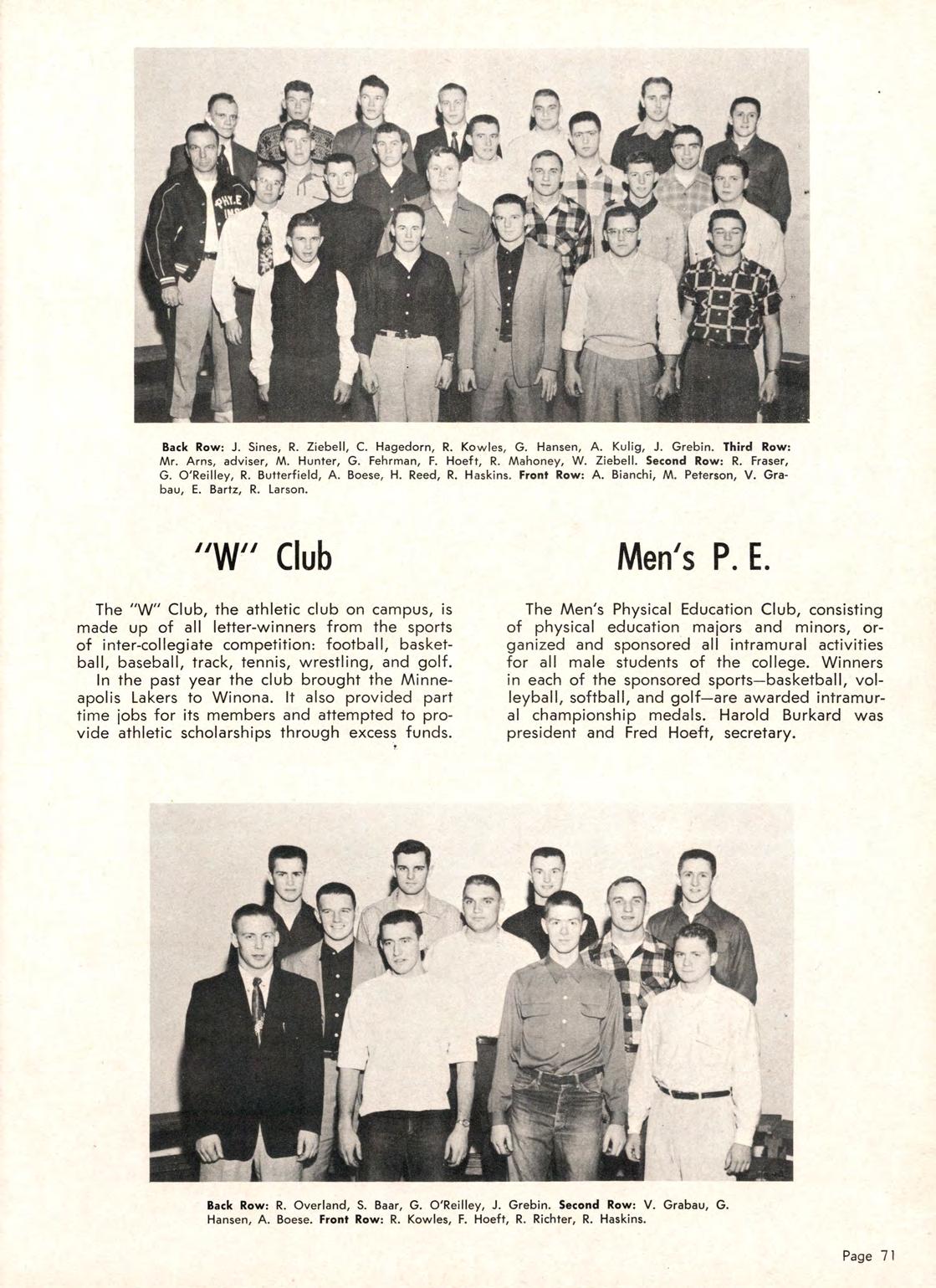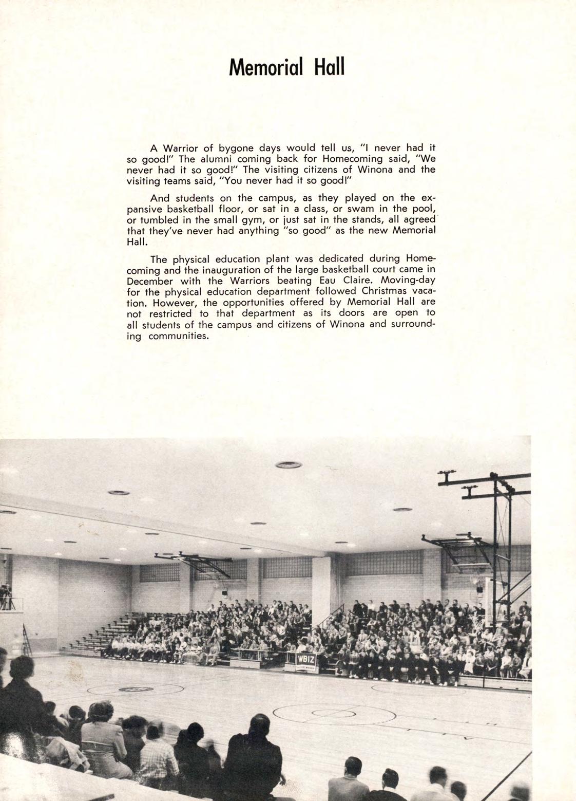 The physical education plant was dedicated during Homecoming and the inauguration of the large basketball court came in December with the Warriors beating Eau Claire. Moving-day for the physical education department followed Christmas vacation. However, the opportunities offered by Memorial Hall are not restricted to that department as its doors are open to all students of the campus and citizens of Winona and surrounding communities.