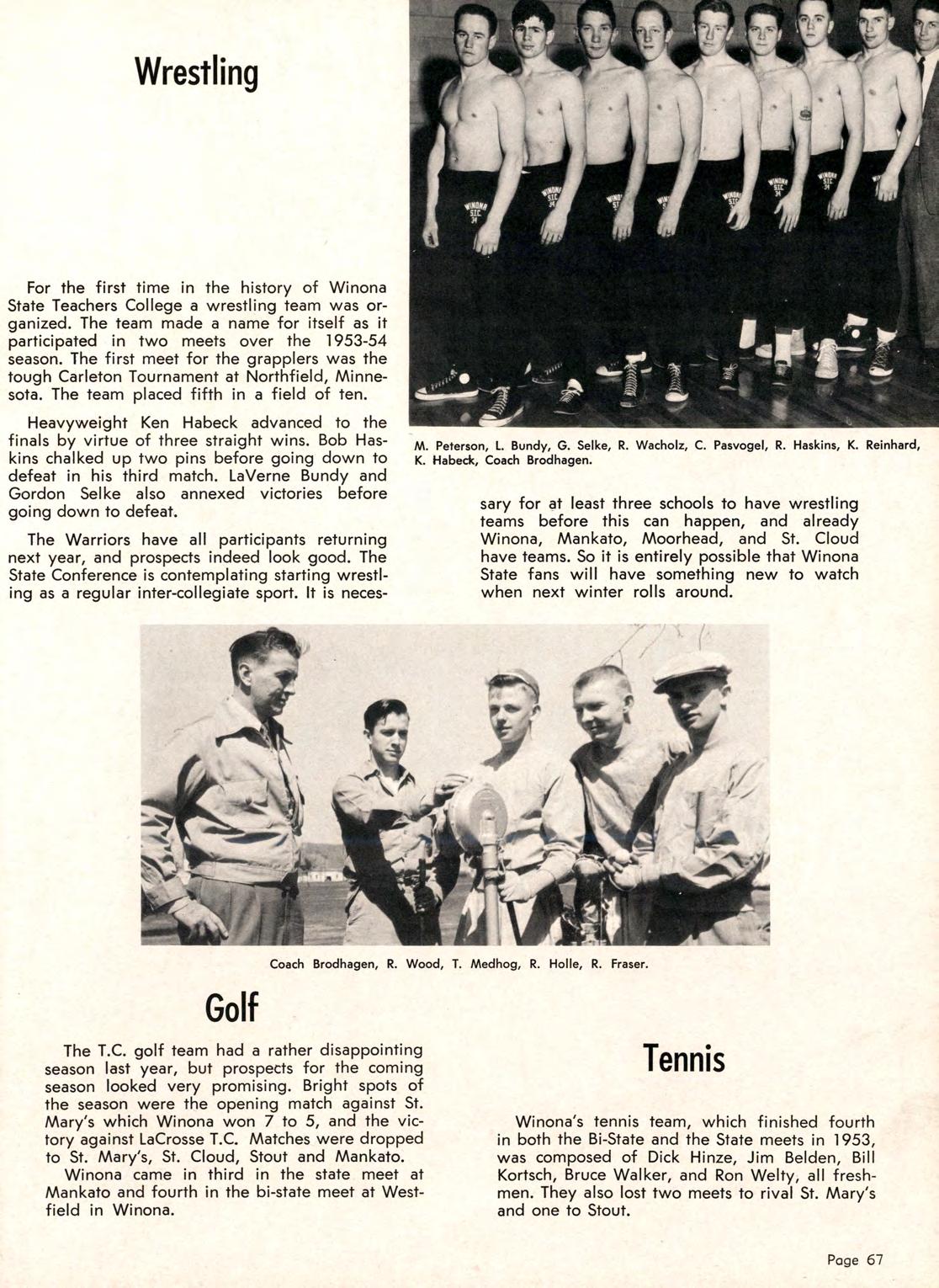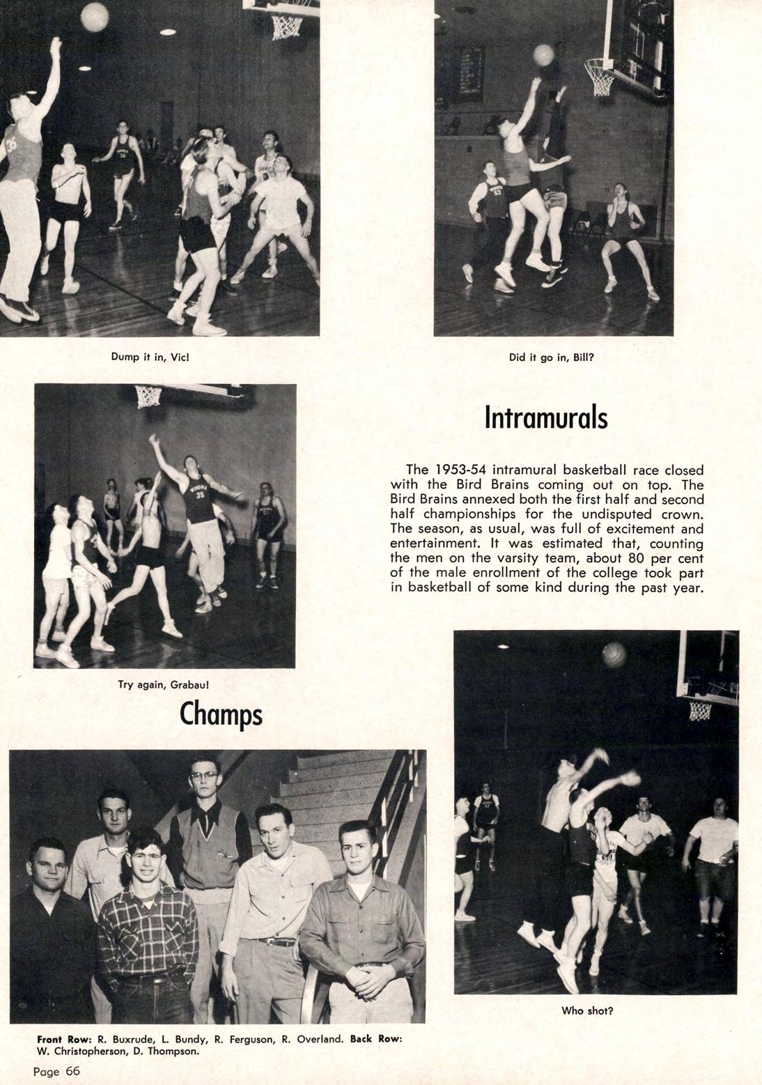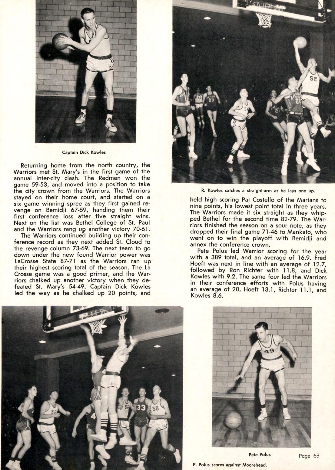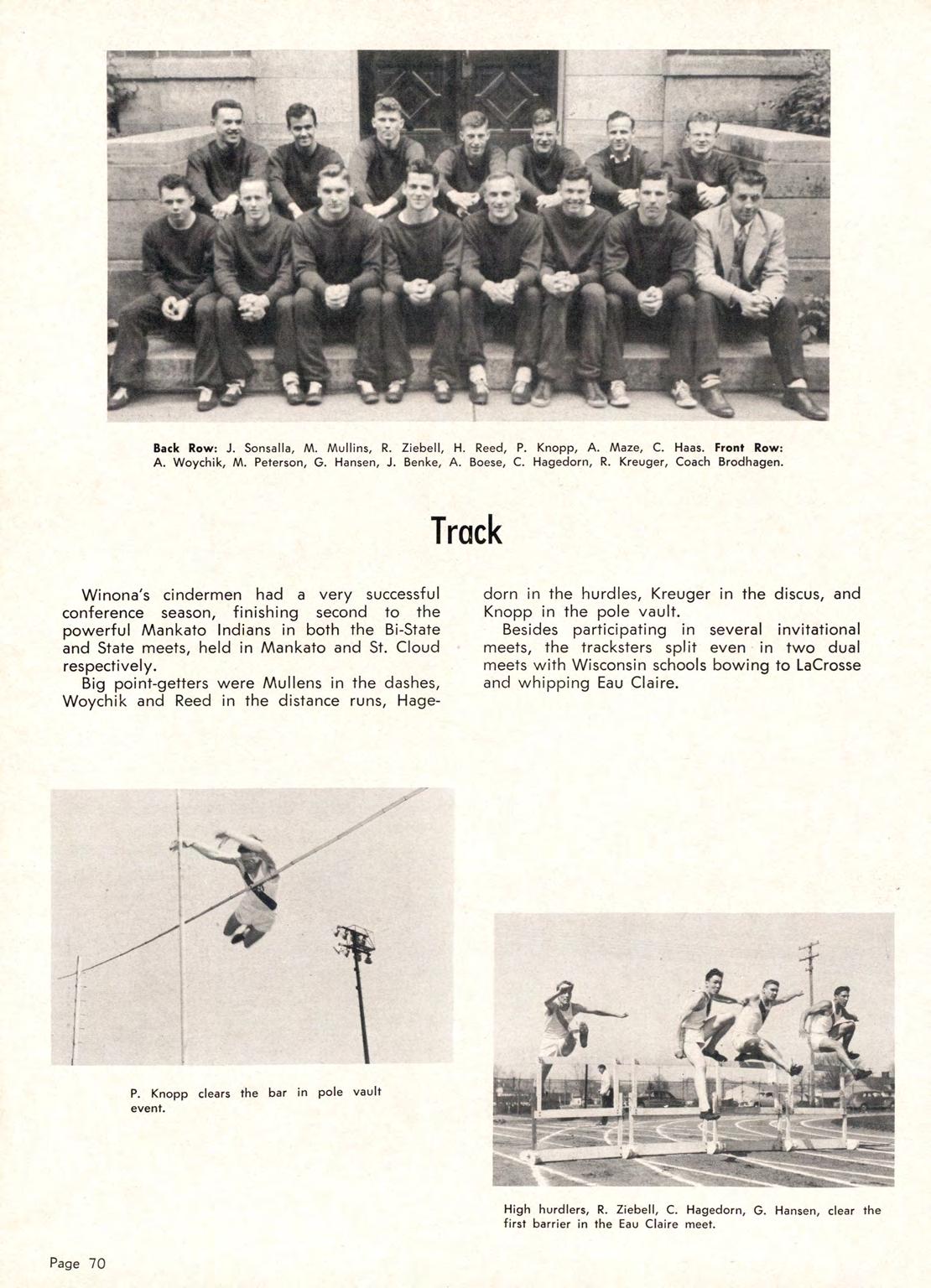 The physical education plant was dedicated during Homecoming and the inauguration of the large basketball court came in December with the Warriors beating Eau Claire. Moving-day for the physical education department followed Christmas vacation. However, the opportunities offered by Memorial Hall are not restricted to that department as its doors are open to all students of the campus and citizens of Winona and surrounding communities.