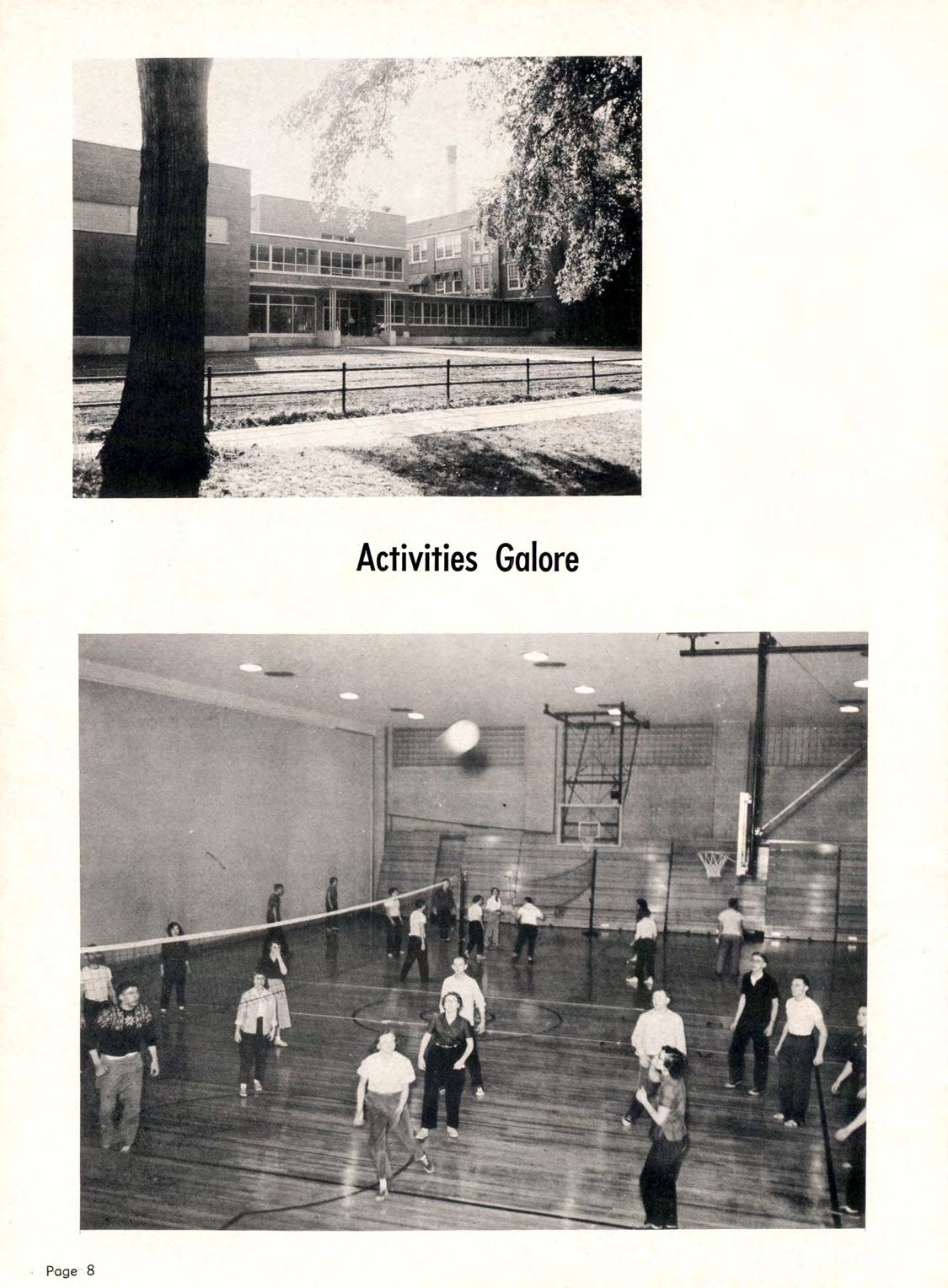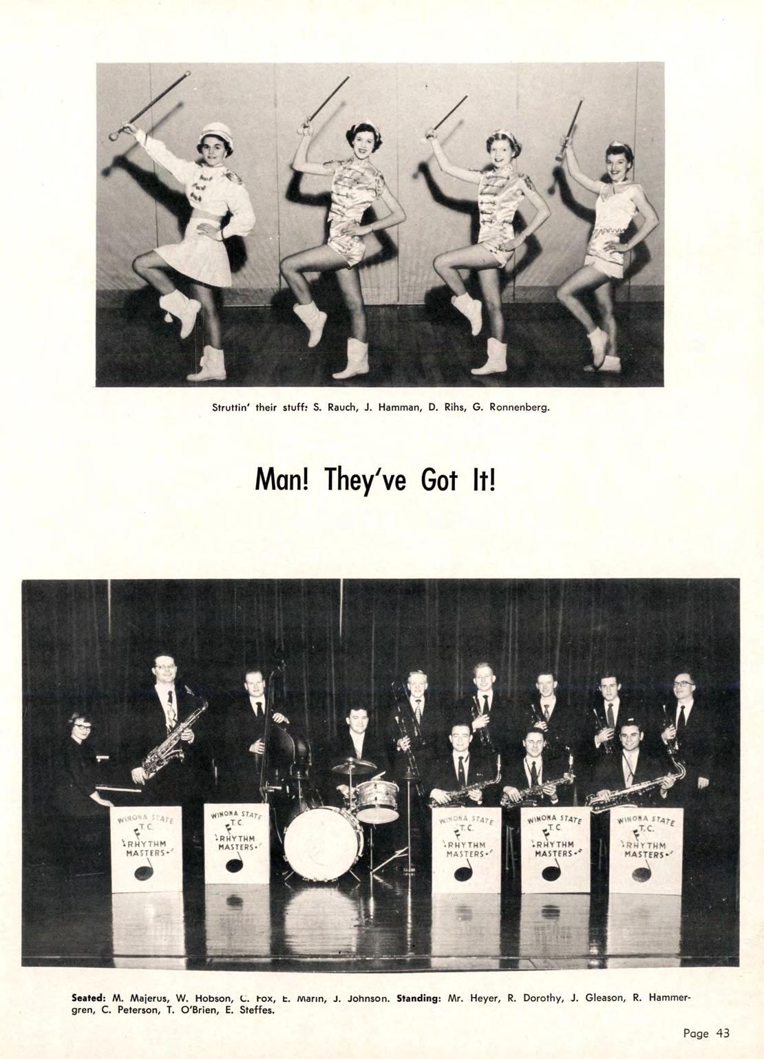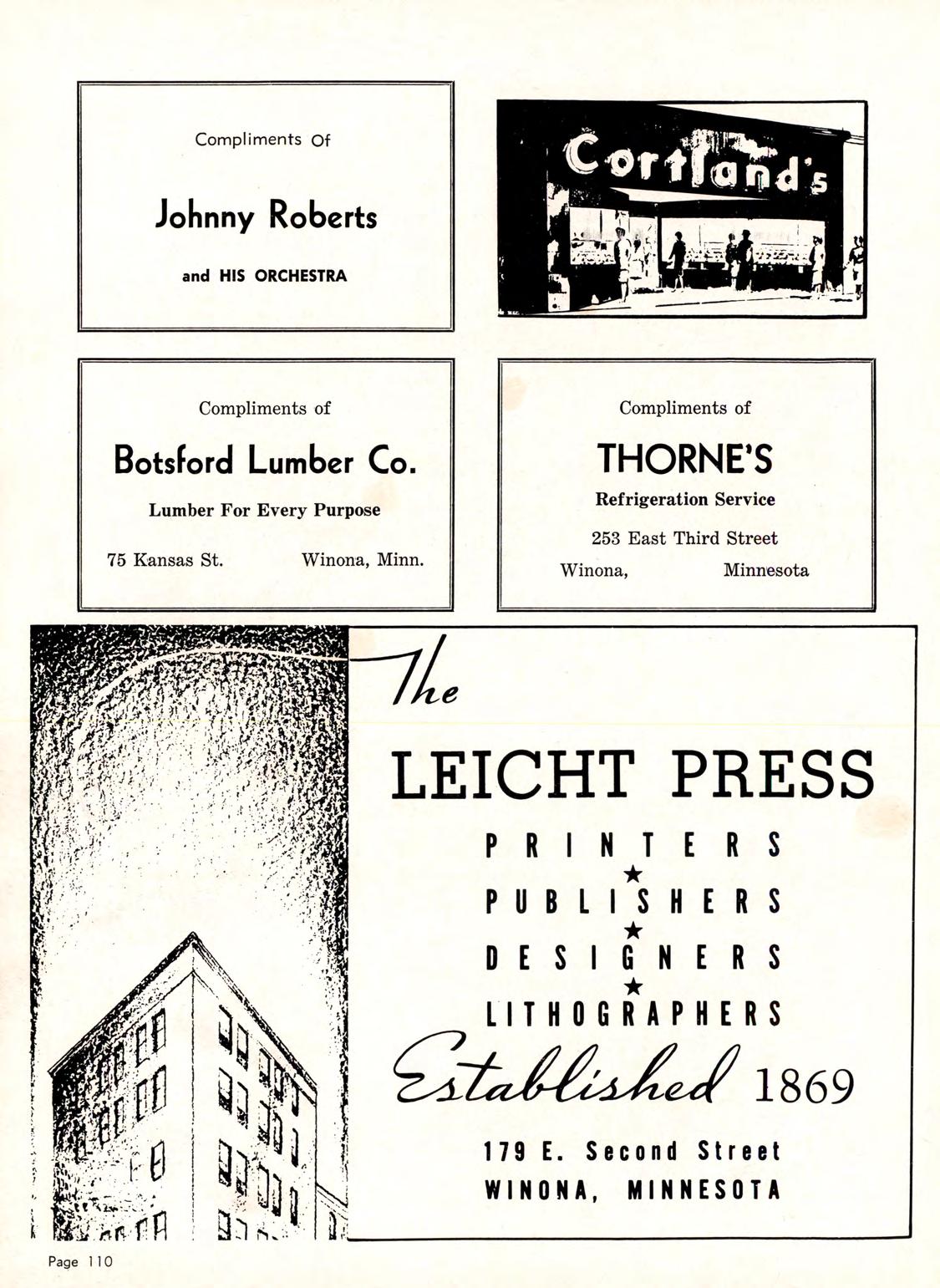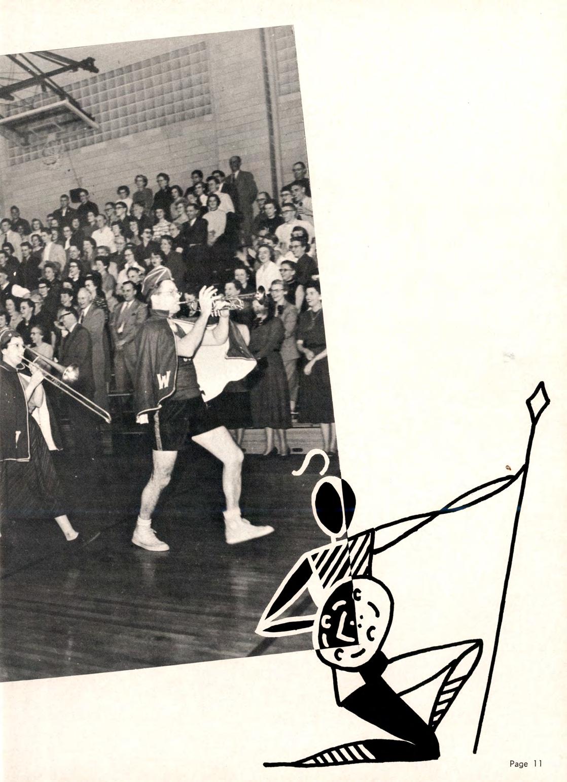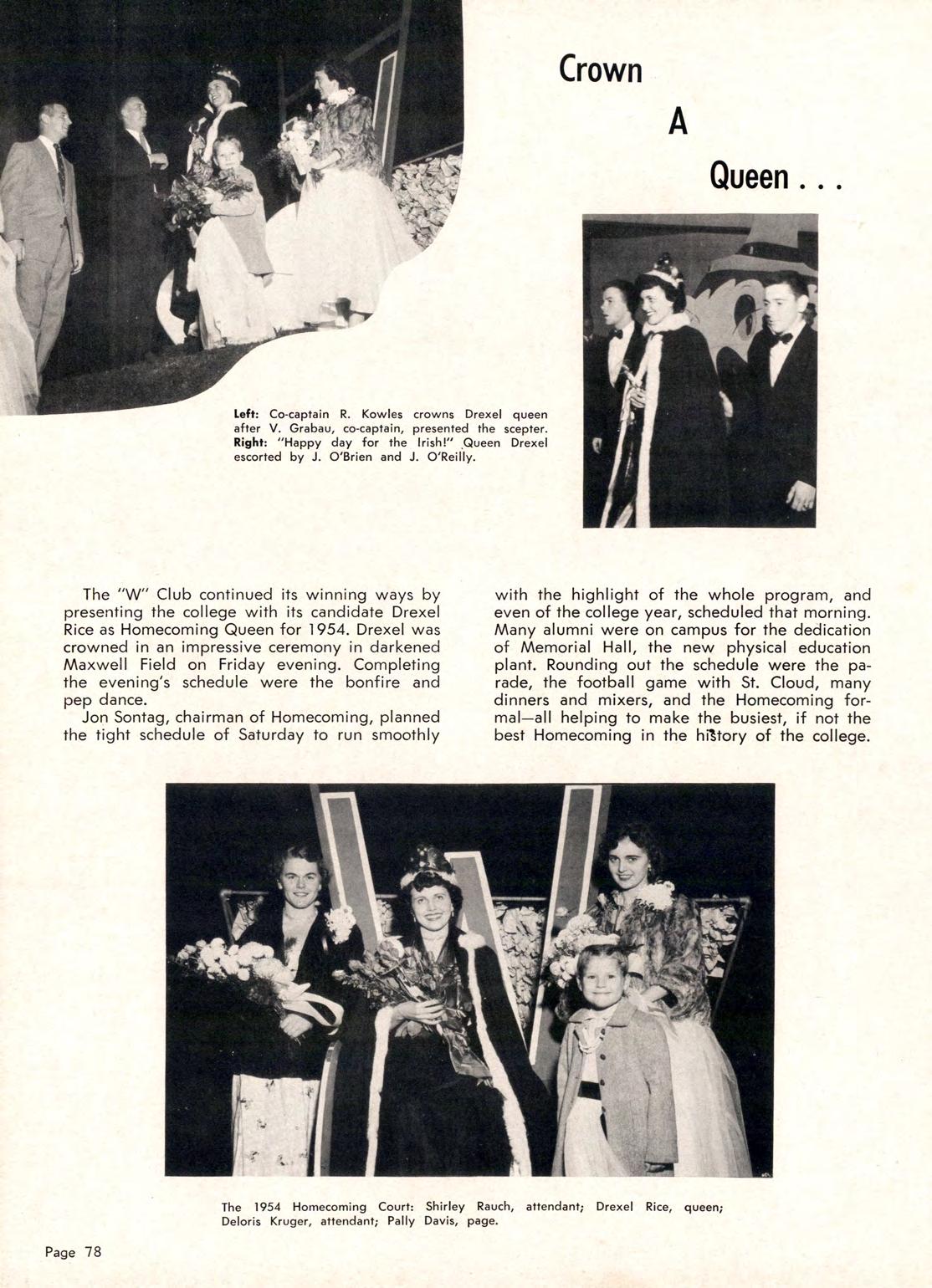 The physical education plant was dedicated during Homecoming and the inauguration of the large basketball court came in December with the Warriors beating Eau Claire. Moving-day for the physical education department followed Christmas vacation. However, the opportunities offered by Memorial Hall are not restricted to that department as its doors are open to all students of the campus and citizens of Winona and surrounding communities.
