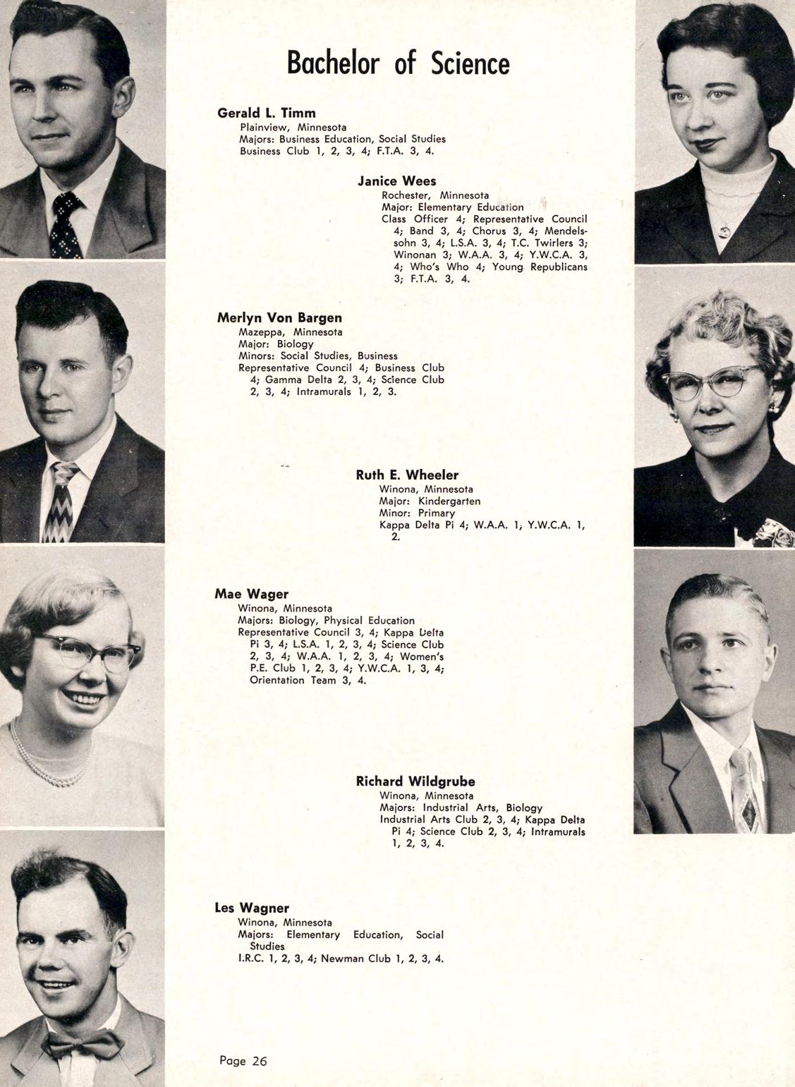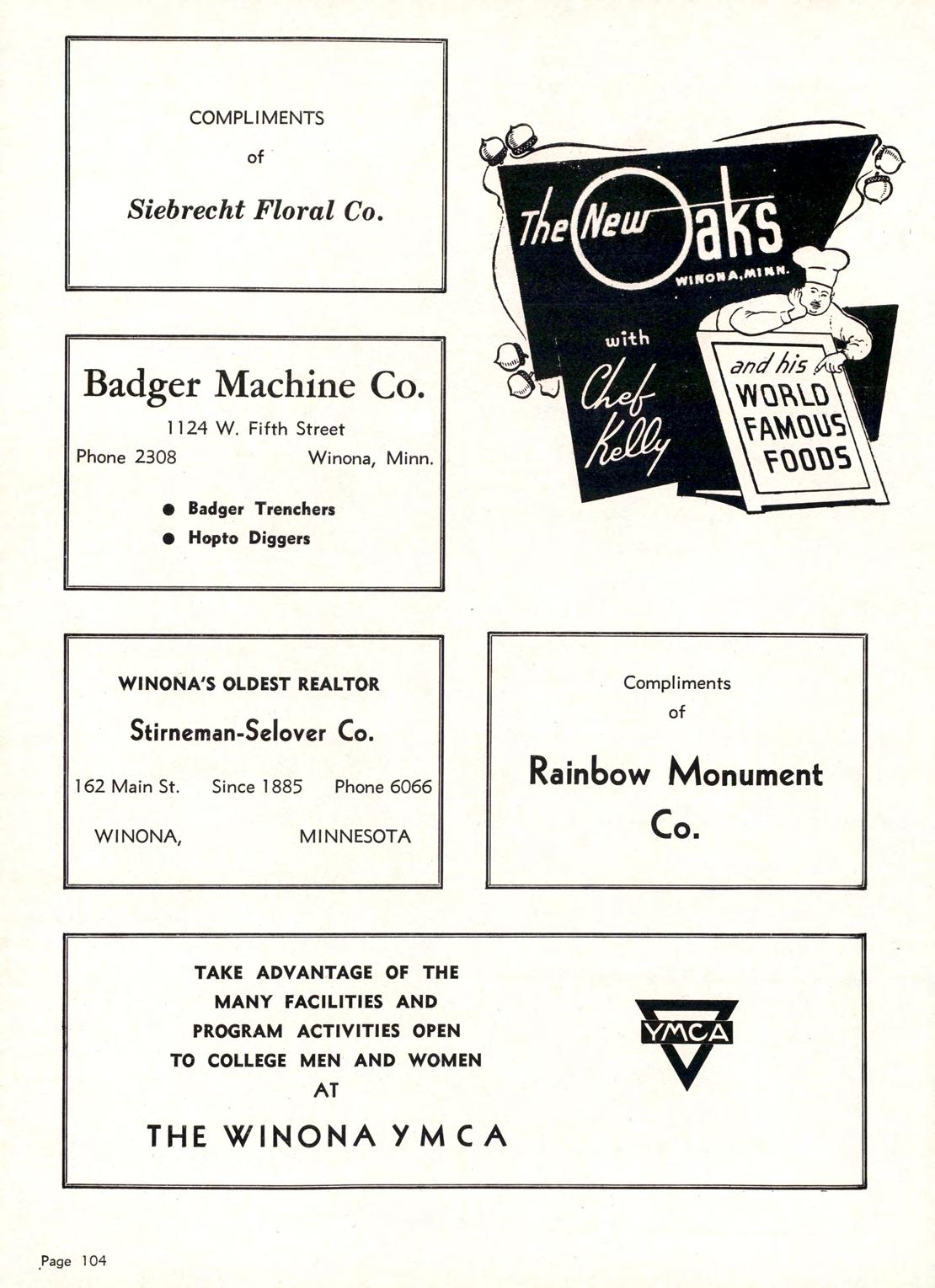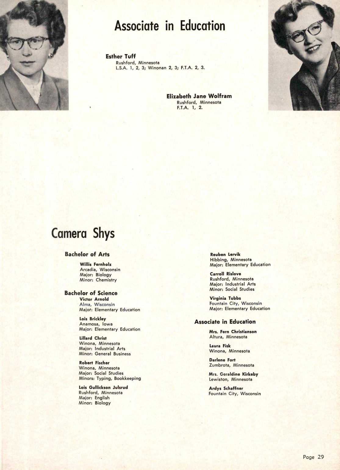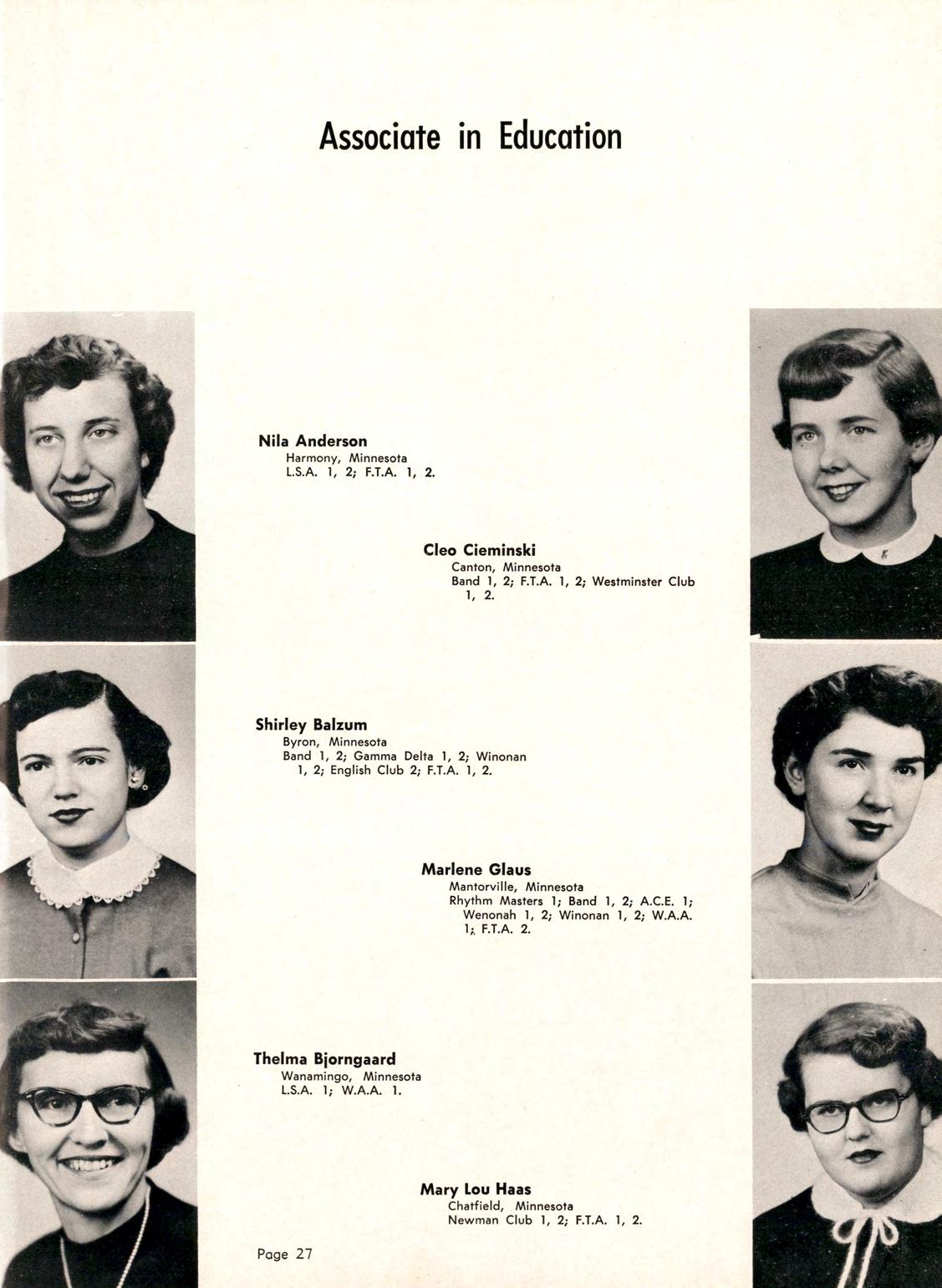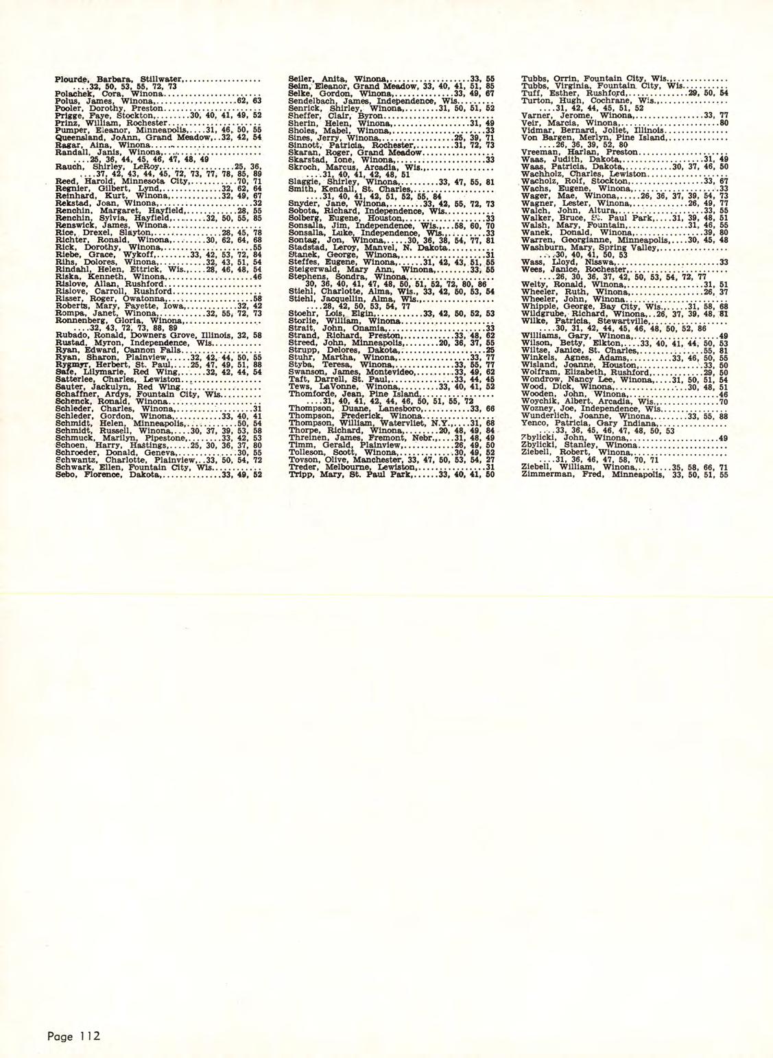 Seiler, Anita, Winona 33, 55 Seim, Eleanor, Grand Meadow, 33, 40,41,51, 85 Selke, Gordon, Winona 33, 49, 67 Sendelbach, James, Independence, Wis.... Senrick, Shirley, Winona 31, 50, 51, 52 Sheffer, Clair, Byron.... Sherln, Helen, Winona, 31, 49 Sholes, Mabel, Winona 33 Sines, Jerry, Winona, 25, 39, 71 Sinnott, Patricia, Rochester 31, 72, 73 Skaran, Roger, Grand. Meadow Skarstad, lone, Winona 33 Skroch, Marcus, Arcadia, Wls 31. 40, 41, 42, 48, 51 Slaggle, Shirley, Winona 33, 47, 55, 81 Smith, Kendall, St. Charles 31,40, 41, 42, 51, 52,55, 84 Snyder, Jane, Winona ..33, 42, 55, 72, 73 Sobota, Richard, Independence, Wls Solberg, Eugene, Houston 33 Sonsalla, Jim, Independence, Wls 58, 60, 70 Sonsalla, Luke, Indep}endence, Wis.,.. 33 Scmtag, Jon, Winona 30, 36,38,54, 77,