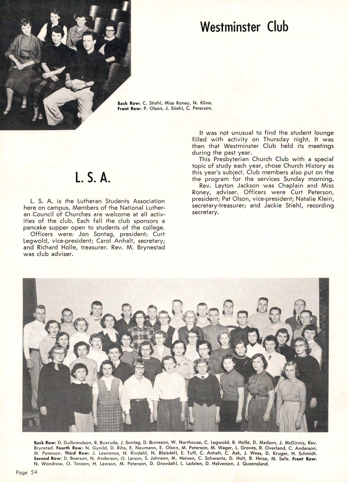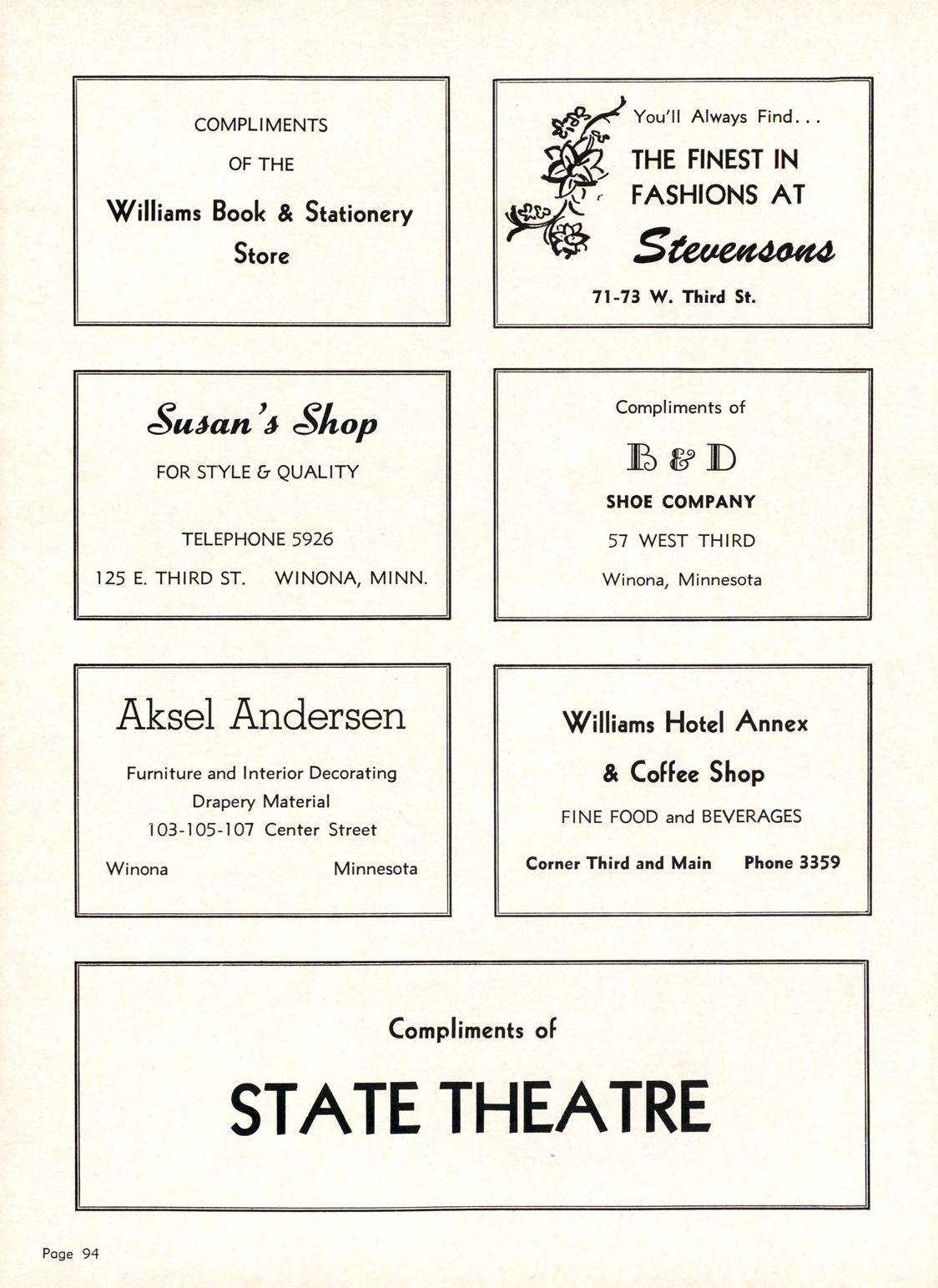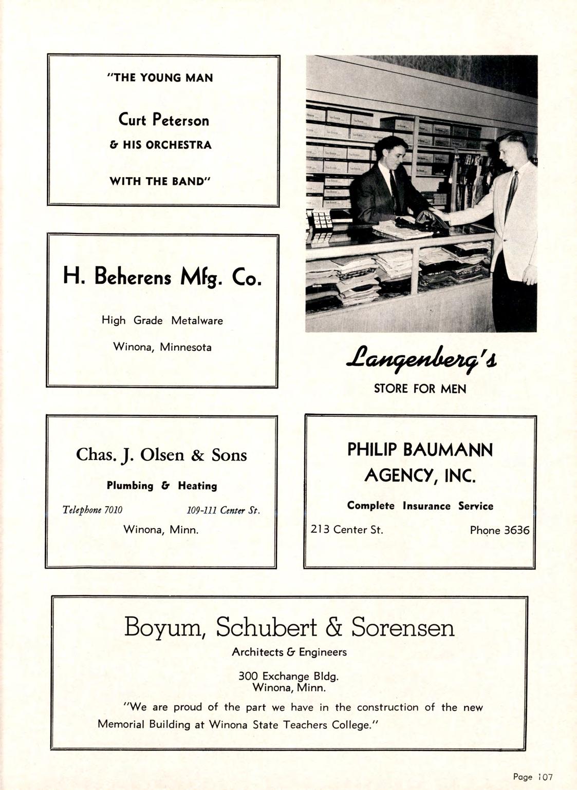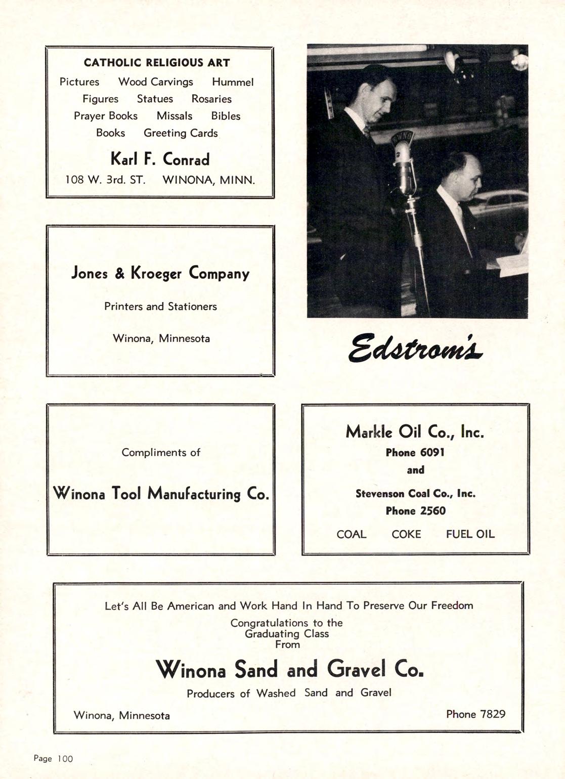 Seiler, Anita, Winona 33, 55 Seim, Eleanor, Grand Meadow, 33, 40,41,51, 85 Selke, Gordon, Winona 33, 49, 67 Sendelbach, James, Independence, Wis.... Senrick, Shirley, Winona 31, 50, 51, 52 Sheffer, Clair, Byron.... Sherln, Helen, Winona, 31, 49 Sholes, Mabel, Winona 33 Sines, Jerry, Winona, 25, 39, 71 Sinnott, Patricia, Rochester 31, 72, 73 Skaran, Roger, Grand. Meadow Skarstad, lone, Winona 33 Skroch, Marcus, Arcadia, Wls 31. 40, 41, 42, 48, 51 Slaggle, Shirley, Winona 33, 47, 55, 81 Smith, Kendall, St. Charles 31,40, 41, 42, 51, 52,55, 84 Snyder, Jane, Winona ..33, 42, 55, 72, 73 Sobota, Richard, Independence, Wls Solberg, Eugene, Houston 33 Sonsalla, Jim, Independence, Wls 58, 60, 70 Sonsalla, Luke, Indep}endence, Wis.,.. 33 Scmtag, Jon, Winona 30, 36,38,54, 77,