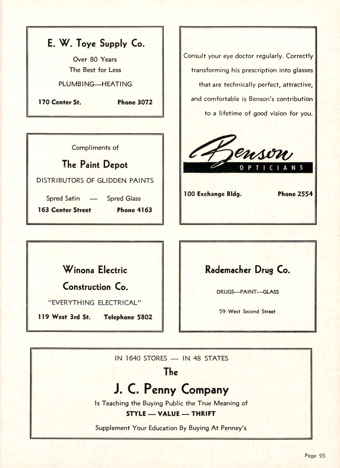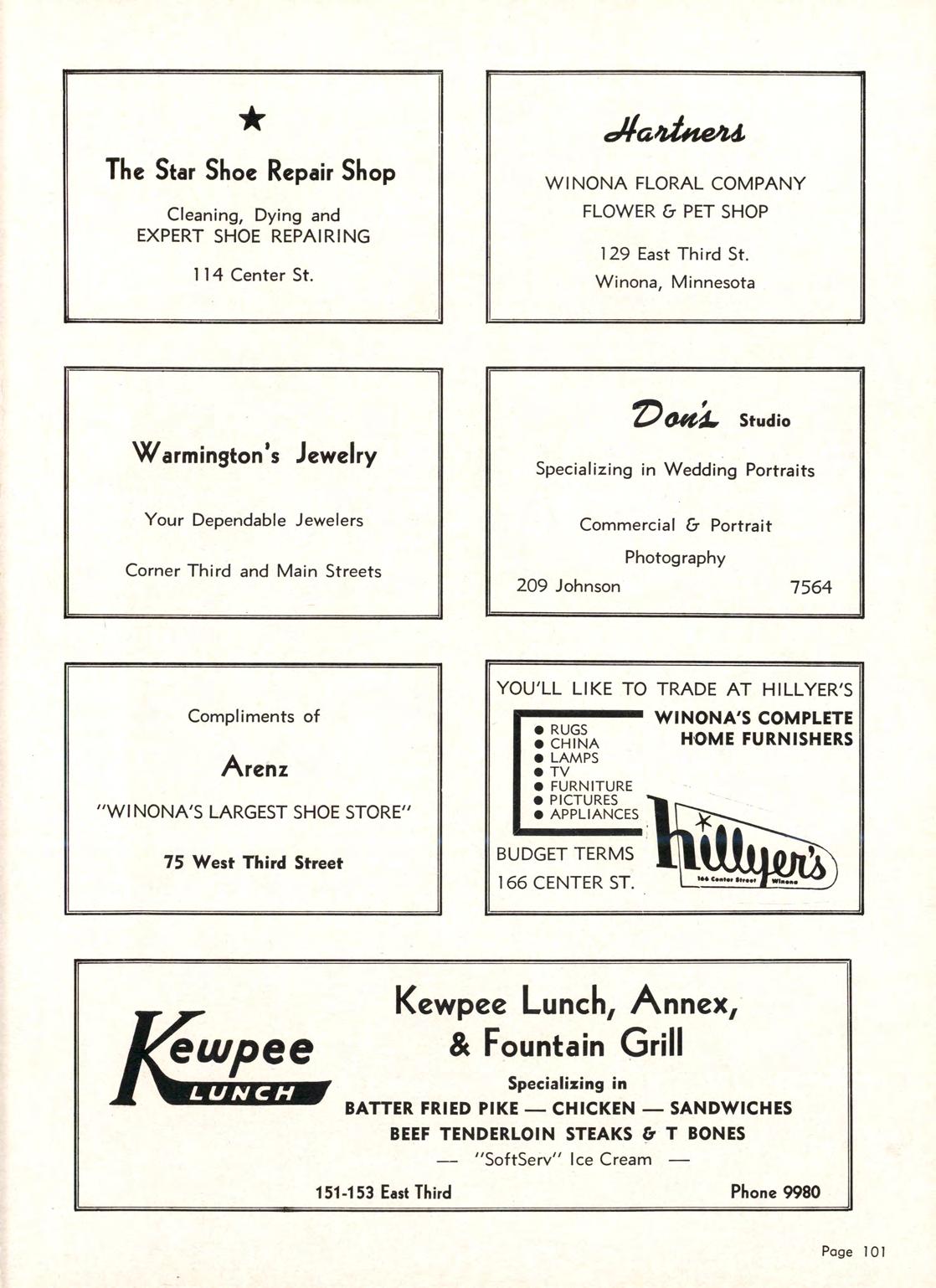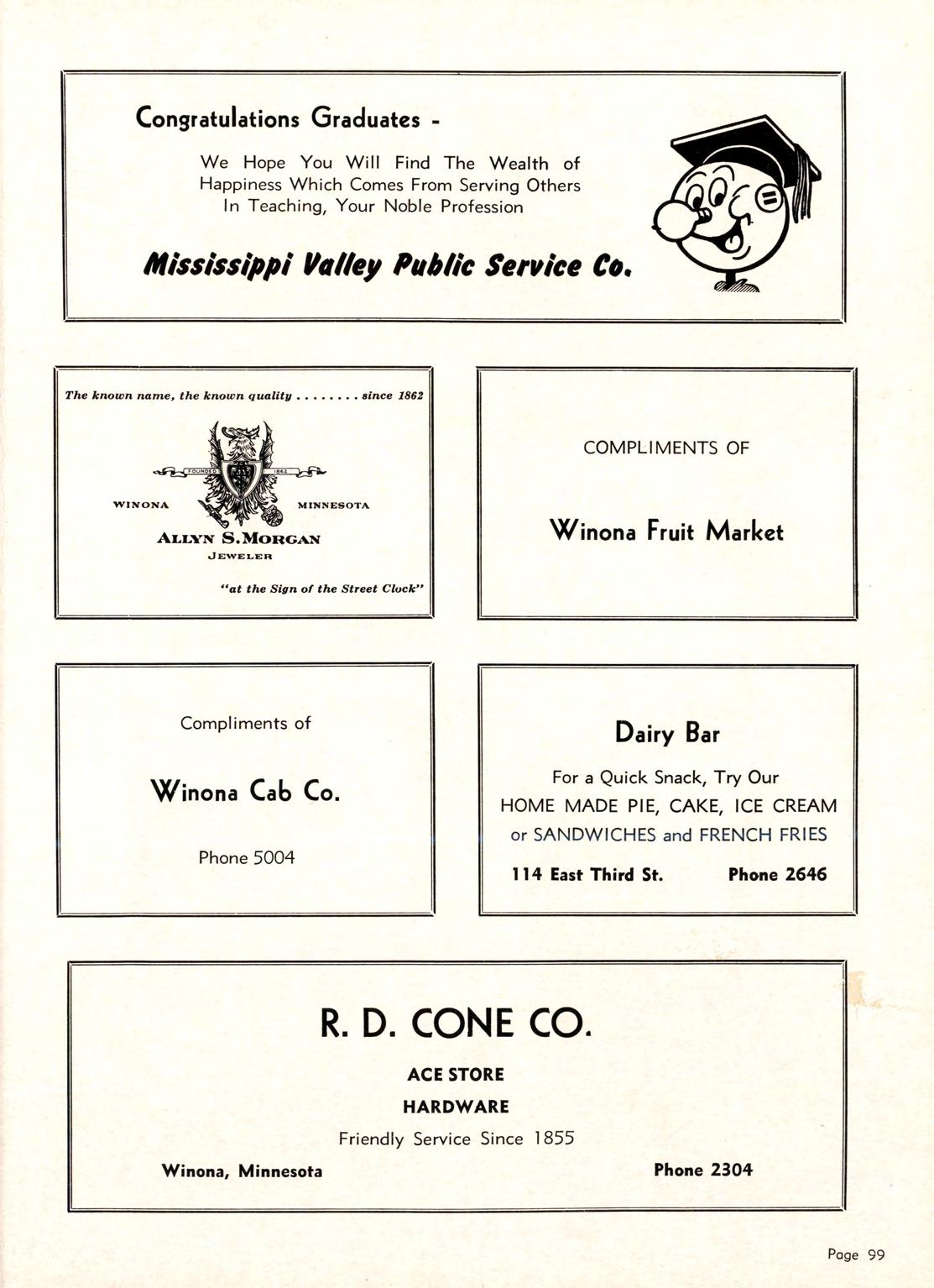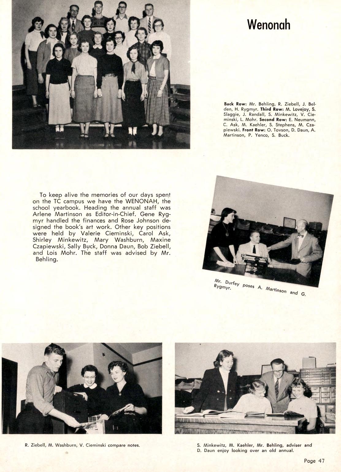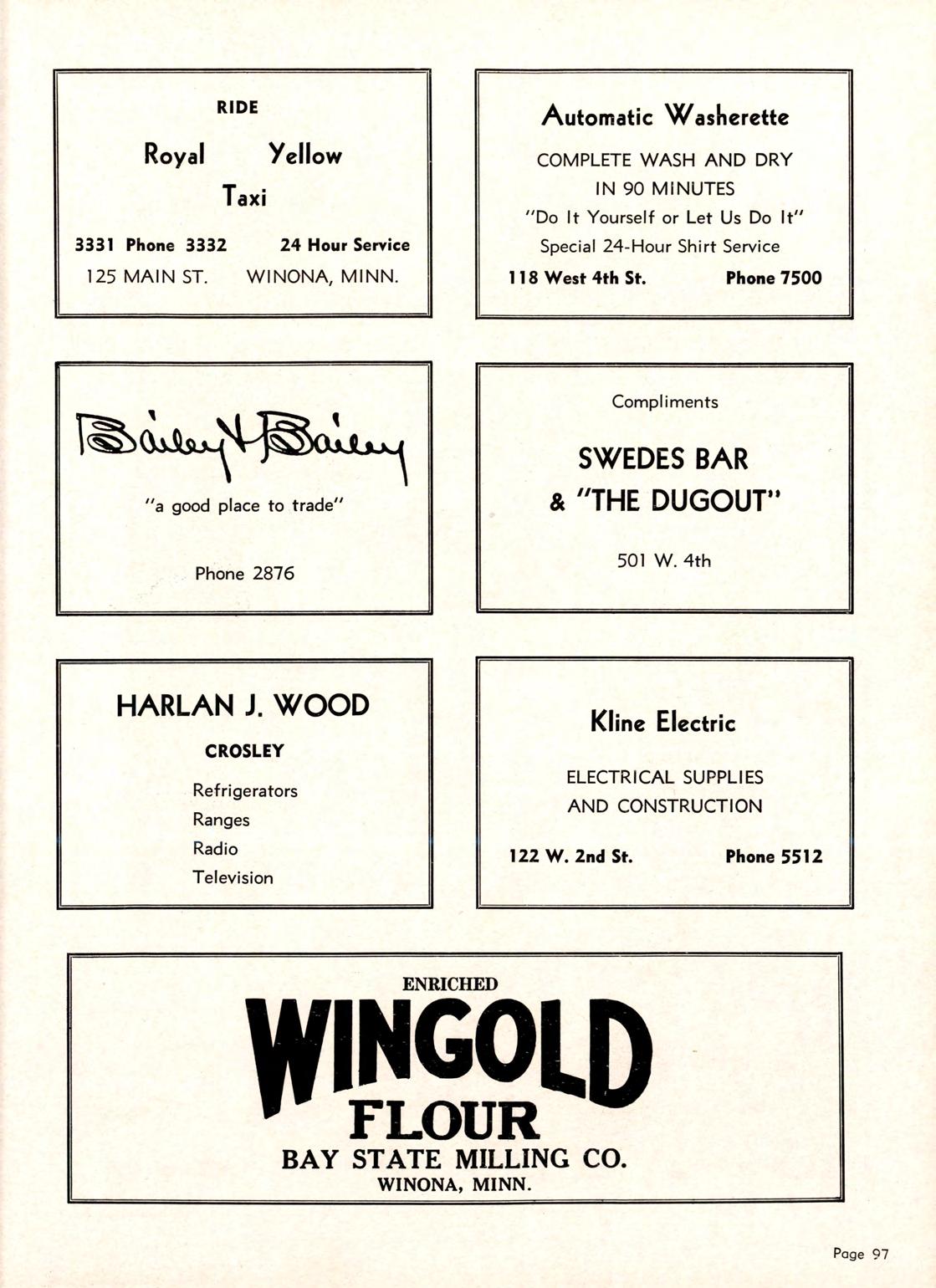 Seiler, Anita, Winona 33, 55 Seim, Eleanor, Grand Meadow, 33, 40,41,51, 85 Selke, Gordon, Winona 33, 49, 67 Sendelbach, James, Independence, Wis.... Senrick, Shirley, Winona 31, 50, 51, 52 Sheffer, Clair, Byron.... Sherln, Helen, Winona, 31, 49 Sholes, Mabel, Winona 33 Sines, Jerry, Winona, 25, 39, 71 Sinnott, Patricia, Rochester 31, 72, 73 Skaran, Roger, Grand. Meadow Skarstad, lone, Winona 33 Skroch, Marcus, Arcadia, Wls 31. 40, 41, 42, 48, 51 Slaggle, Shirley, Winona 33, 47, 55, 81 Smith, Kendall, St. Charles 31,40, 41, 42, 51, 52,55, 84 Snyder, Jane, Winona ..33, 42, 55, 72, 73 Sobota, Richard, Independence, Wls Solberg, Eugene, Houston 33 Sonsalla, Jim, Independence, Wls 58, 60, 70 Sonsalla, Luke, Indep}endence, Wis.,.. 33 Scmtag, Jon, Winona 30, 36,38,54, 77,