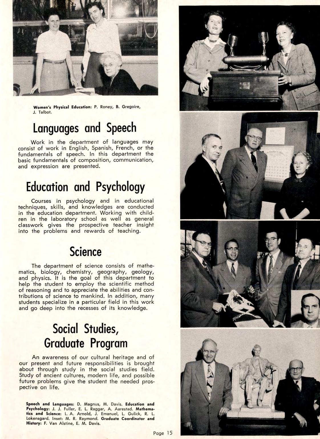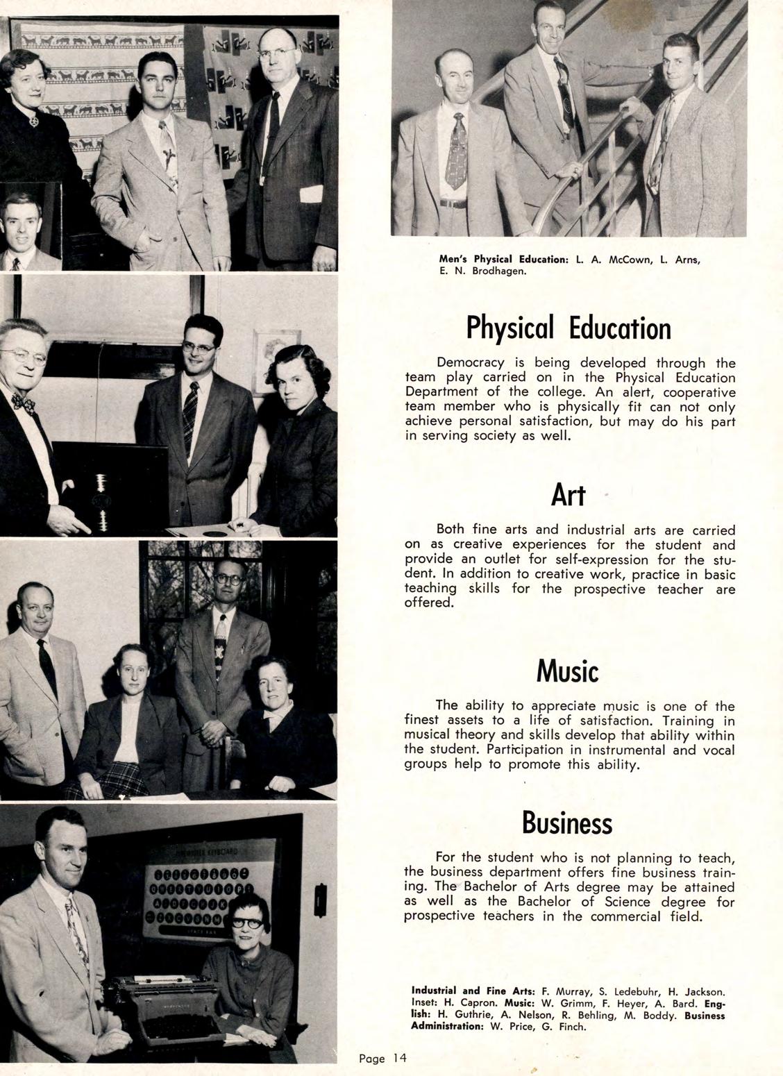 Men's Physical Education: L. A. McCown, L. Arns, E. N. Brodhagen.Work in the department of languages may consist of work in English, Spanish, French, or the fundamentals of speech. In this department the basic fundamentals of composition, communication, and expression are presented.
