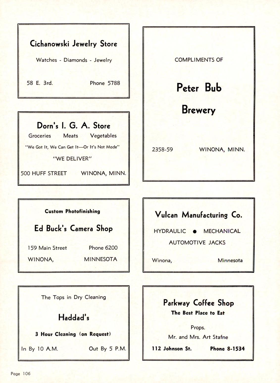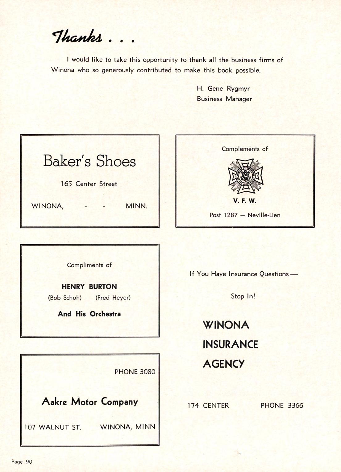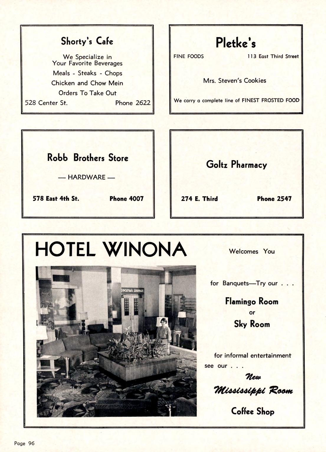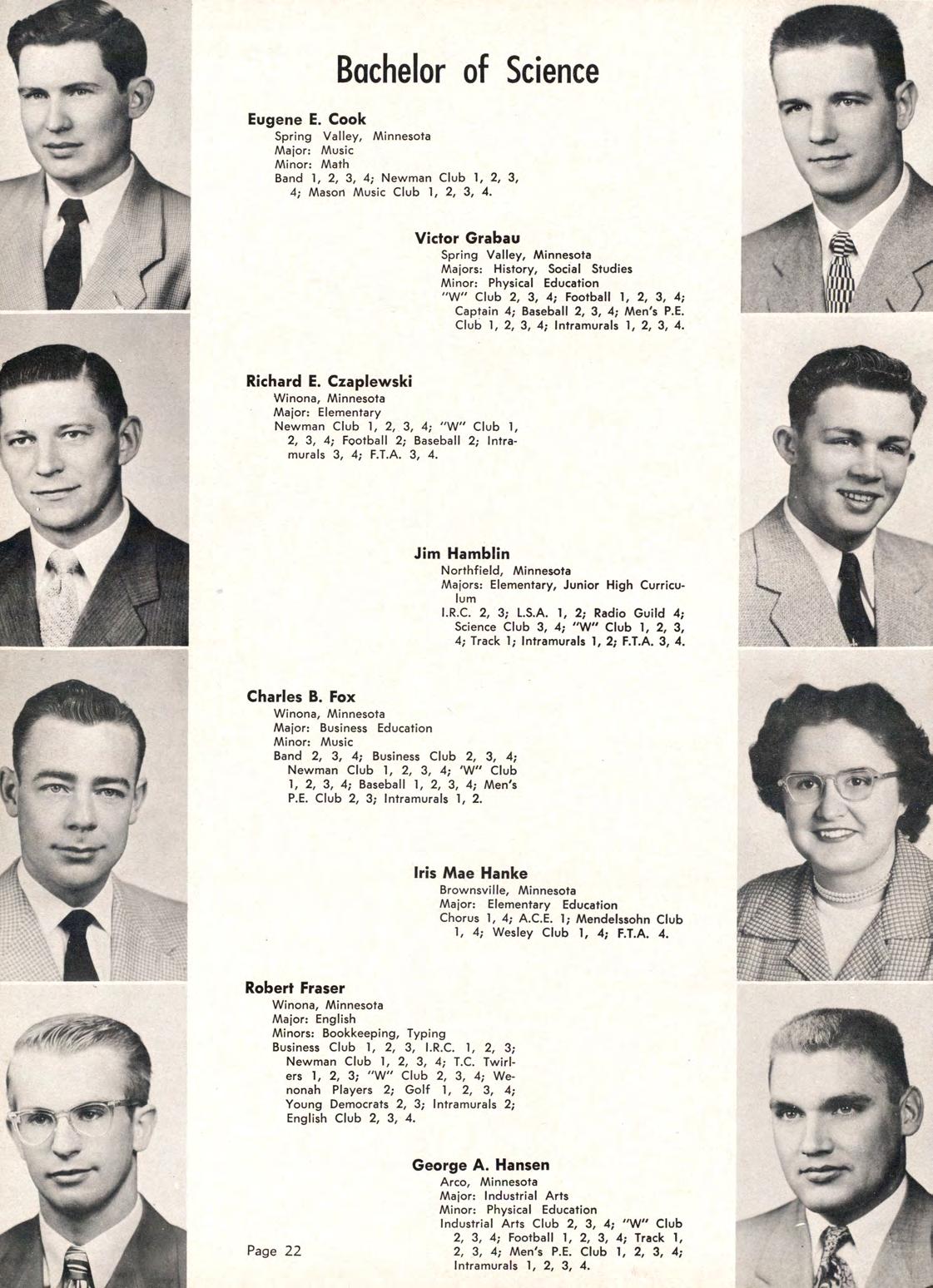 36, 40, 41,42,45, 46, 50, 51,54, 88 Haak, Gloria, Plainview 32, 50,52, 72 Haakenstad, Shirley, Mabel 31, 72, 73 Haas, Mary Lou, Chatfield 27, 50 Habeck, Kenneth, Winona 67 Habeck, Ronald, Winona 49, 58 Hagedom, Charles, Winona 31, 42, 49, 52, 70, 71 Haley, Nancy, Winona 33, 55 Halverson, Delayne, Canton 33, 40, 41, 42, 44, 48, 54 Hamblin, James, Northfleld 22 Hamilton, Mrs. N. E., Winona Hammann, Judith, Winona,... 32, 39, 43, 44, 55 Hammergren, Richard, Cochrane, Wis ....33, 43. 51 Hampton, Gene, Bloomington, Wis Hanke, Iris, Brownsville 22, 40, 41, 50 Hansen, Arlene, Dodge Center