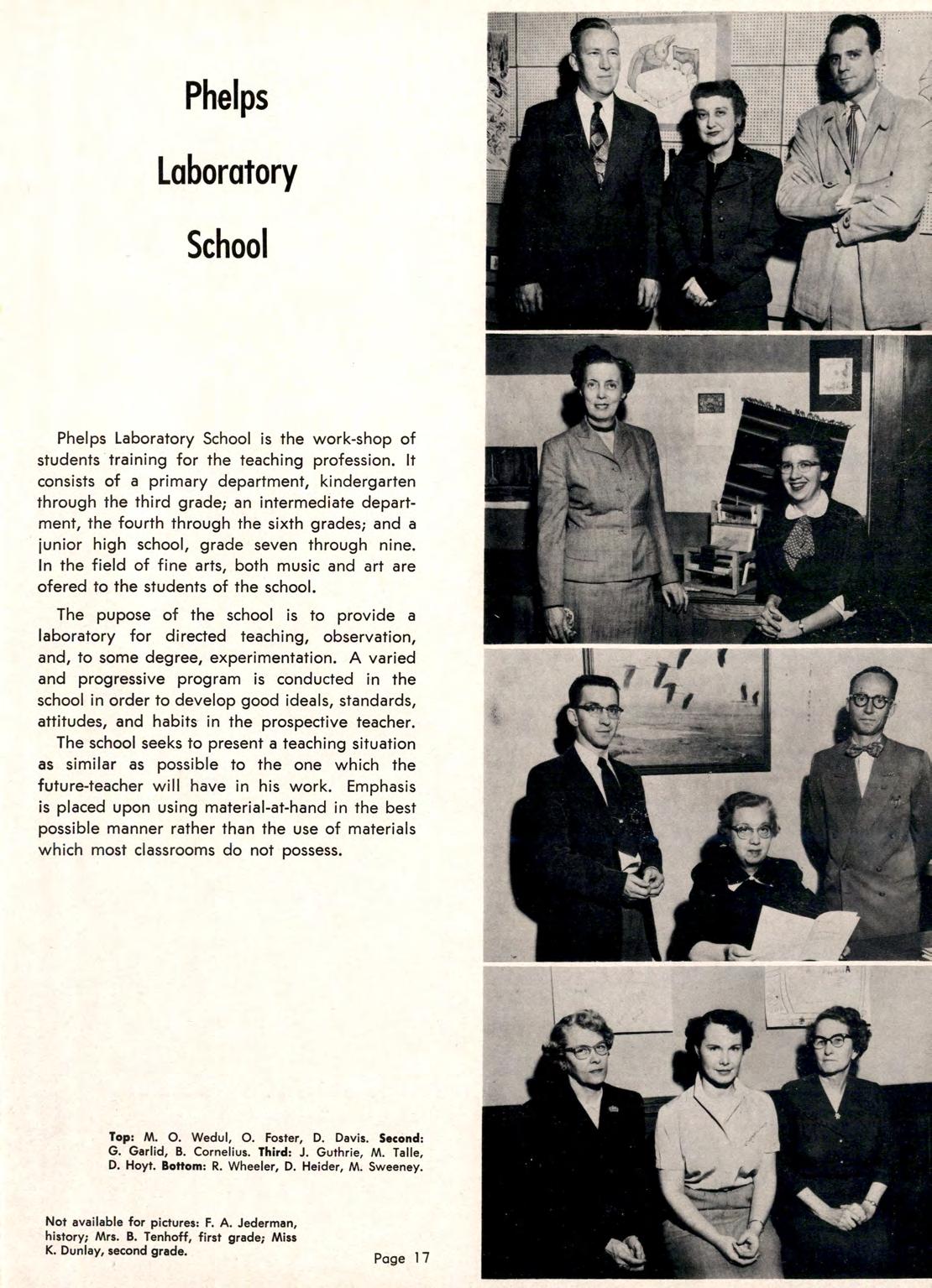 Phelps Laboratory School is the work-shop of students training for the teaching profession. It consists of a primary department, kindergarten through the third grade; an intermediate department, the fourth through the sixth grades; and a junior high school, grade seven through nine. In the field of fine arts, both music and art are ofered to the students of the school.