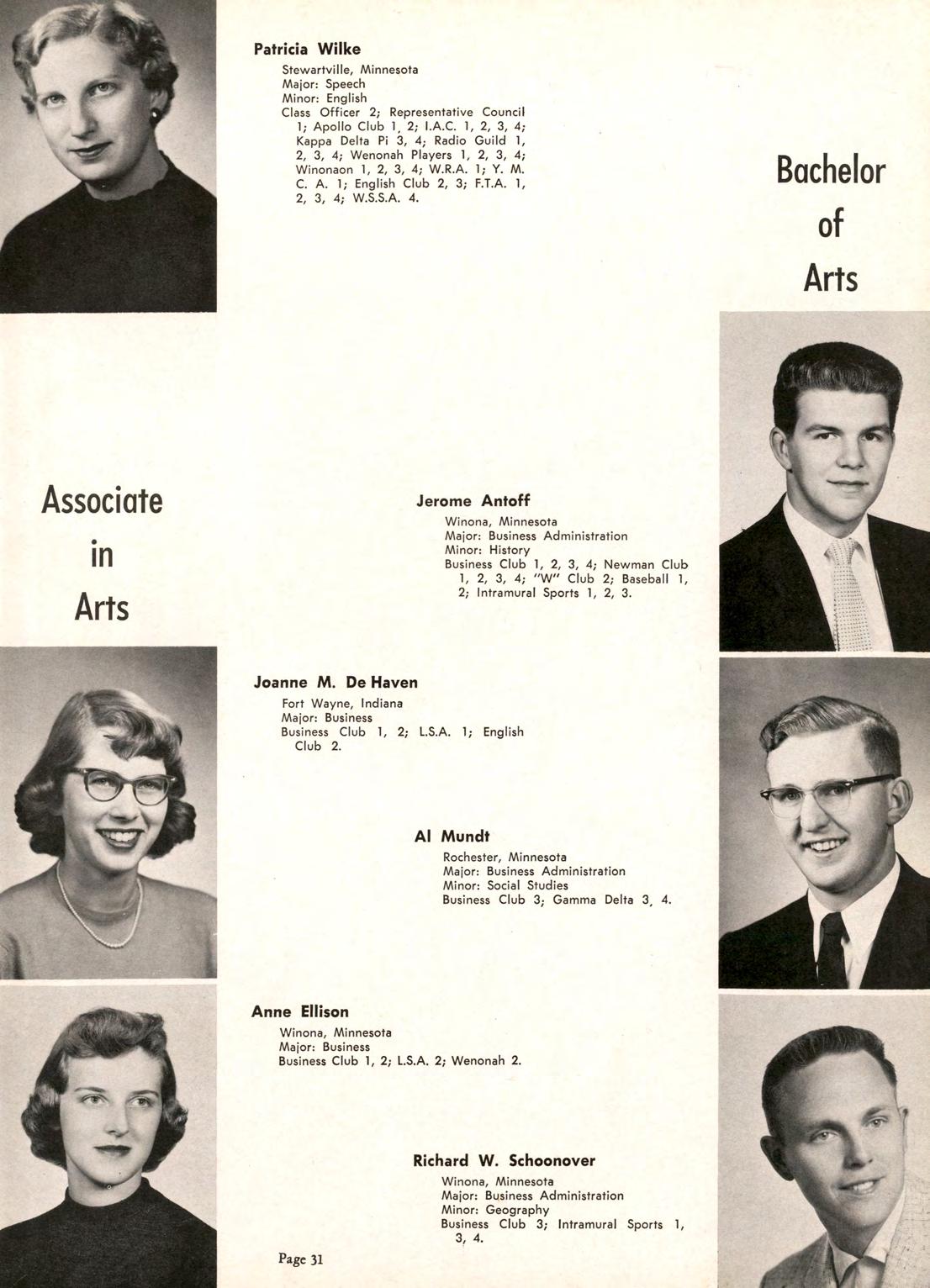 Class Officer 2; Representative Council 2; Wenonah 4; Wenonah Players 4; Winonan 4; Wesley Foundation 1, 2; Orientation Team 3; Young Republican's Club 4; English Club 3, 4; Canterbury Club 4; F.T.A. 1, 2.