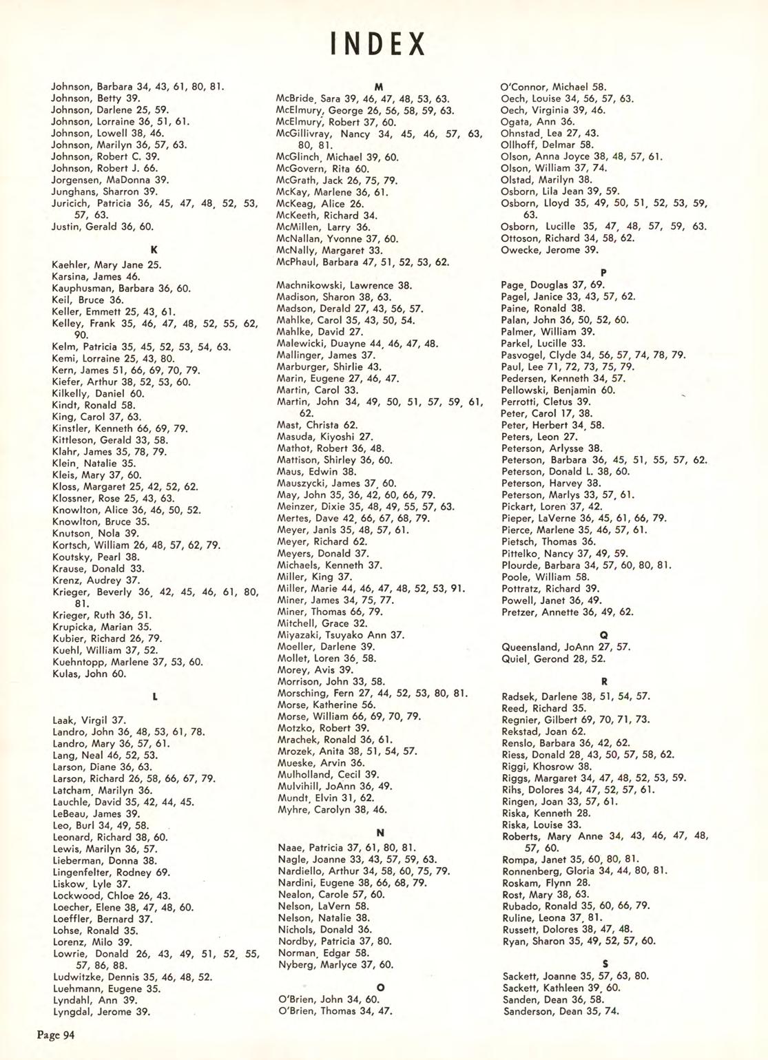Major: Kindergarten Primary Class Officer 3; Representative Council 3, 4; Kappa Delta Pi 3, 4; Winonan 1, 2, 3; Y.W.C.A. 2, 3, 4; Who's Who 4; Orientation Team 4; Homecoming Attendant 4; Canterbury Club 1, 2, 3, 4; F.T.A. 1, 2, 3, 4.