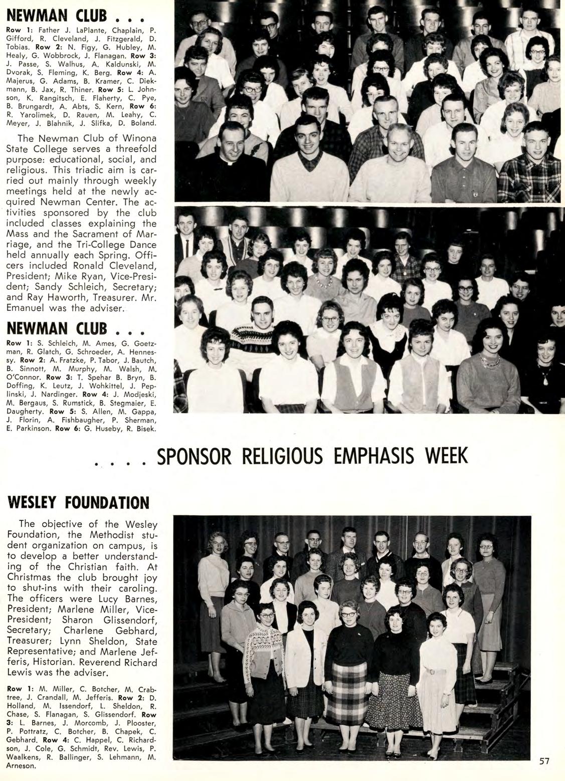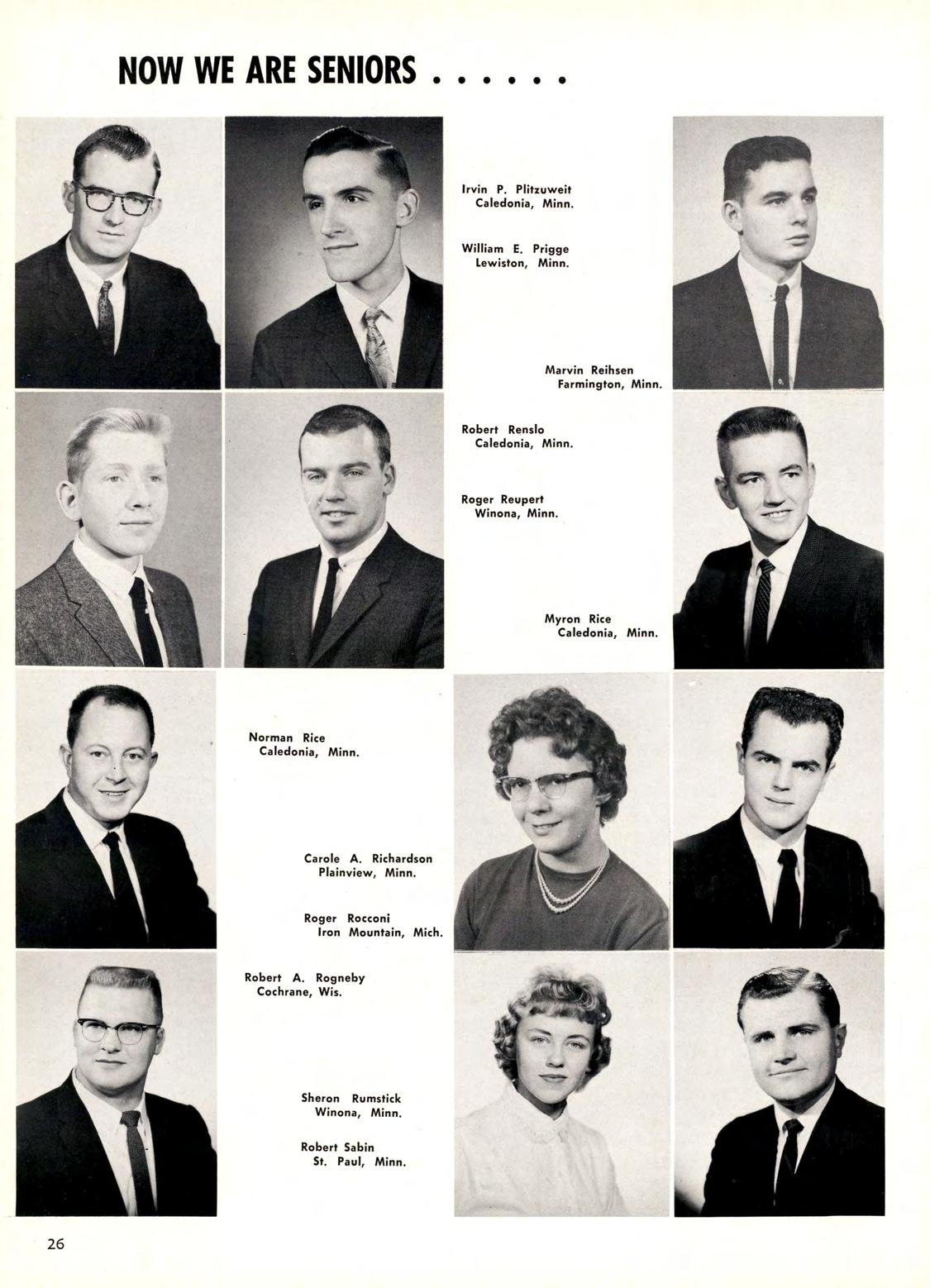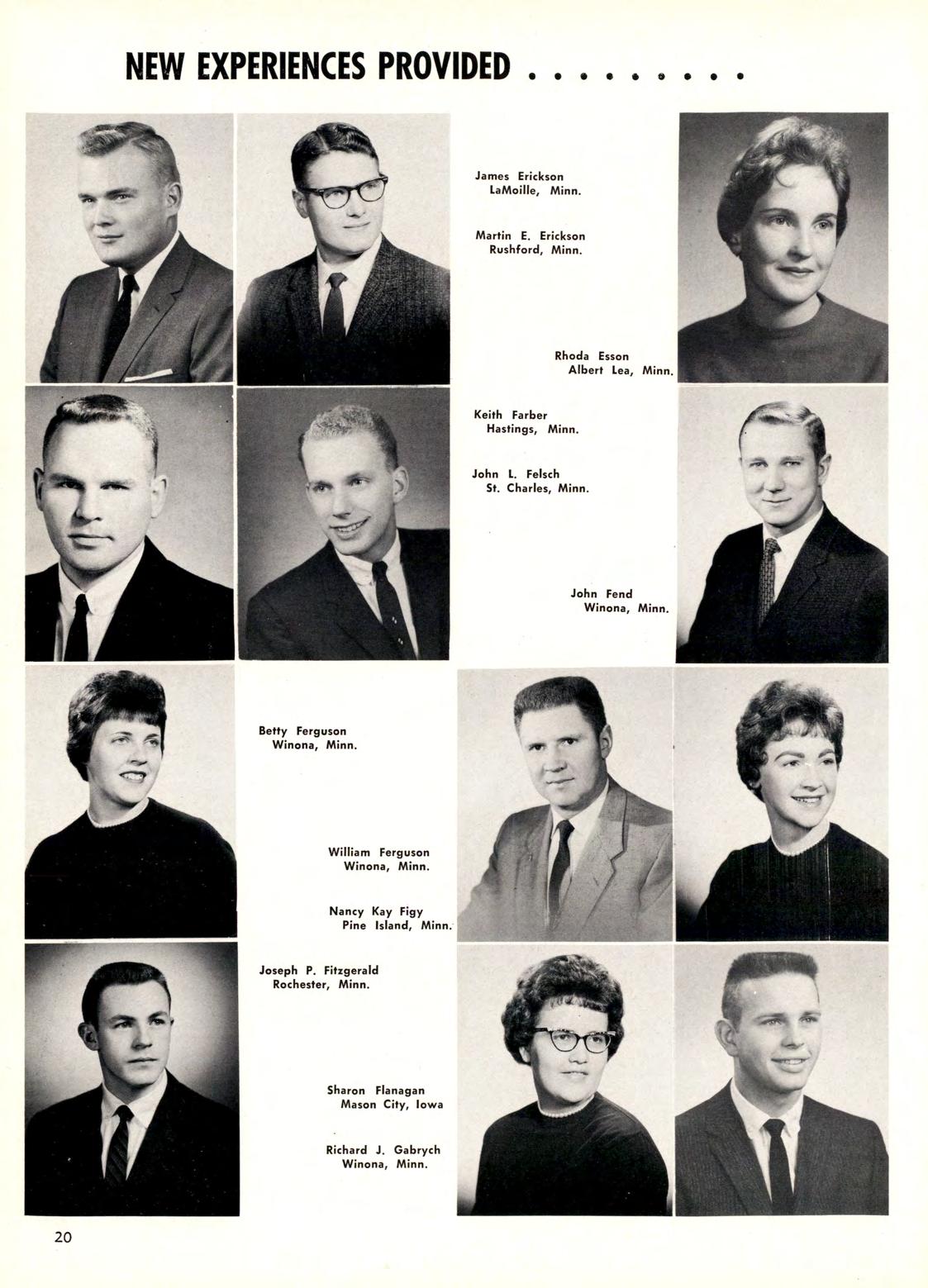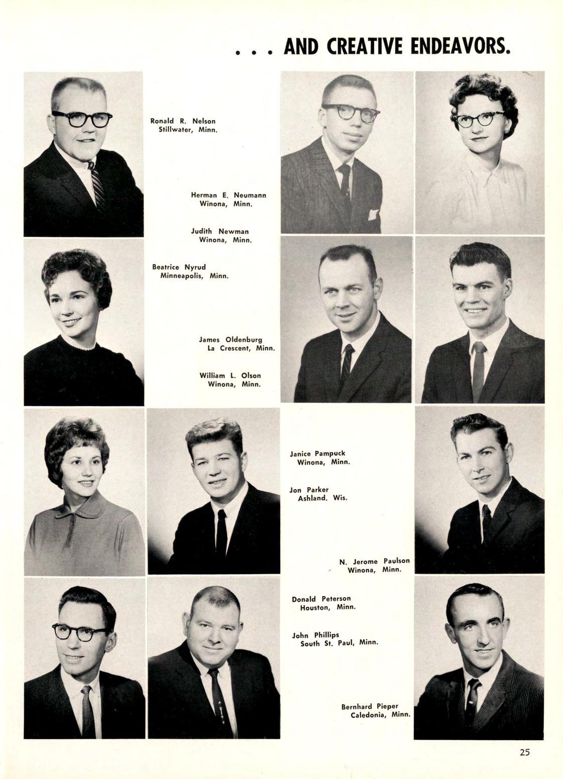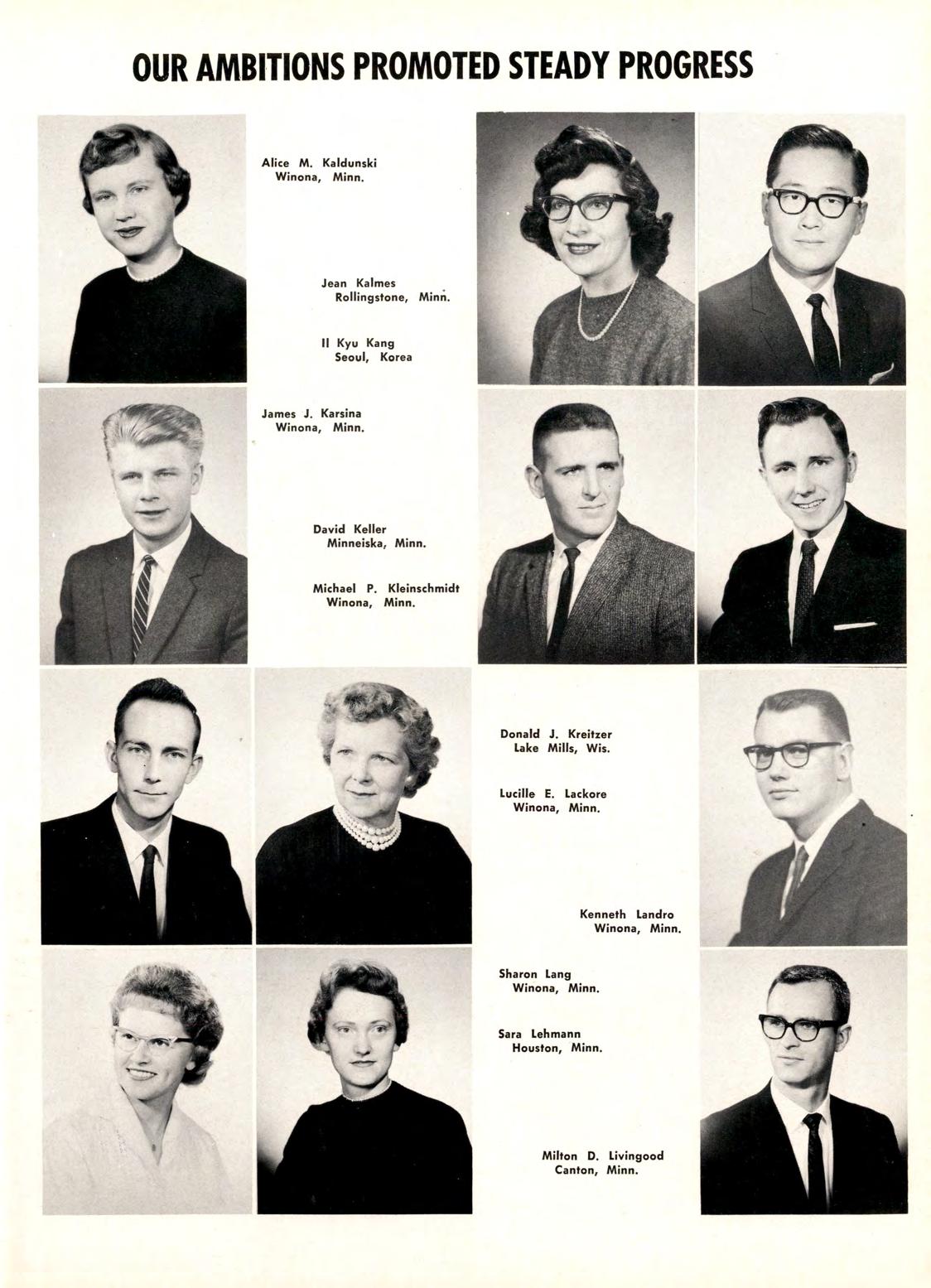 Twenty-one Seniors at Winona State College were nominated to Who's Who Among Students in American Universities and Colleges. An annual publication will list their names among those of similar standing from other higher educational institutions. Nominees are Robert Cameron, Ronald Cleveland, Rhoda Esson, Diane Whittier, Joseph Fitzgerald, Sharon Flanagan, David Glazier, David Harris, Sally Hartle, Wanda Hellickson, Doris Jick, Lucille Lackore, Kenneth Landro, Sharon Lang, Gerald McCartney, Ardell Meyer, Bernhard Pieper, Irvin Plitzuweit, Robert Sabin, Mary Schwager, and Howard Schwind.