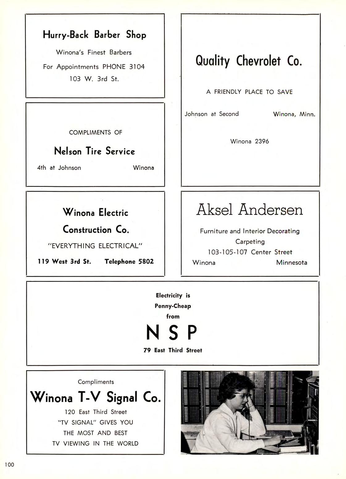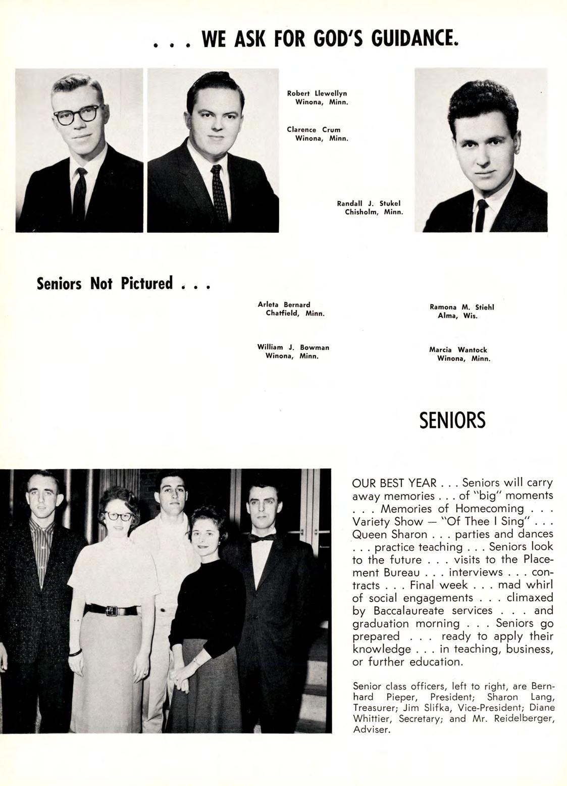 Coordinated efforts are present in the work of the Administration at Winona State College. Basic in the aims of the college program is the helping of the prospective teachers to grow in understanding the physical and mental problems met in teaching. Education for prospective teachers and businessmen includes a program of selfrealization and growth as well as a wealth of background and information. Teaching skills and techniques are taughtthrough the observationparticipation and supervised teaching programs. Curriculum changes are made to keep in step with the students and with the world. Changes in the needs of the students bring about changes in the type of work presented in the college as well as in the methods of presentation. In collaboration with the college deans and supervisors, this department also handles student counseling, housing, recruiting programs, and financial matters.