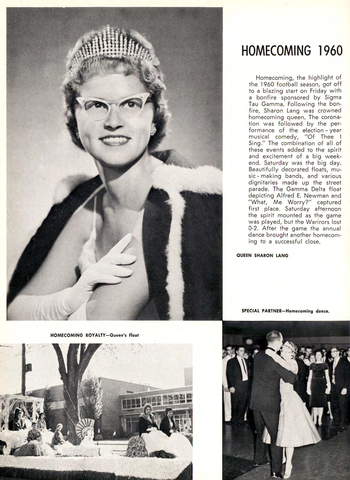 Homecoming, the highlight of the 1960 football season, got off to a blazing start on Friday with a bonfire sponsored by Sigma Tau Gamma. Following the bonfire, Sharon Lang was crowned homecoming queen. The coronation was followed by the performance of the electionyear musical comedy, "Of Thee I Sing." The combination of all of these events added to the spirit and excitement of a big weekend. Saturday was the big day. Beautifully decorated floats, music-making bands, and various dignitaries made up the street parade. The Gamma Delta float depicting Alfred E. Newman and "What, Me Worry?" captured first place. Saturday afternoon the spirit mounted as the game was played, but the Warirors lost 0-2. After the game the annual dance brought another homecoming to a successful close.