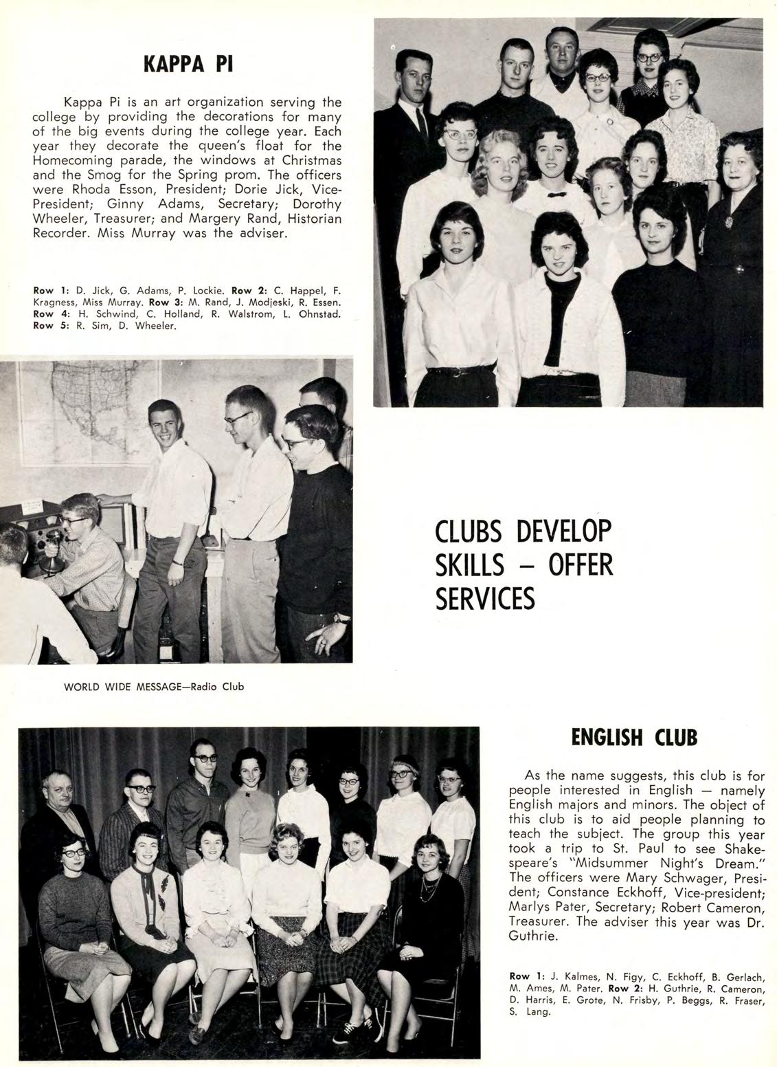 Activity was a keynote of the Etta Hudson Howell Chapter of the S.N.E.A. throughout the 1960-61 school year. One of the larger clubs on campus, it is open to all students who plan to enter the teaching profession. Monthly meetings featured mock interviews, films, and interesting speakers. This year theclub sponsored the Sham Rock, a Spring Registration dance; the Christmas Seal Drive; and a Homecoming queen candidate. Several members attended the M.E.A. Convention held in St. Paul in October and the Spring Convention held in Bemidji. The officers were Charles Carstensen, President; Sally Hartle, Vice-President; Lois Bergsgaard,Secretary; Wanda Hellickson, Treasurer; and Judith Santelman, Reporter. The advisers were Miss Aarestad and Dr. Wedul.