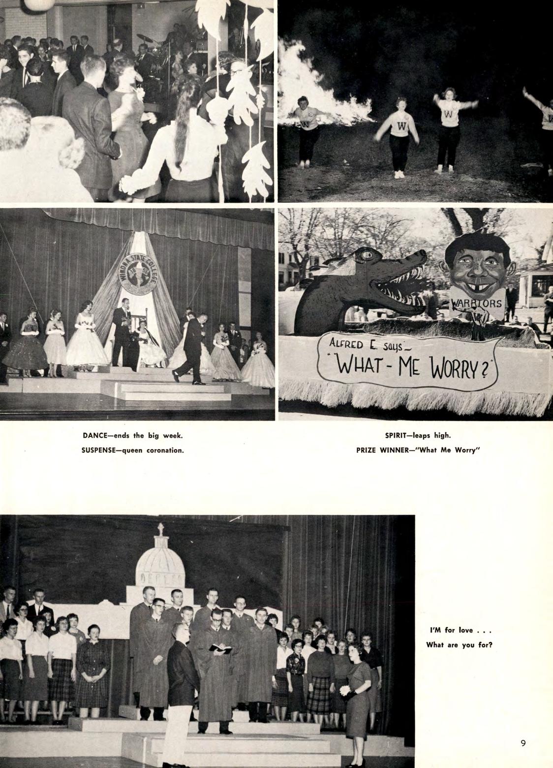 DANCE—ends the big week. SPIRIT-leaps high. SUSPENSE—queen coronation. PRIZE WINNER-"What Me Worry"