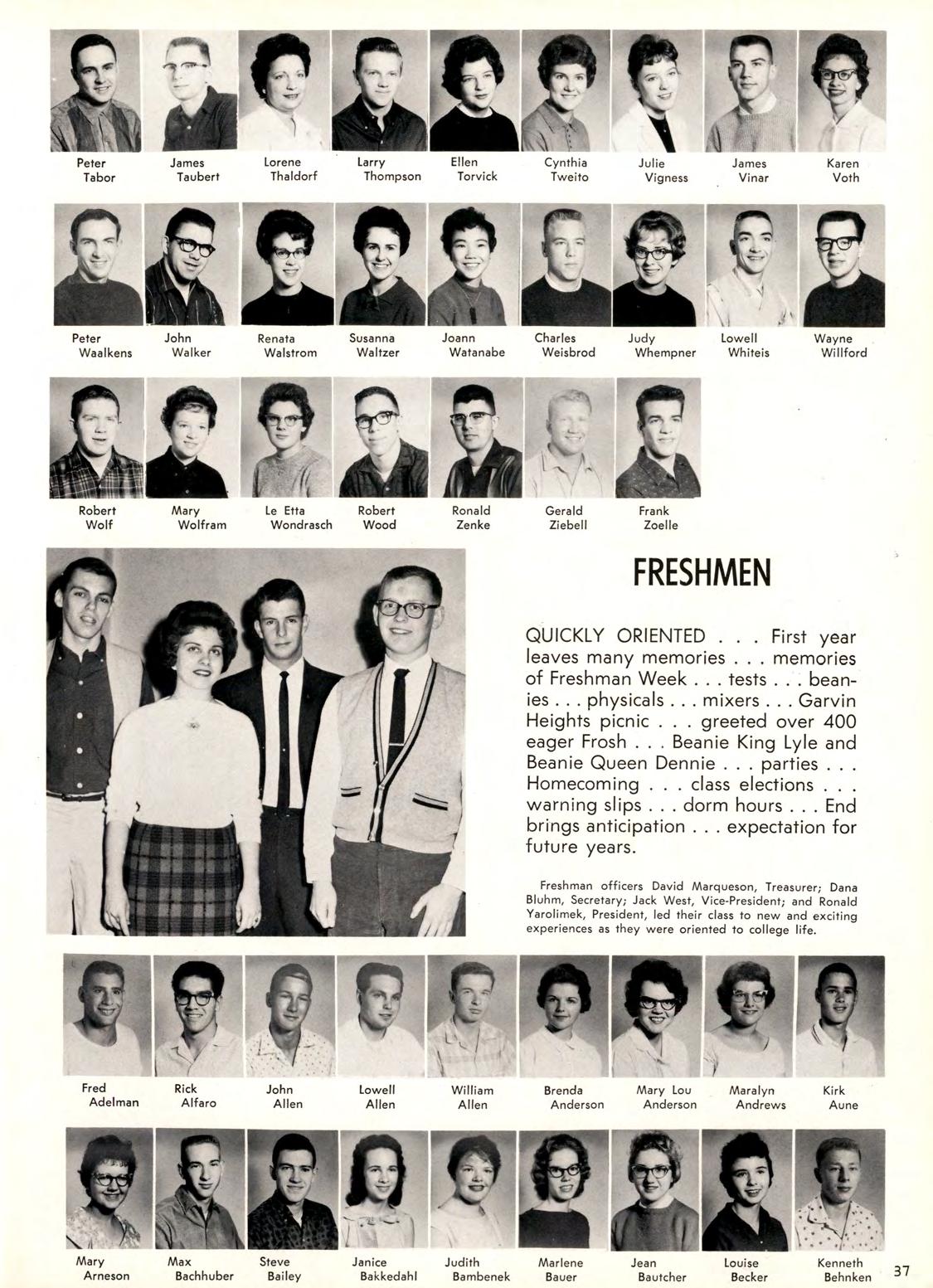 Rose Robert Carol John Lorraine Thiner Trygstad Underdahl Urness Wachs Robert Donald Whitworth Wilkie Jo Ann Yamamoto Sandra Dick Waiczak Wells Carol Colleen Muriel Clarence Thomas LorindaQUICKLY ORIENTED First year leaves many memories memories of Freshman Week tests beanies physicals mixers Garvin Heights picnic greeted over 400 eager Frosh Beanie King Lyle and Beanie Queen Dennie parties