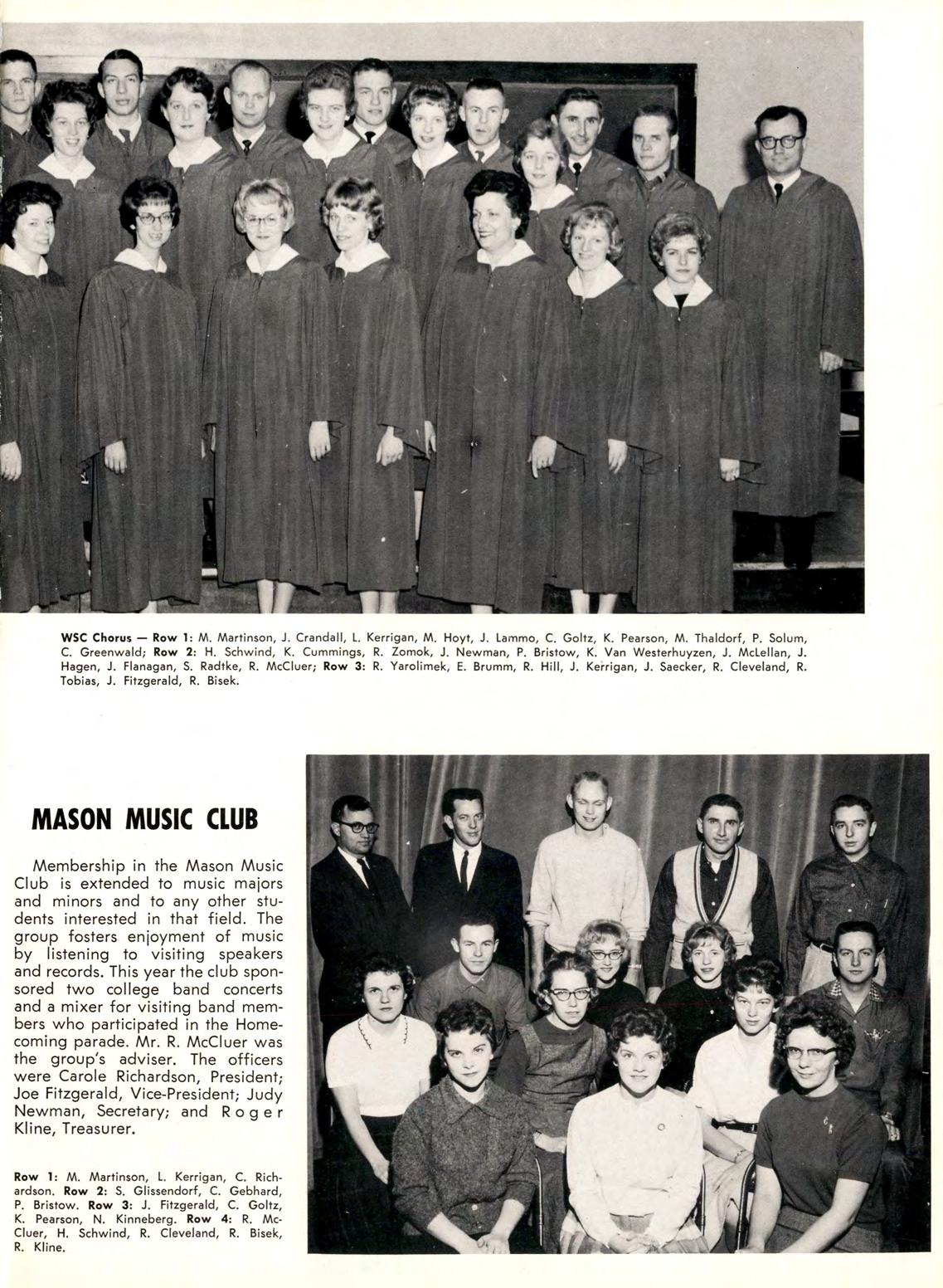 Membership in the Mason Music Club is extended to music majors and minors and to any other students interested in that field. The group fosters enjoyment of music by listening to visiting speakers and records. This year the club sponsored two college band concerts and a mixer for visiting band members who participated in the Homecoming parade. Mr. R. McCluer was the group's adviser. The officers were Carole Richardson, President; Joe Fitzgerald, Vice-President; Judy Newman, Secretary; and Roger Kline, Treasurer.