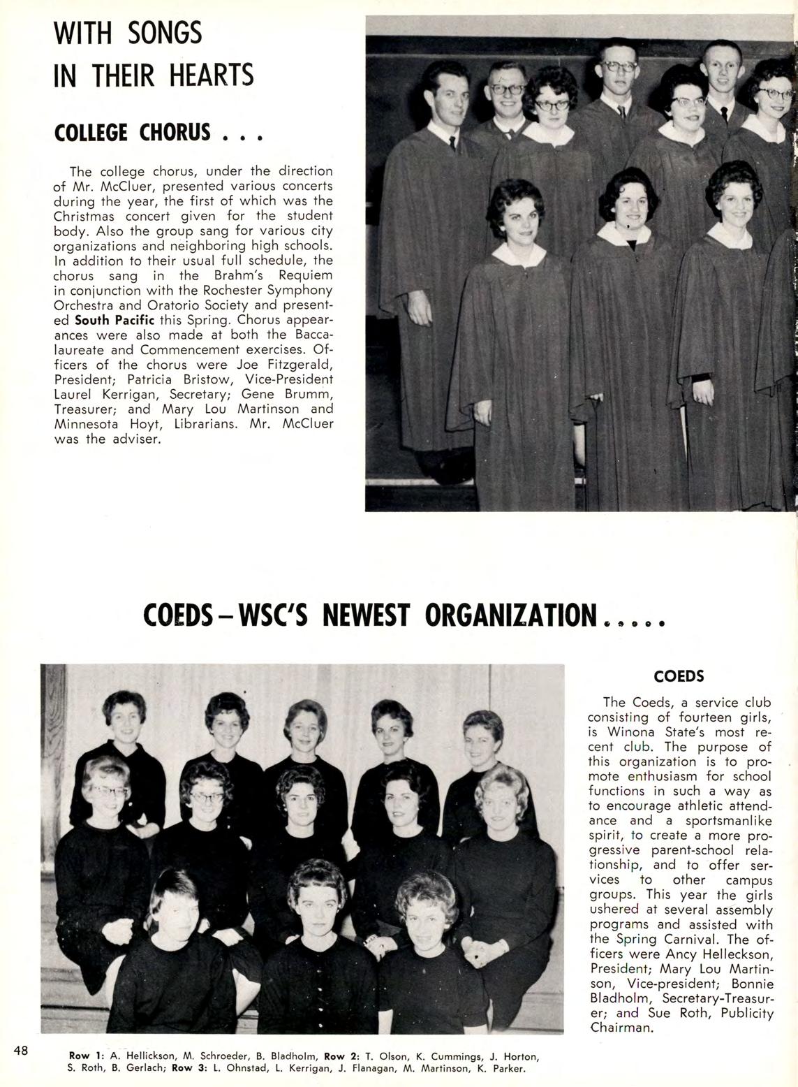The Coeds, a service club consisting of fourteen girls, is Winona State's most recent club. The purpose of this organization is to promote enthusiasm for school functions in such a way as to encourage athletic attendanee and a sportsmanlike spirit, to create a more progressive parent-school relationship, and to offer services to other campus groups. This year the girls ushered at several assembly programs and assisted with the Spring Carnival. The officers were Ancy Helleckson, President; Mary Lou Martinson. Vice-president; Bonnie Bladholm, Secretary-Treasurer; and Sue Roth, Publicity Chairman.
