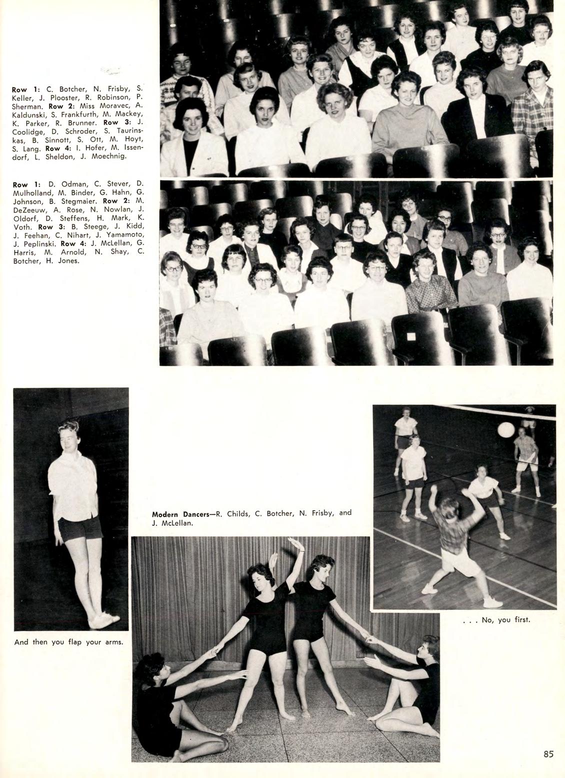 Row 1: G. Griffith, G. Grob, H. DeWald, L. Helgerson, D. AAoracco, J. Chandler. Row 2: G. Finch, W. Hull, R. Reupert, K. Farber, R. Anderson, K. Ault. Row 3: B. Tryggestad, G. Grob, I. Plitzuweit, J. McCartney, E. Solberg, D. Jaeger. Row 1: R. Ojakangas, R. Indihar, J. Emanuel, K. Larson, R. Latch, S. Kern, R. Fraser. Row 2: R. Harry, D. Kesti, C. Elliott, T. Spehar, C. Fremling, B. Baratto.The Dolphin Club is a campus organization open to all students who enjoy swimming for recreation. This year the club sponsored the Beatnik Ball and several openswim nights. Their main project is the swim show presented each spring. Officers were David Percival, President; Robert Renslo, Vice-President; Vera Miller, Secretary; Minnesota Hoyt, Treasurer; and Ruth Ann Nord, Historian. The adviser was Mr. Voorhees.