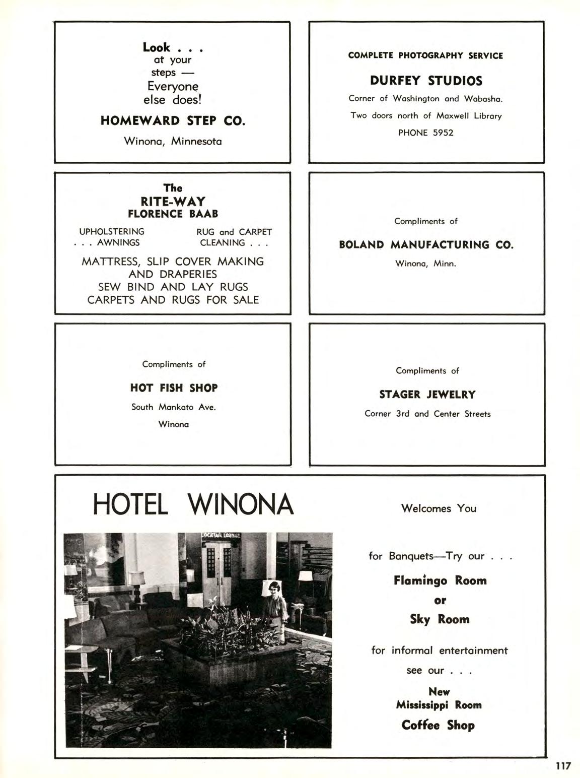 113 Again Best Wishes and Congratulations FIRST NATIONAL BANK Eat at the STEAK SHOP CALLAHAN LIQUOR STORE 119 Main Street Phone 4970 THE STAR SHOE REPAIR SHOP Cleaning, Dying and EXPERT SHOE REPAIRING ED BUCK'S CAMERA SHOP Winona's Complete Photographic Store ContemporaryGreeting Cards One Day Photofinishing 114 Center St. On Main St. Next to Post Office