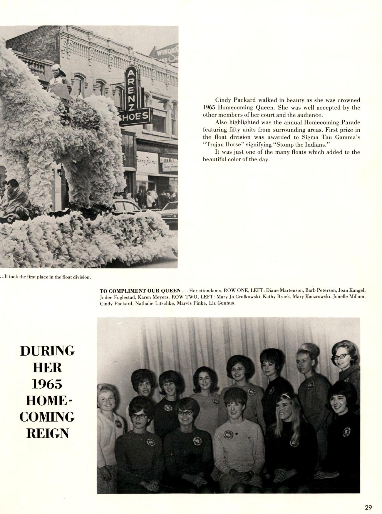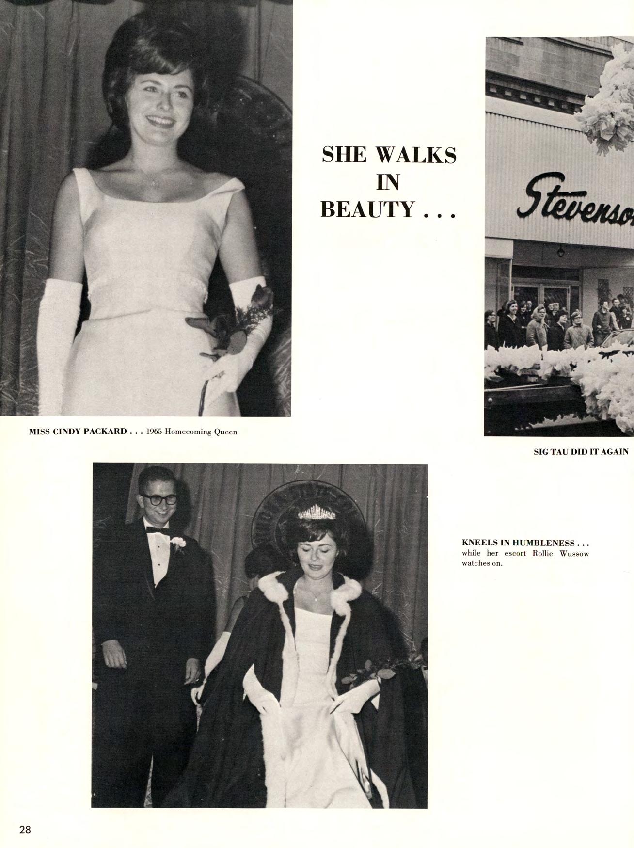 Cindy Packard walked in beauty as she was crowned 1965 Homecoming Queen. She was well aceepted by the other members of her court and the audience.
