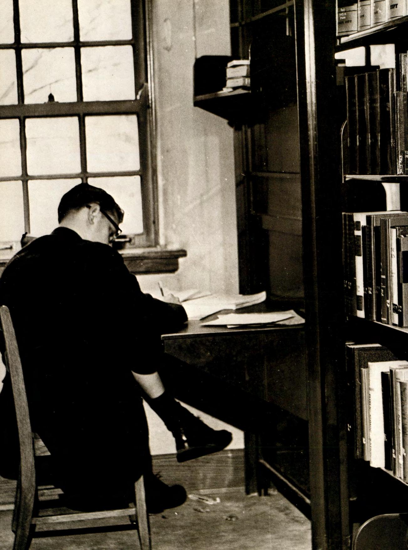 STUDIES —AN ENDLESS TASK A typical scene at Maxwell Library includes a table piled with books, students concentrating on their work, and a coed examining her finished assignment.