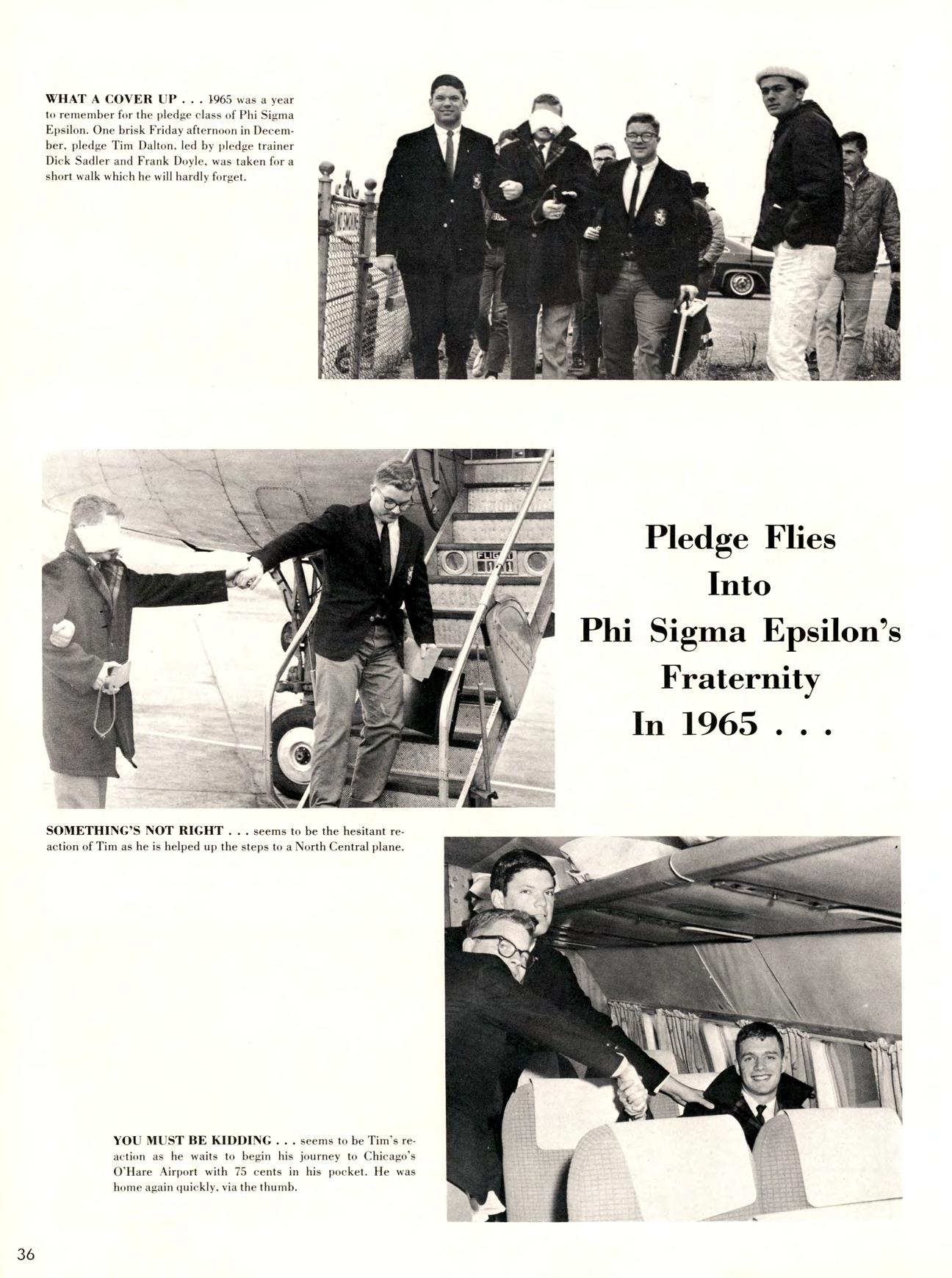 WHAT A COVER UP 1965 was a year to remember for the pledge class of Phi Sigma Epsilon. One brisk Friday afternoon in Decernher, pledge Tim Dalton, led by pledge trainer Dick Sadler and Frank Doyle, was taken for a shortwalk which he will hardly forget.