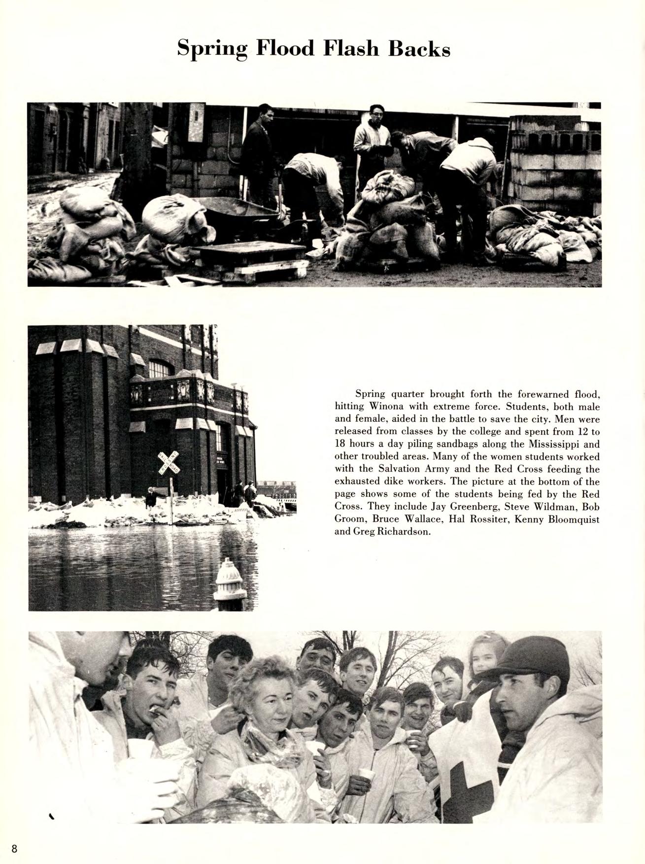 Spring quarter brought forth the forewarned flood, hitting Winona with extreme force. Students, both male and female, aided in the battle to save the city. Men were released from classes by the college and spent from 12 to 18 hours a day piling sandbags along the Mississippi and other troubled areas. Many of the women students worked with the Salvation Army and the Red Cross feeding the exhausted dike workers. The picture at the bottom of the page shows some of the students being fed by the Red Cross. They include Jay Greenberg, Steve Wildman, Bob Groom, Bruce Wallace, Hal Rossiter, Kenny Bloomquist and Greg Richardson.