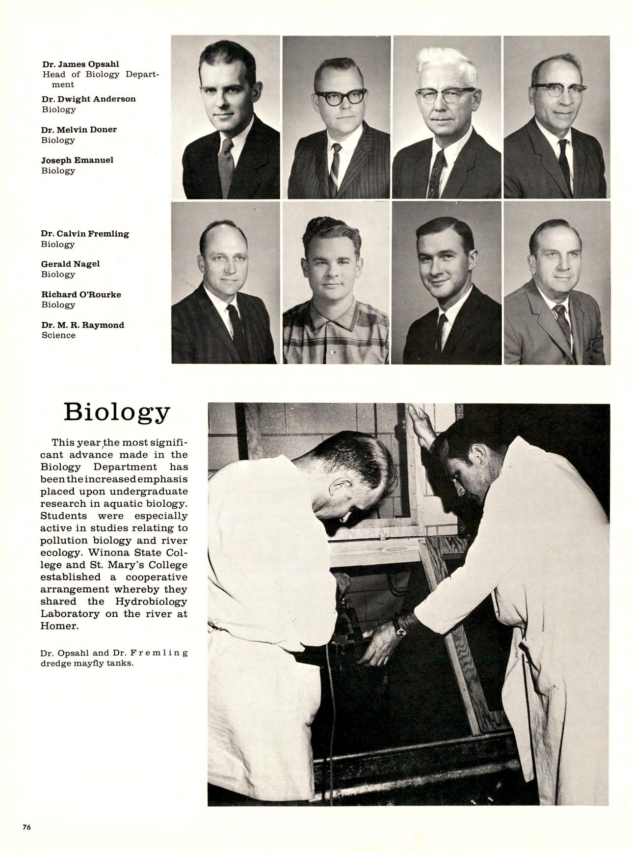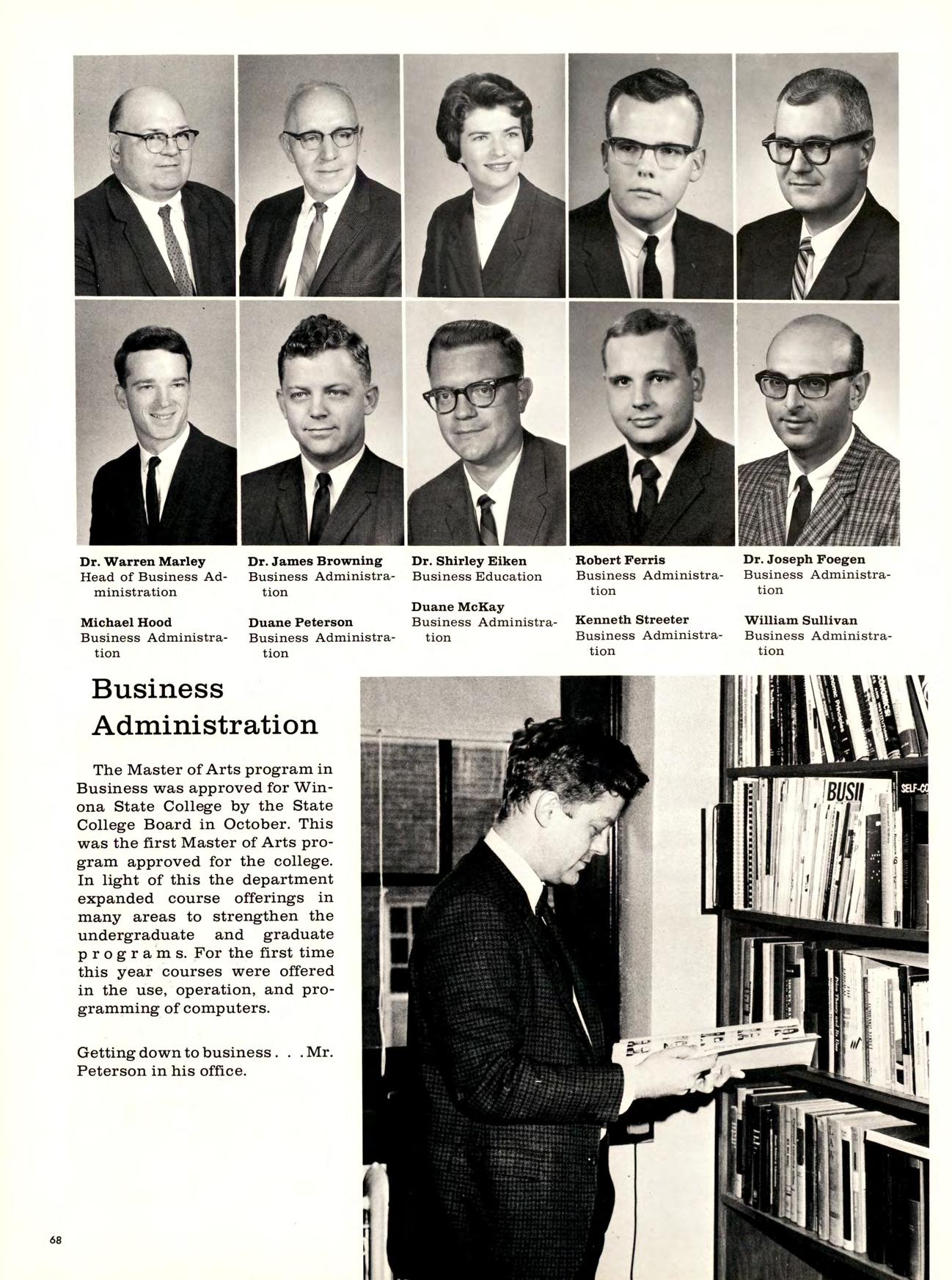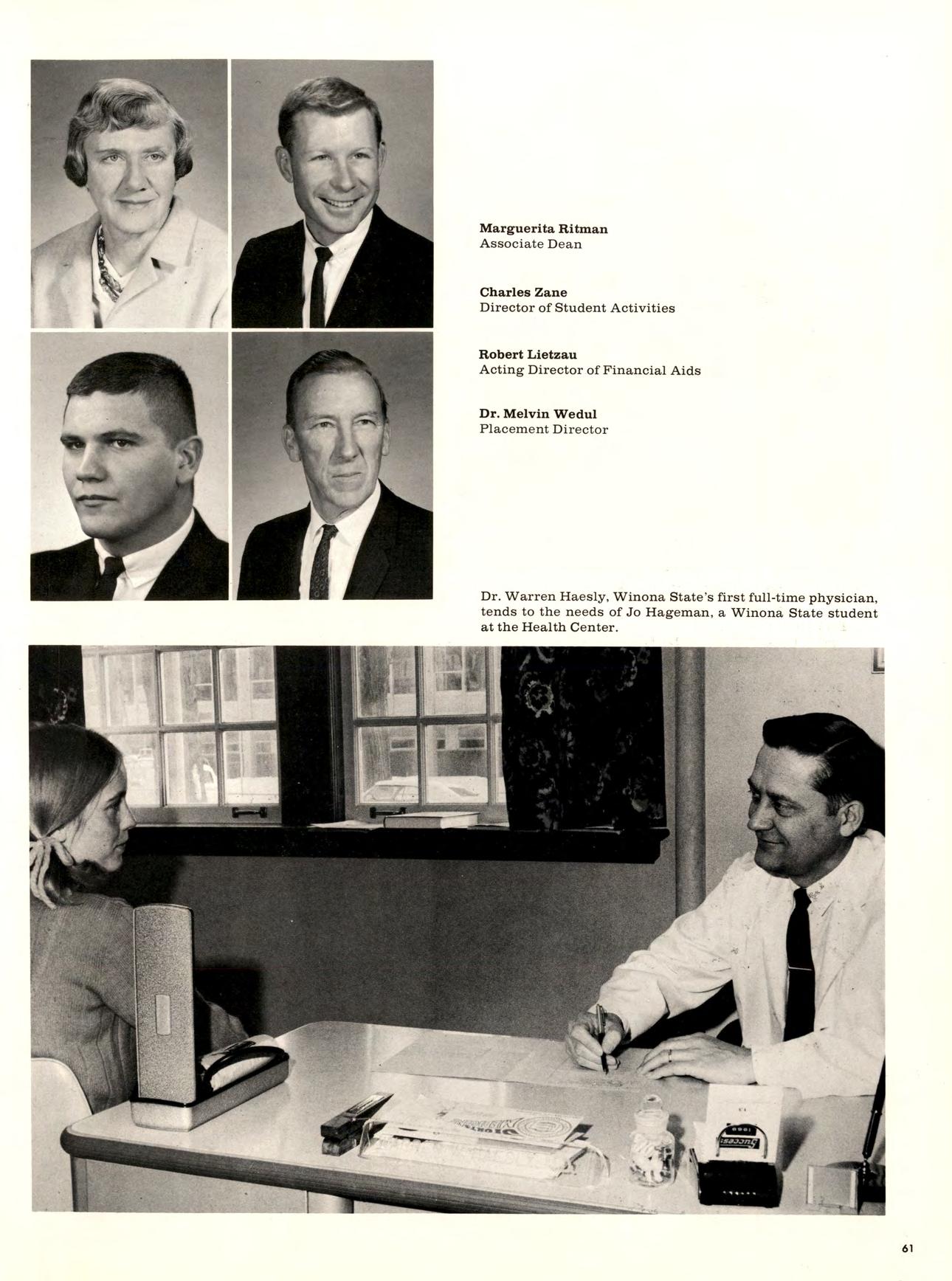 During his first 18 months in the. presidency Dr. Robert A. DuFresne has brought new life to Winona State. Its curriculum has been intensified and broadened; its physical plant expanded; its faculty enlarged and elevated in attainment, and its students increased in numbers. More importantly, perhaps, there has been a noticeable increase in the vitality of the institution. Both faculty and students are more involved in the decision-making process and the college, in its second century of quality education, is enlarging its sphere of influence. For these achievements, both leadership and appreciation of the talentsof others have been required of the president. These others include the three vice-presidents and their staffs. These offices. Administrative Affairs, Academic Affairs, and Student Affairs, were newly formed last fall to clarify responsibility and facilitate leadership and communication.